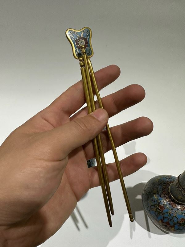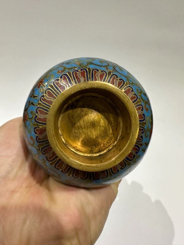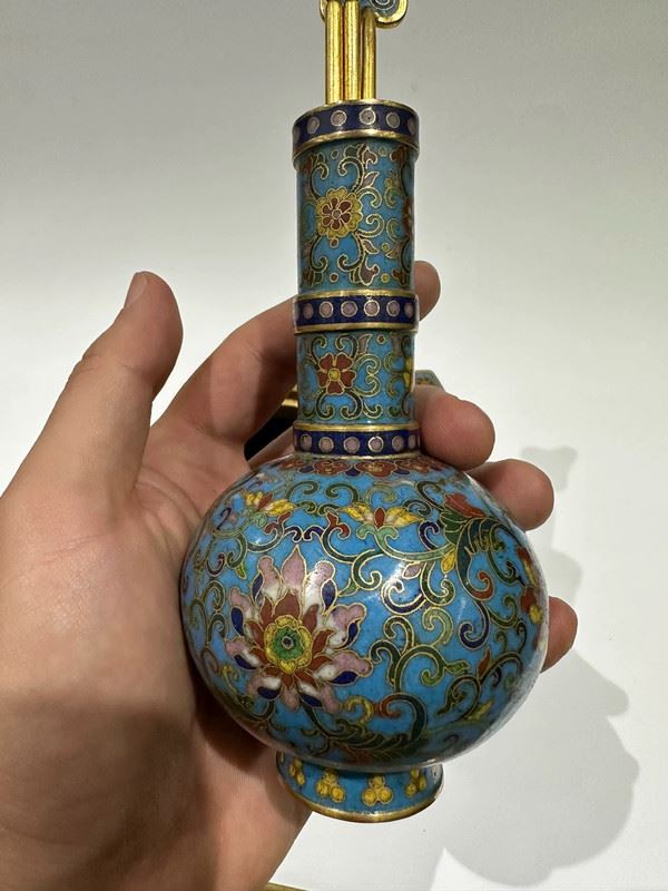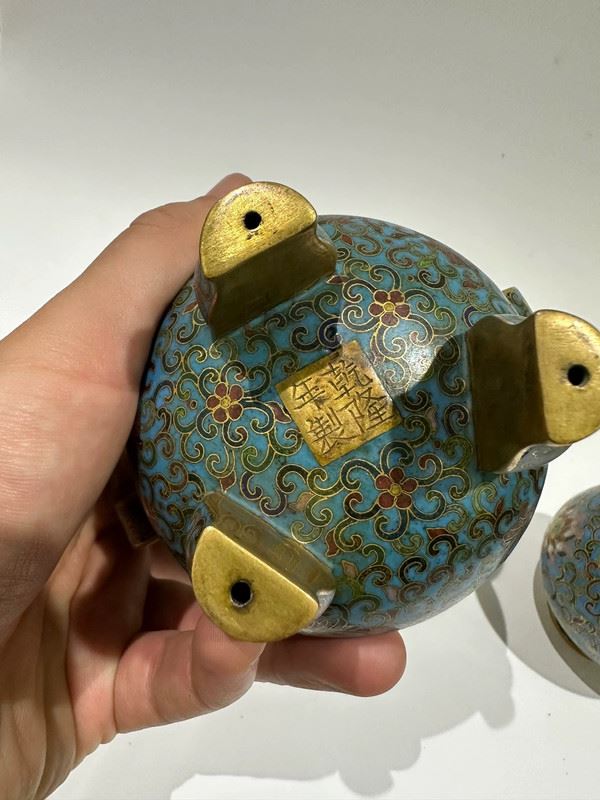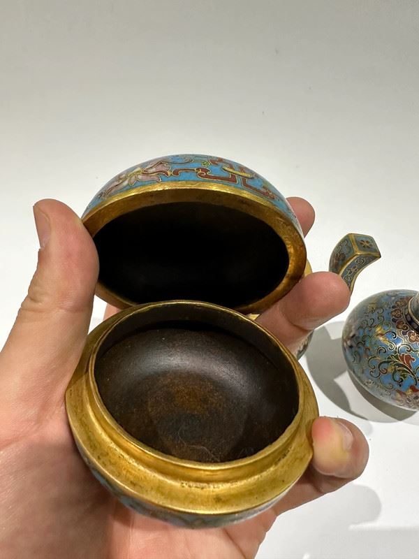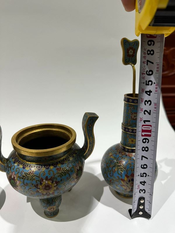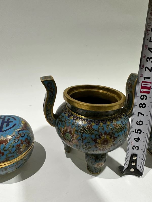 This set of cloisonné enamel pieces comprises a censer, a vase, and a box, all crafted on copper bodies. The light blue enamel ground is decorated with scrolling lotus motifs and auspicious patterns in vivid, harmonious colors. The censer features twin handles in a tripod form, exuding stability; the vase has a slender neck and is adorned with ritual implements, symbolizing elegance; the round box is topped with a “Shou” character, representing longevity. With refined craftsmanship and balanced forms, this set serves both as ritual implements and as decorative treasures, exemplifying the beauty and sophistication of traditional cloisonné enamel.