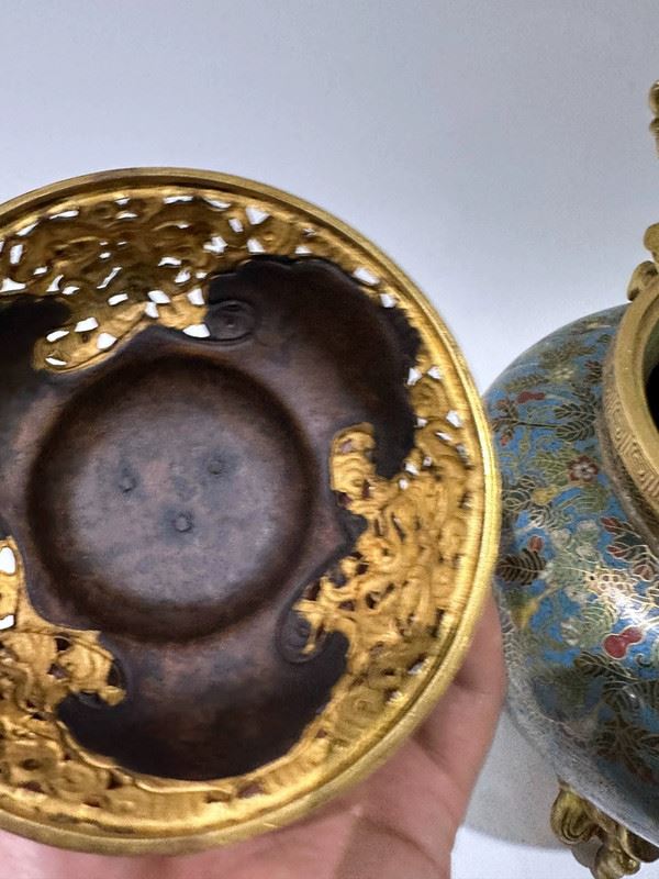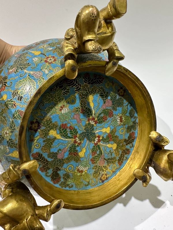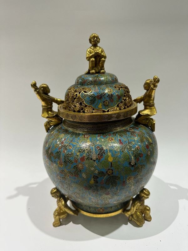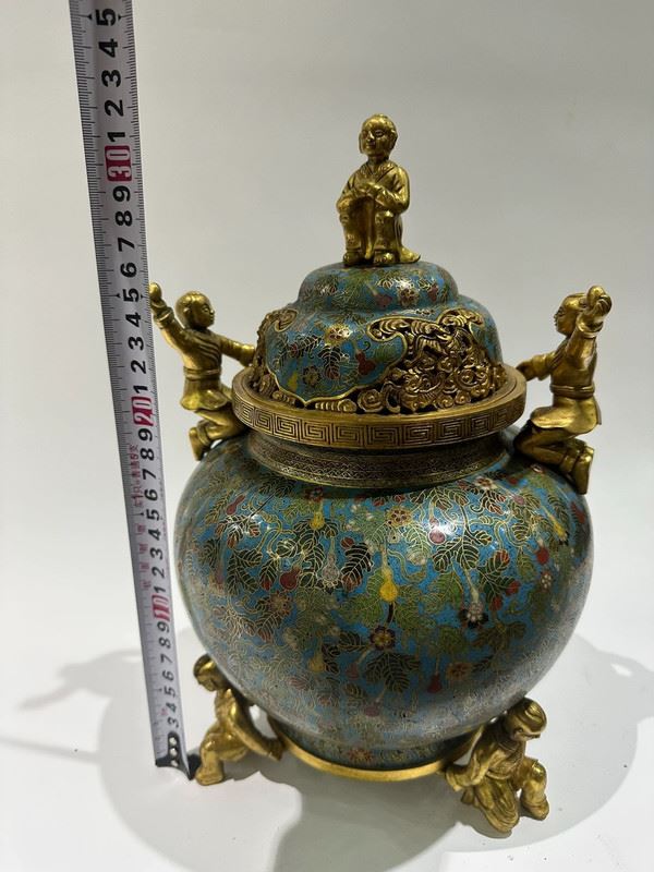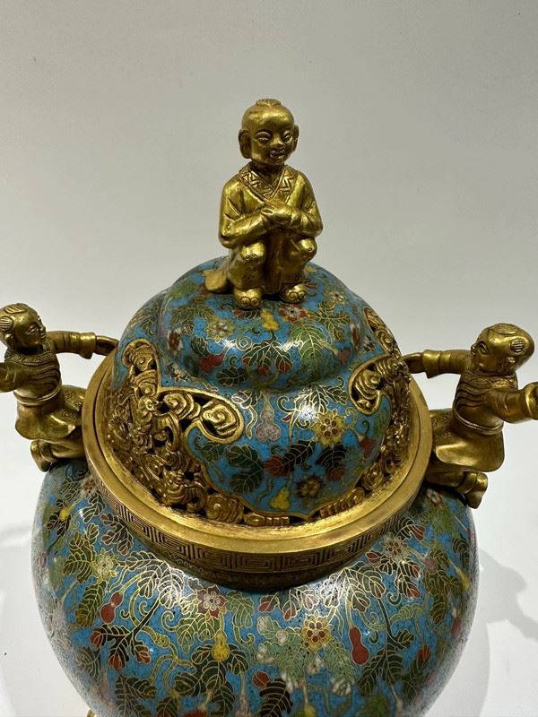 This censer is crafted from gilt bronze and decorated with cloisonné enamel, featuring a blue ground with scrolling floral and lingzhi patterns. The cover is surmounted by a seated boy figure, while additional boys adorn the handles and form the tripod feet, symbolizing blessings, peace, and auspiciousness. The playful yet auspicious design is enhanced by the harmonious contrast of gold and enamel, highlighting exquisite craftsmanship. With its lively imagery and refined artistry, this censer serves both as a functional incense vessel and a highly collectible work of cloisonné enamel.