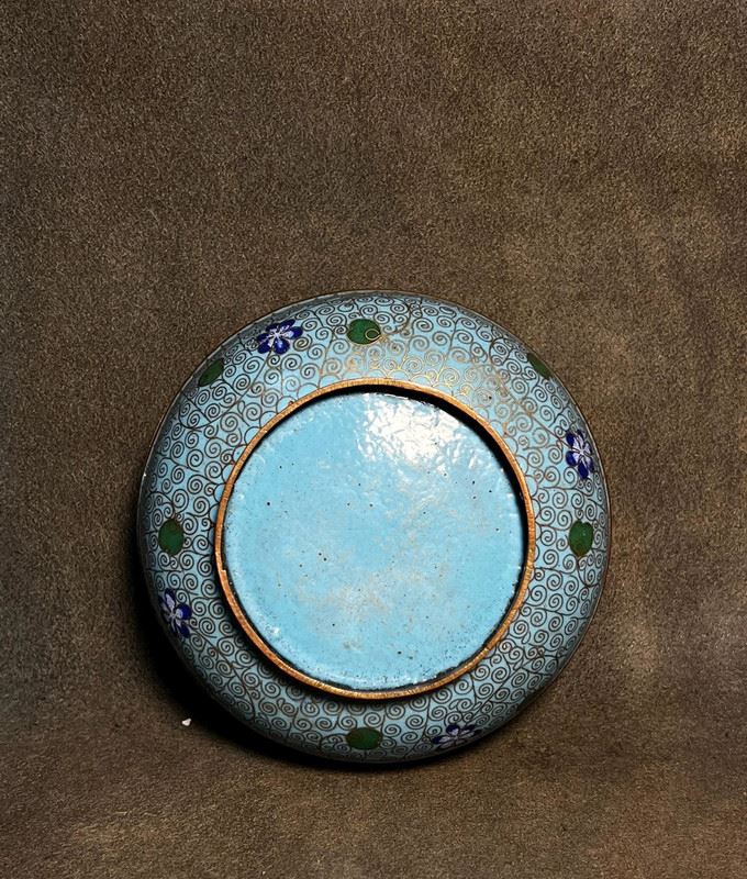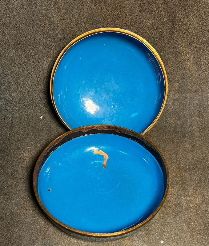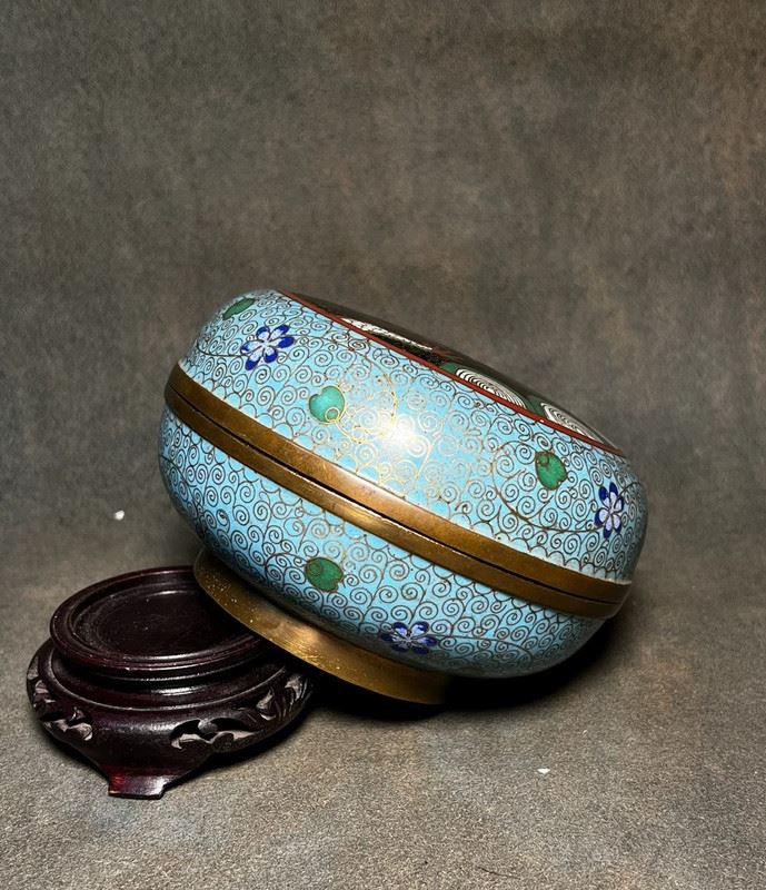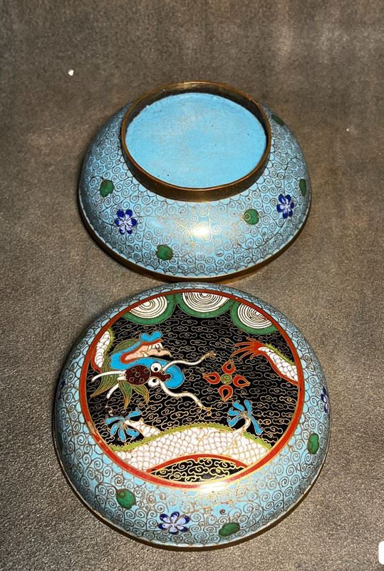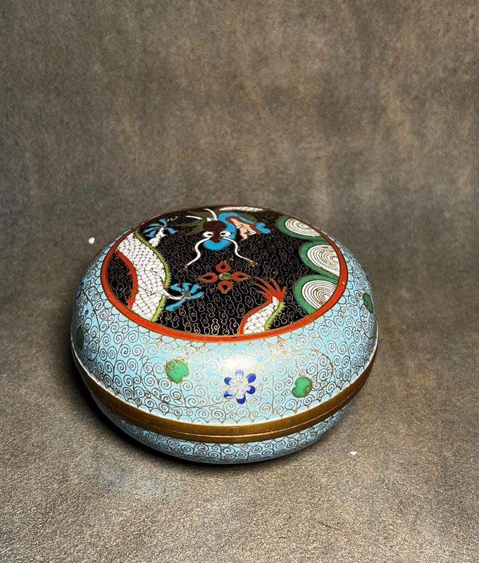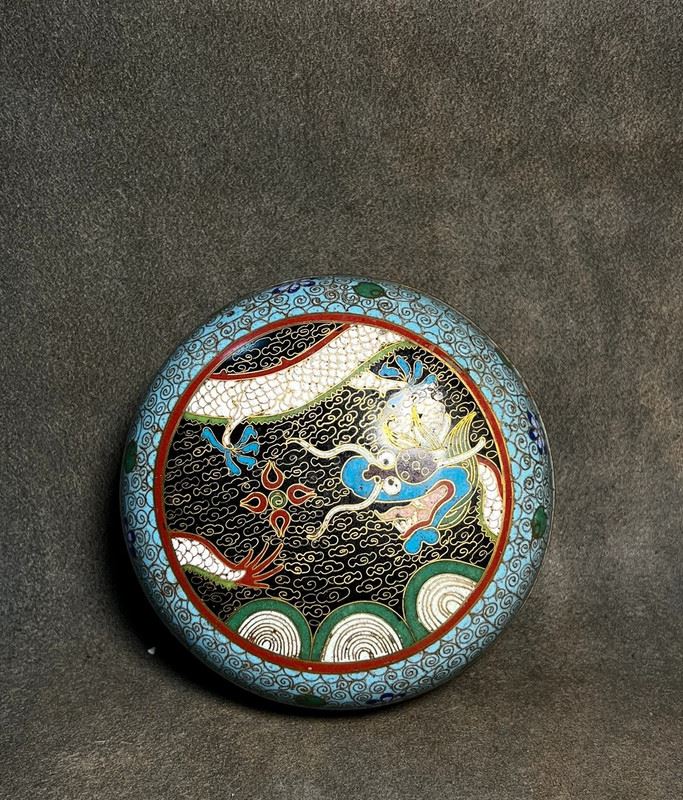 This circular box is crafted with a copper body and decorated in cloisonné enamel. The surface features a pale blue ground with cloud and floral scroll motifs, while the lid is centered with a medallion of a white dragon against a black ground, surrounded by auspicious clouds and waves. With its rounded form and refined craftsmanship, the piece symbolizes protection and prosperity, serving as both a functional container and a collectible work of art.