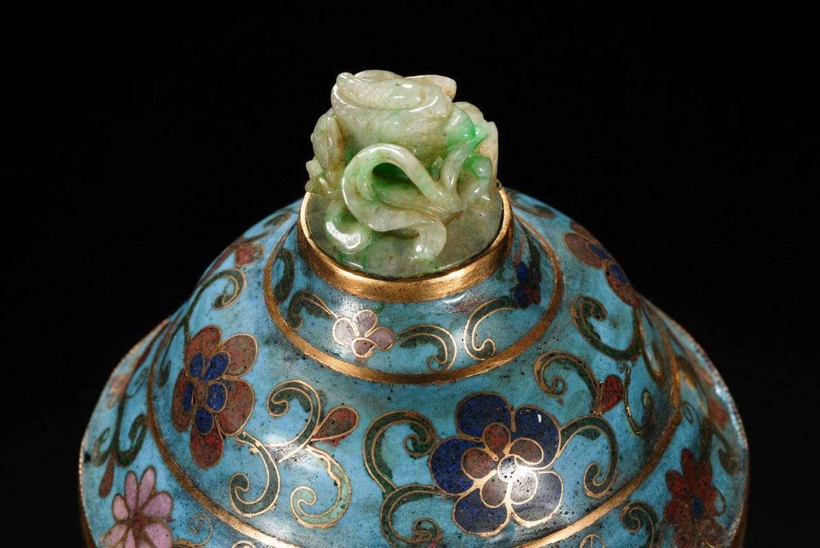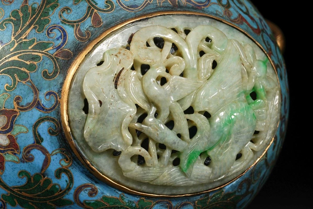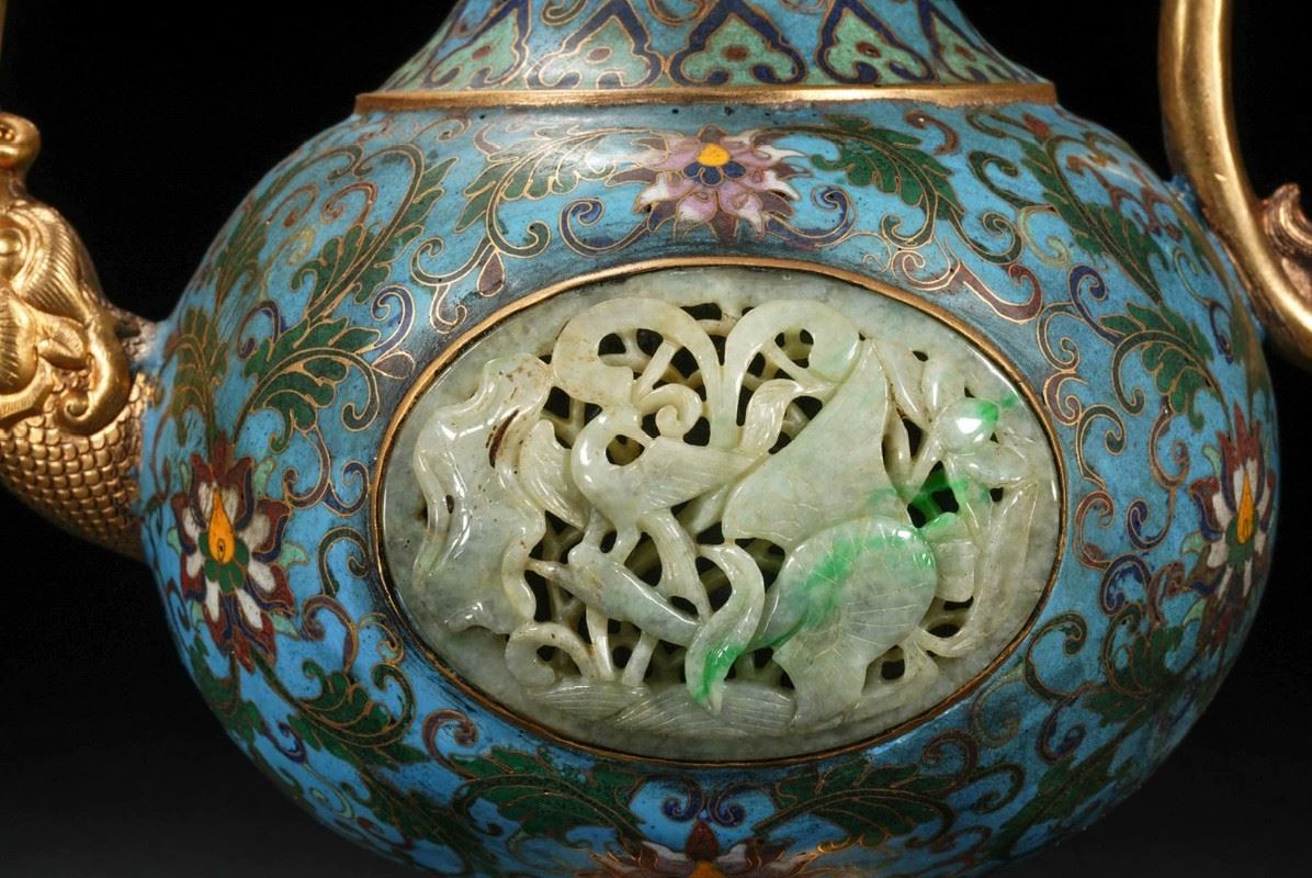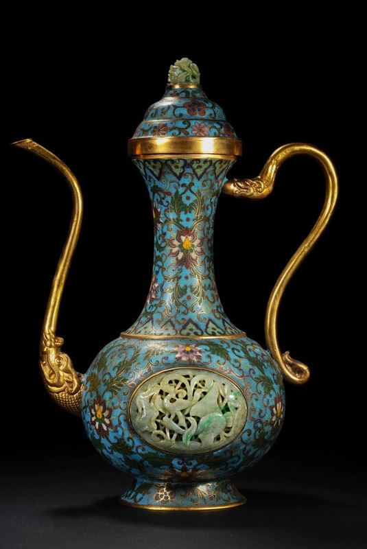 This cloisonné enamel ewer with jade inlay beautifully combines the exquisite craftsmanship of cloisonné with the precious decoration of Hetian jade, showcasing extraordinary artisanal skill. The body of the ewer is adorned with intricate floral and animal patterns in vibrant colors, shining with brilliance. The golden spout and handle are delicately sculpted, adding an elegant touch to the piece. The jade inlay on the body highlights the perfect fusion of traditional craftsmanship and precious materials, giving the piece an antique and noble atmosphere. This work is not only a functional object but also a precious collectible that demonstrates the richness of traditional Chinese art and culture.