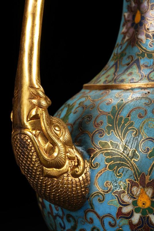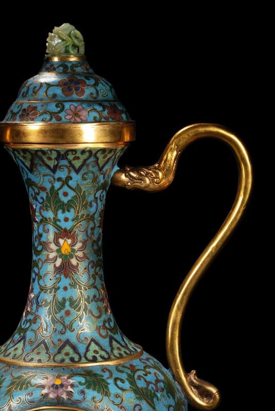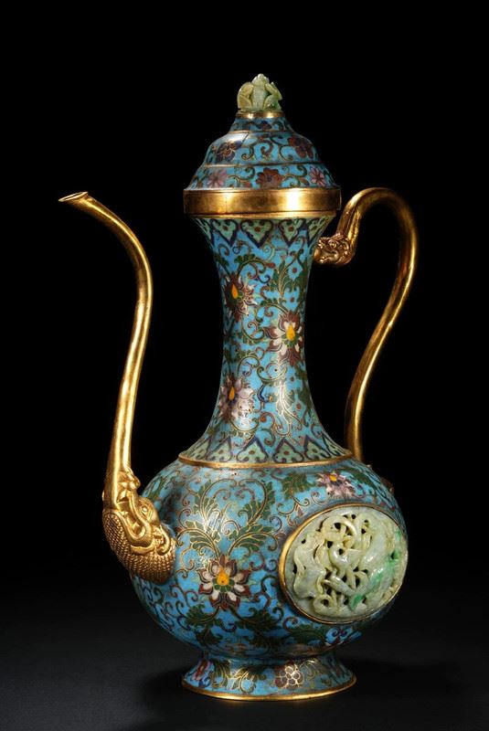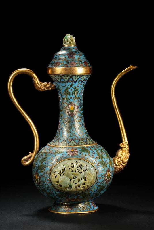This cloisonné enamel ewer with jade inlay beautifully combines the exquisite craftsmanship of cloisonné with the precious decoration of Hetian jade, showcasing extraordinary artisanal skill. The body of the ewer is adorned with intricate floral and animal patterns in vibrant colors, shining with brilliance. The golden spout and handle are delicately sculpted, adding an elegant touch to the piece. The jade inlay on the body highlights the perfect fusion of traditional craftsmanship and precious materials, giving the piece an antique and noble atmosphere. This work is not only a functional object but also a precious collectible that demonstrates the richness of traditional Chinese art and culture.