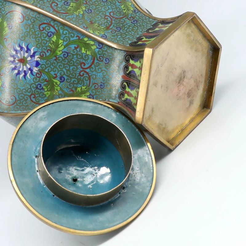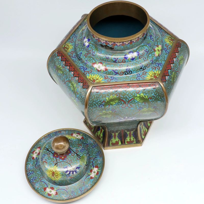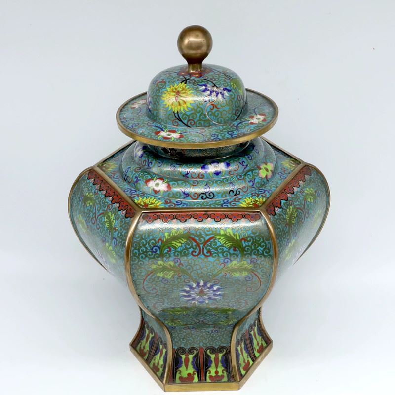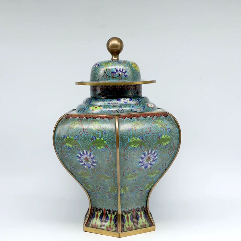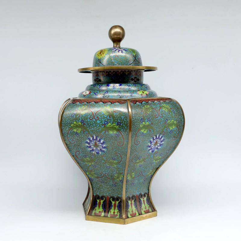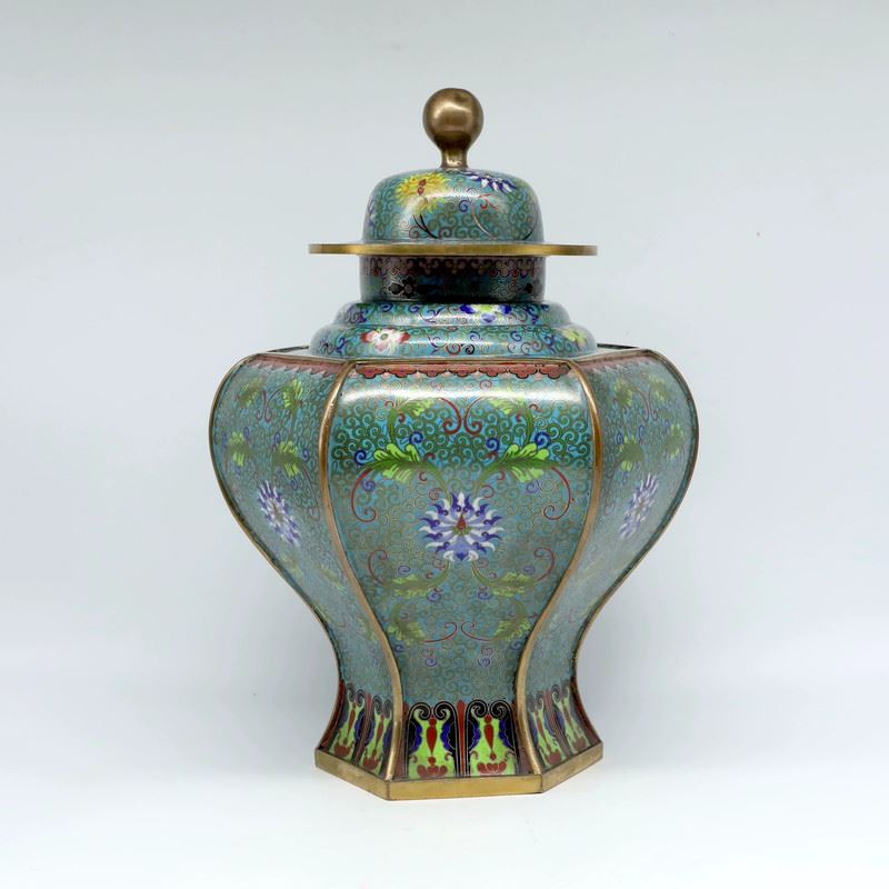 This cloisonné enamel floral lidded jar features exquisite copper-based cloisonné craftsmanship, with delicate floral patterns on the body that showcase vibrant and harmonious colors. The golden accents on the lid and base complement the floral design, adding a touch of grandeur. Its elegant shape and fine craftsmanship make it a functional and collectible art piece.