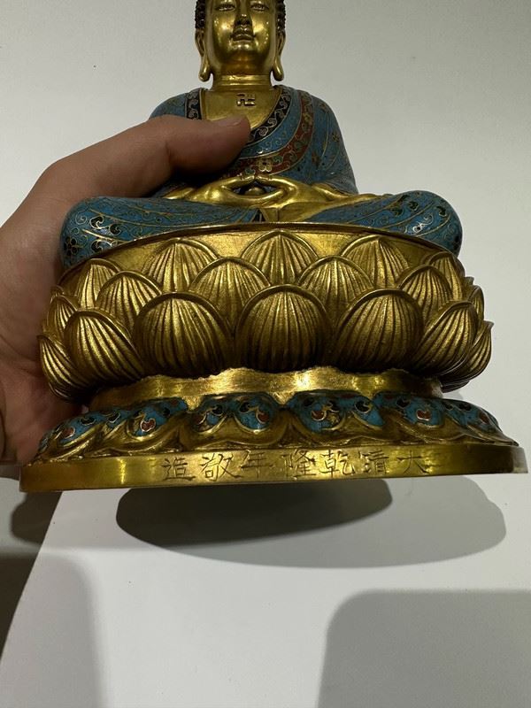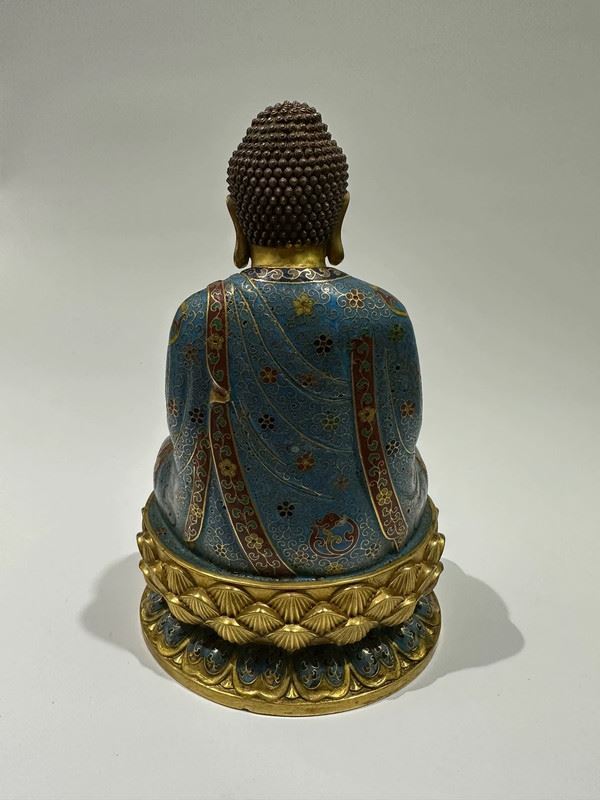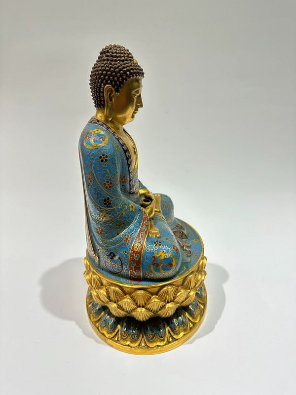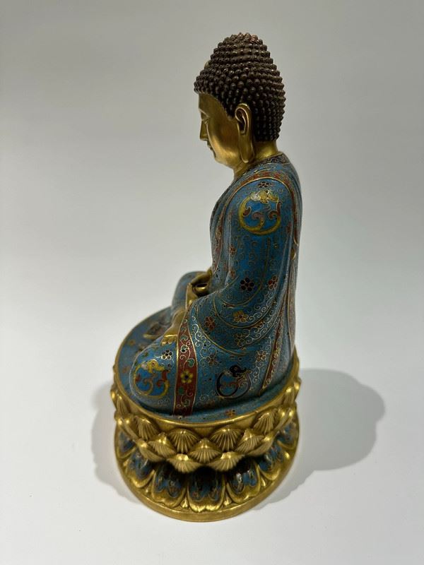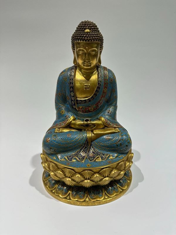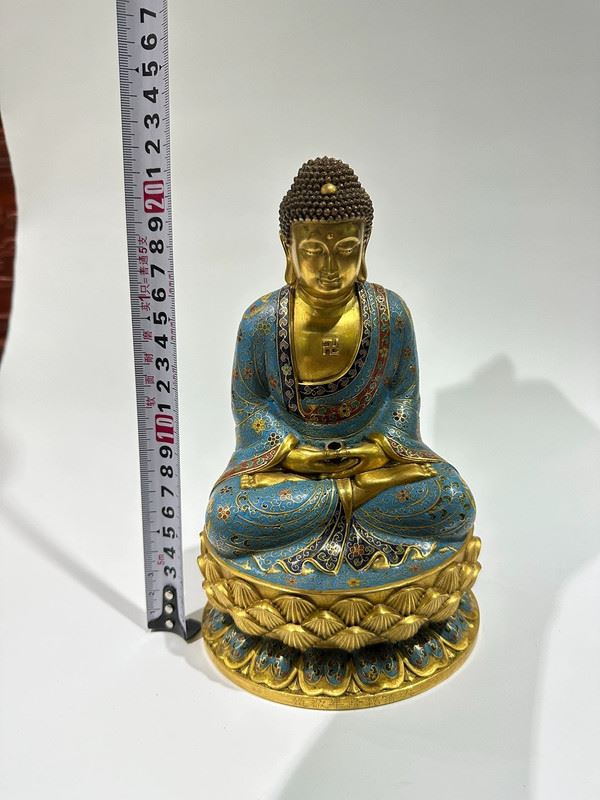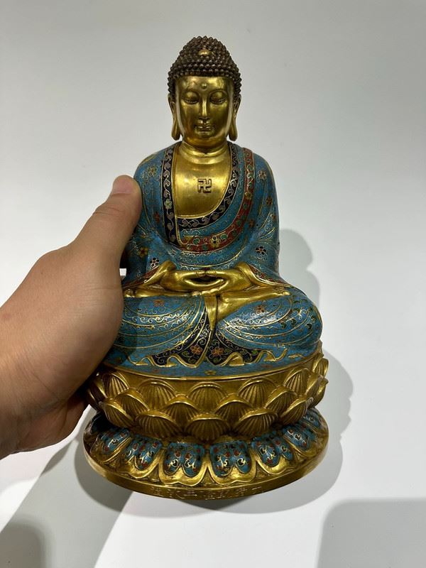 This Guanyin Buddha statue is crafted from gilt bronze with exquisite cloisonné enamel decoration. The figure is seated on a lotus pedestal, radiating serenity and compassion with a dignified and peaceful expression. The robes are adorned with intricate lotus scrolls in vibrant blue enamel with gilt highlights, showcasing meticulous craftsmanship. The double-layered lotus base symbolizes purity and auspiciousness, while the overall form conveys both elegance and solemnity. Combining Buddhist devotion with the brilliance of cloisonné artistry, this statue is a masterpiece of spiritual and artistic value, ideal for worship and collection.