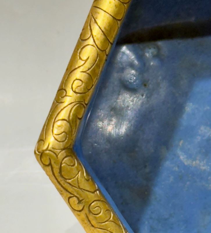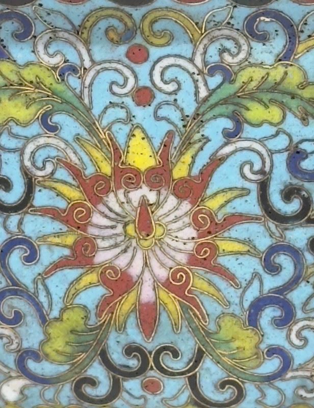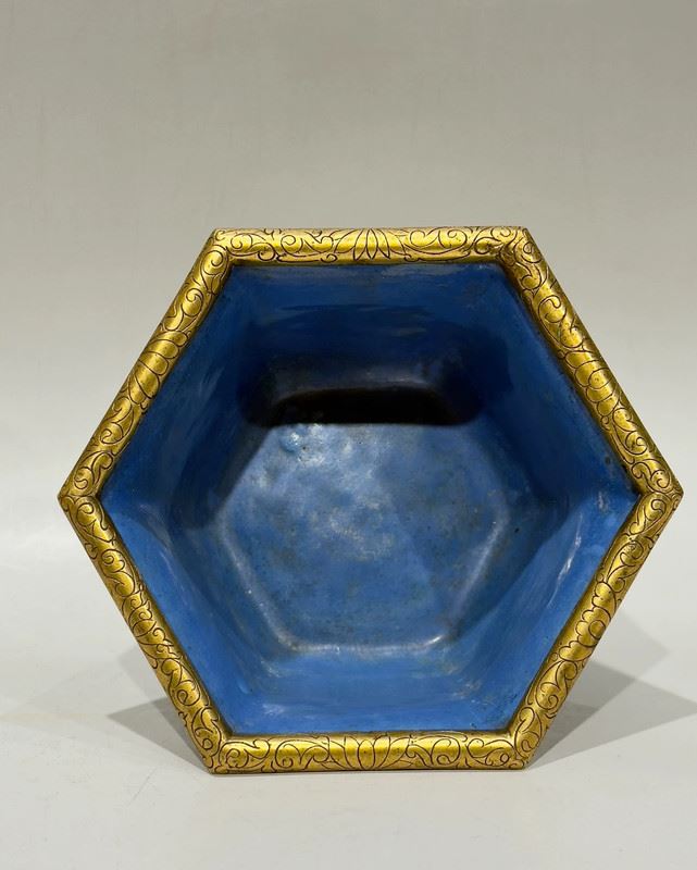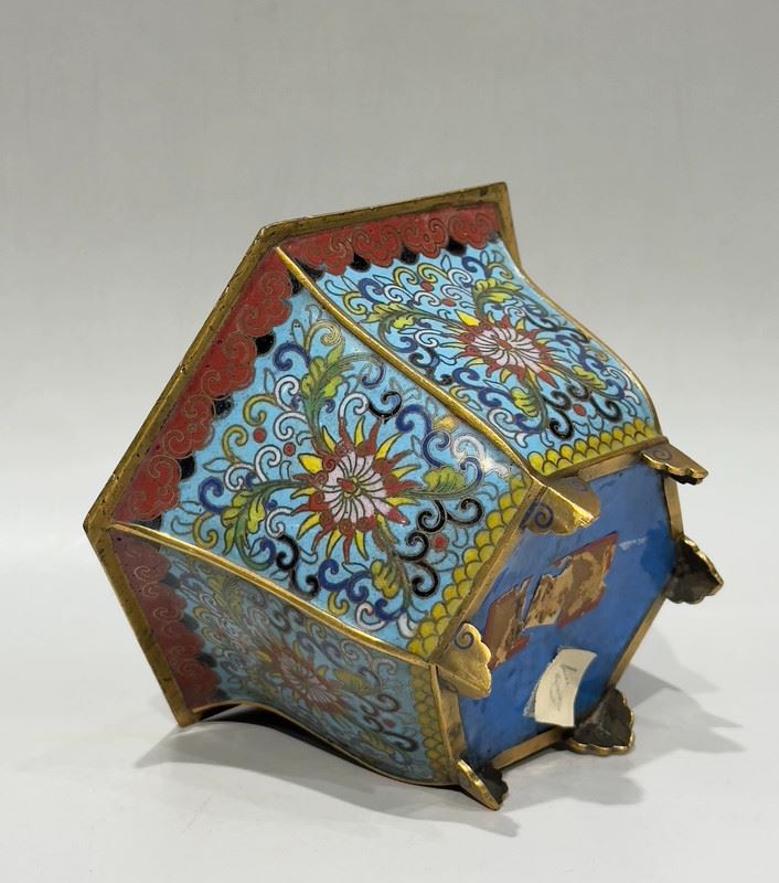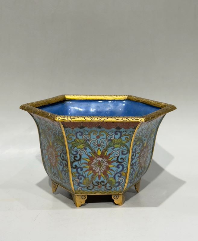 This planter features a hexagonal form with gilded copper body and raised on four feet. The exterior is decorated with scrolling lotus motifs in vivid enamels, while the interior is finished in a bright sky-blue glaze, creating a striking contrast. The six-sided shape is relatively rare among cloisonné pieces, enhancing its uniqueness. With its exquisite craftsmanship and balanced proportions, this piece is both a fine decorative item and a collectible.