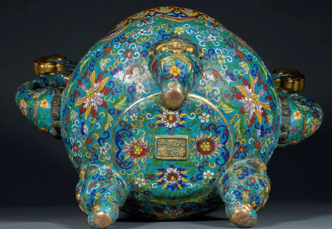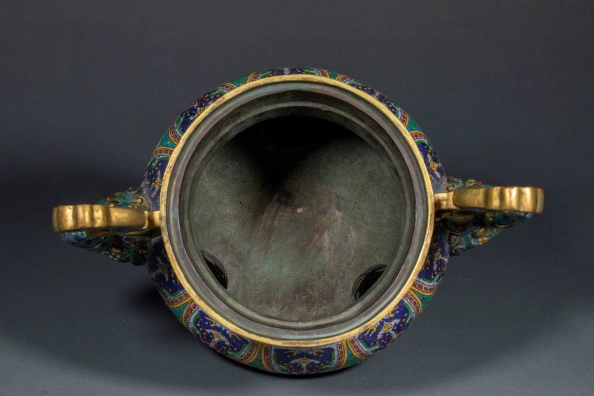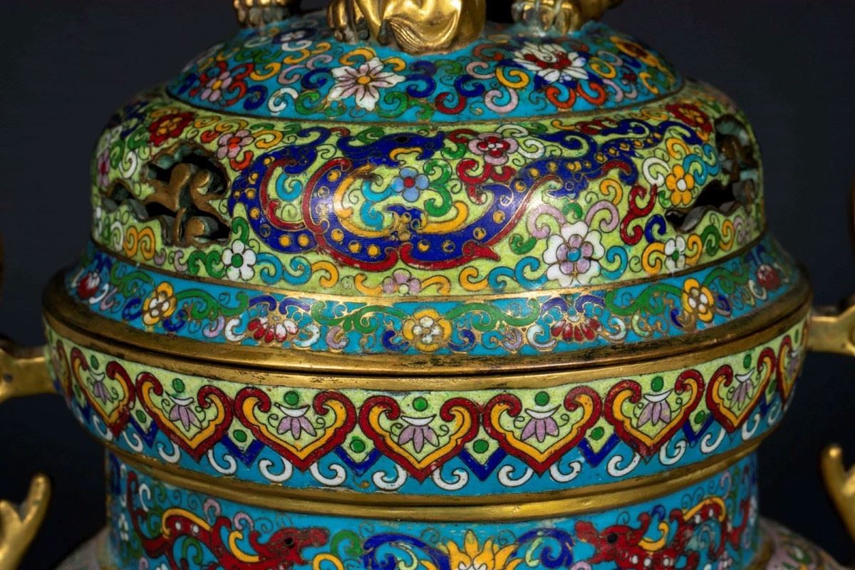 This cloisonné enamel incense burner features exquisite craftsmanship, with vibrant colors and unique design. The body of the burner is finely carved, showcasing elegant traditional patterns and rich layers of color that offer a luxurious visual experience. The lid is adorned with a golden lion, adding a touch of majesty and opulence to the piece. The double handles on the body provide stability and further enhance its distinctiveness. This incense burner is not only a functional piece but also a work of art, perfect for both use and collection.