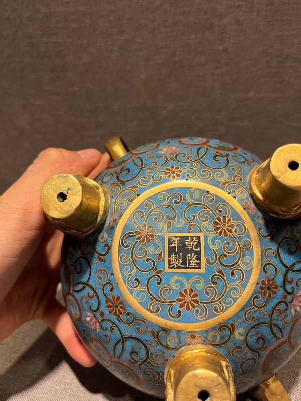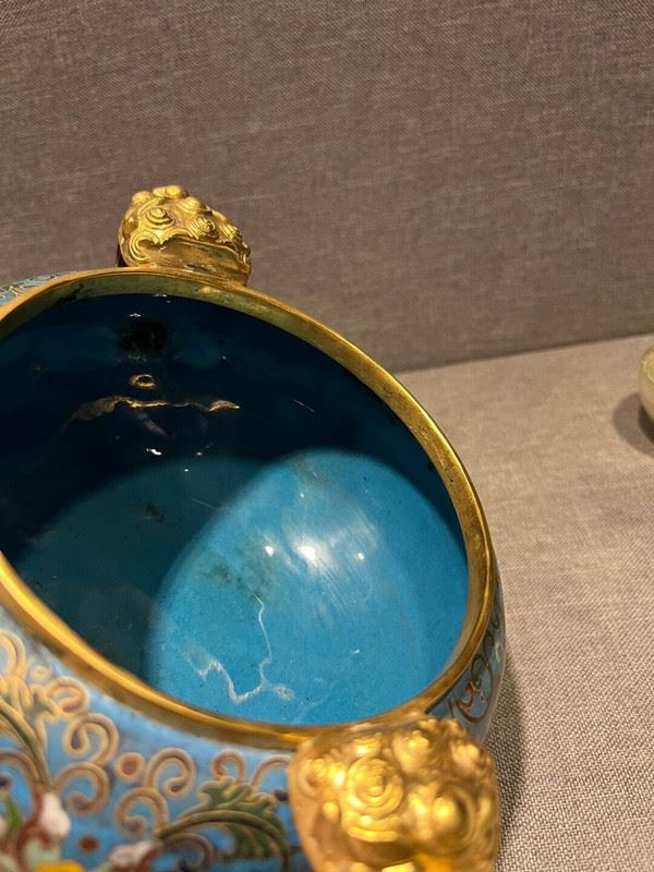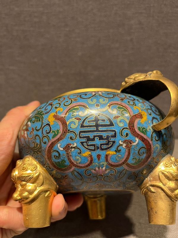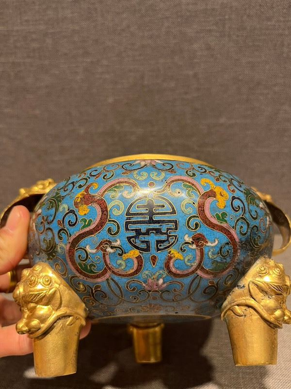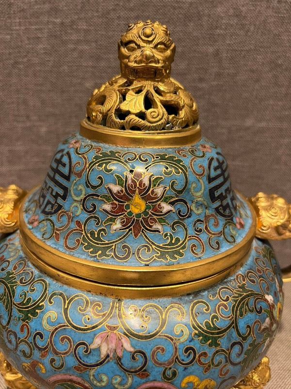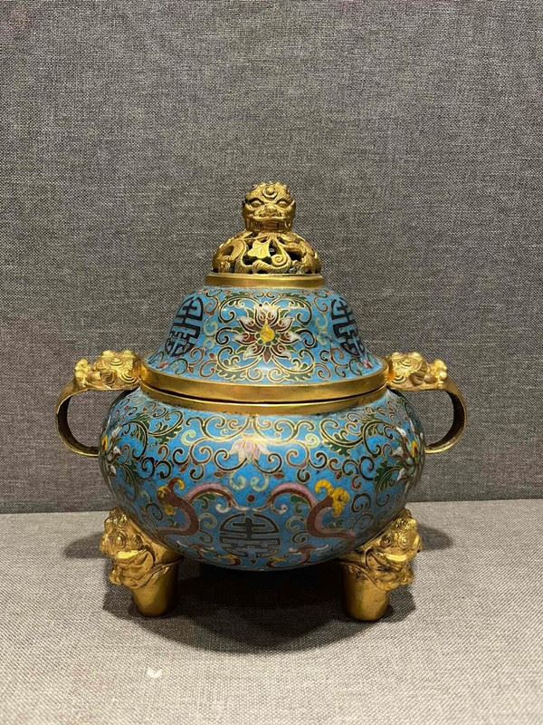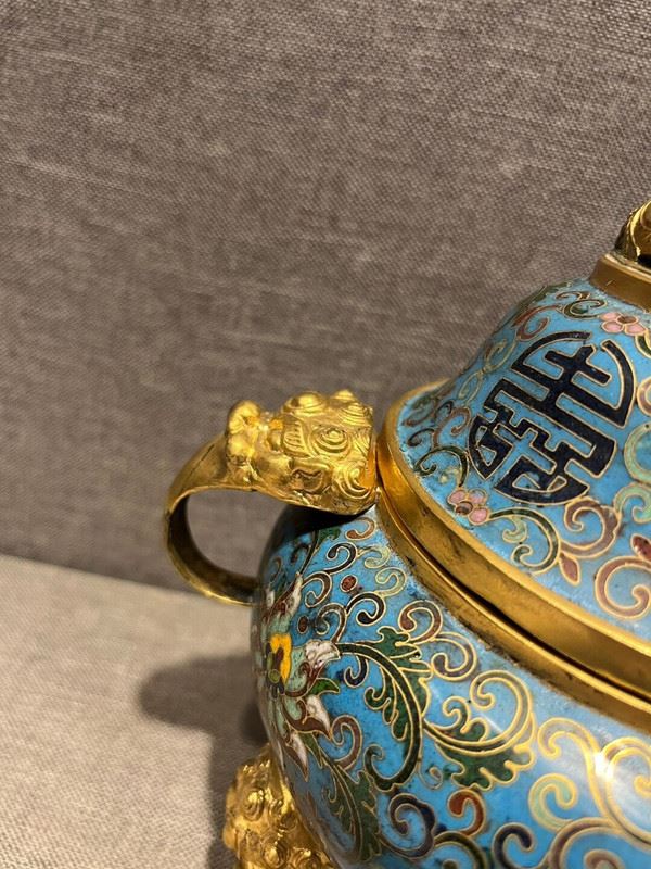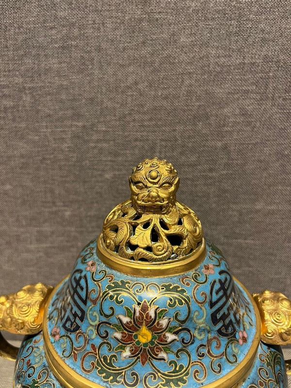 This cloisonné enamel incense burner is crafted with exquisite artistry, featuring vibrant colors and intricate details. The design is elegant, with the body of the vessel showcasing an elegant blue color adorned with complex floral and dragon patterns, reflecting high craftsmanship. The double handles and golden beast face motifs enhance its regal and luxurious appearance. The golden lion at the top further adds a sense of majesty to the piece. This incense burner is a rare art treasure, both in terms of visual appeal and historical-cultural value.