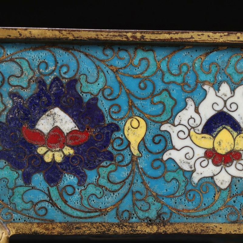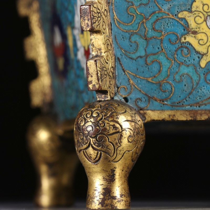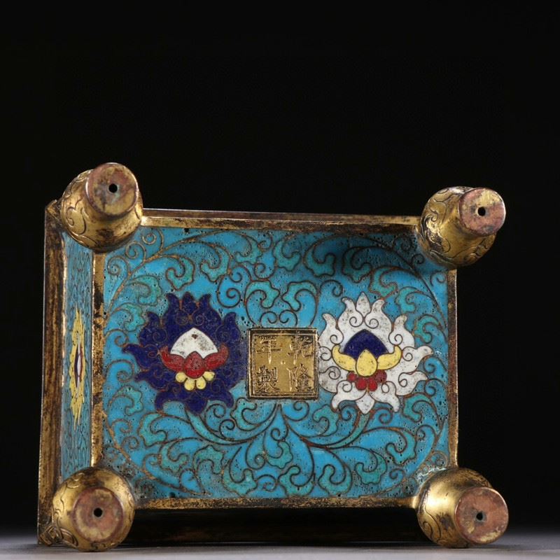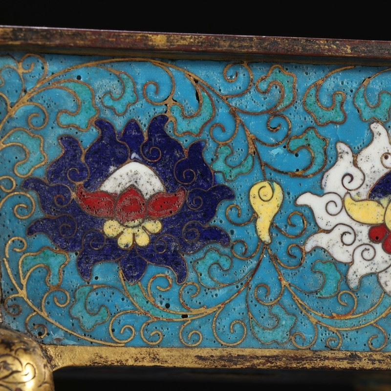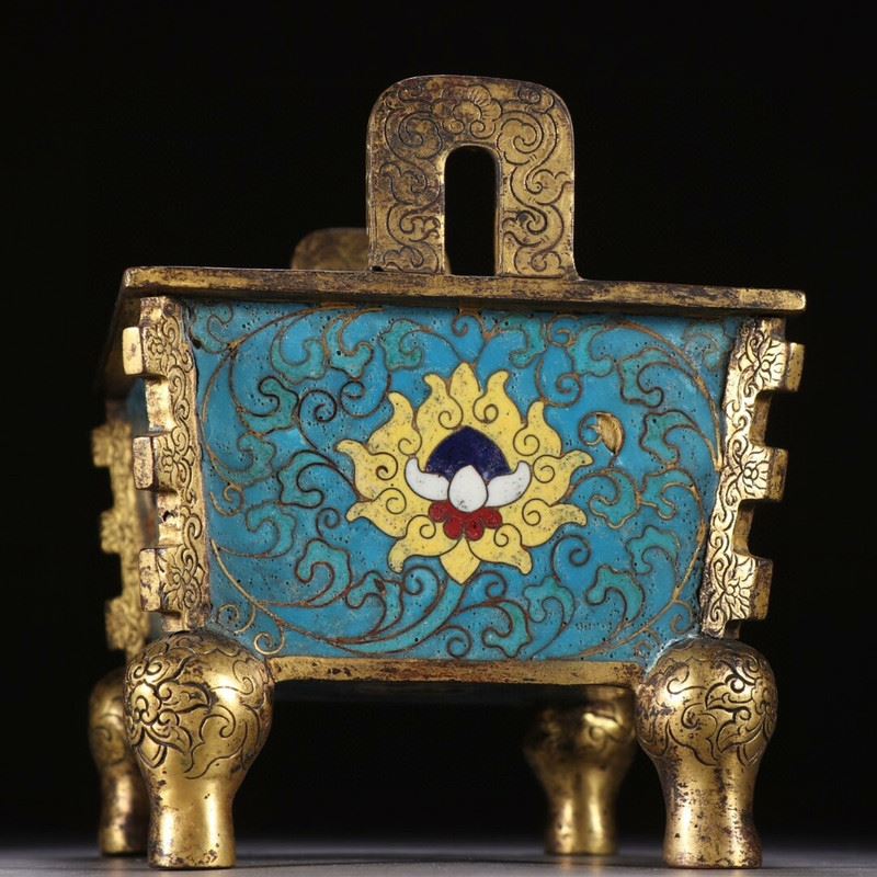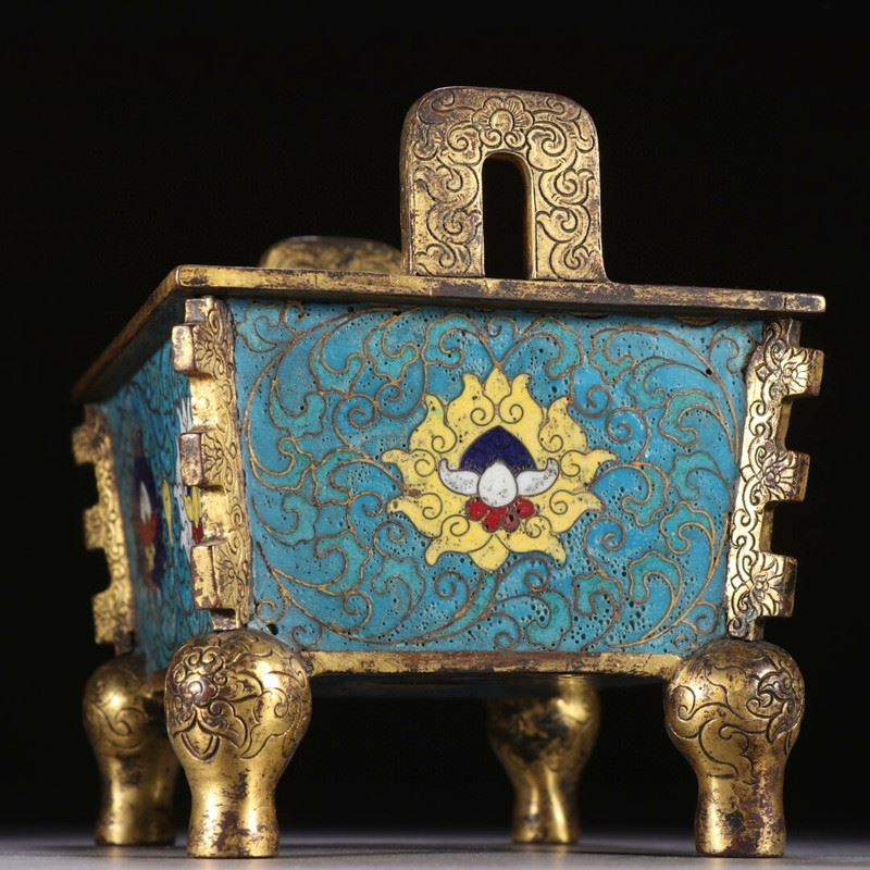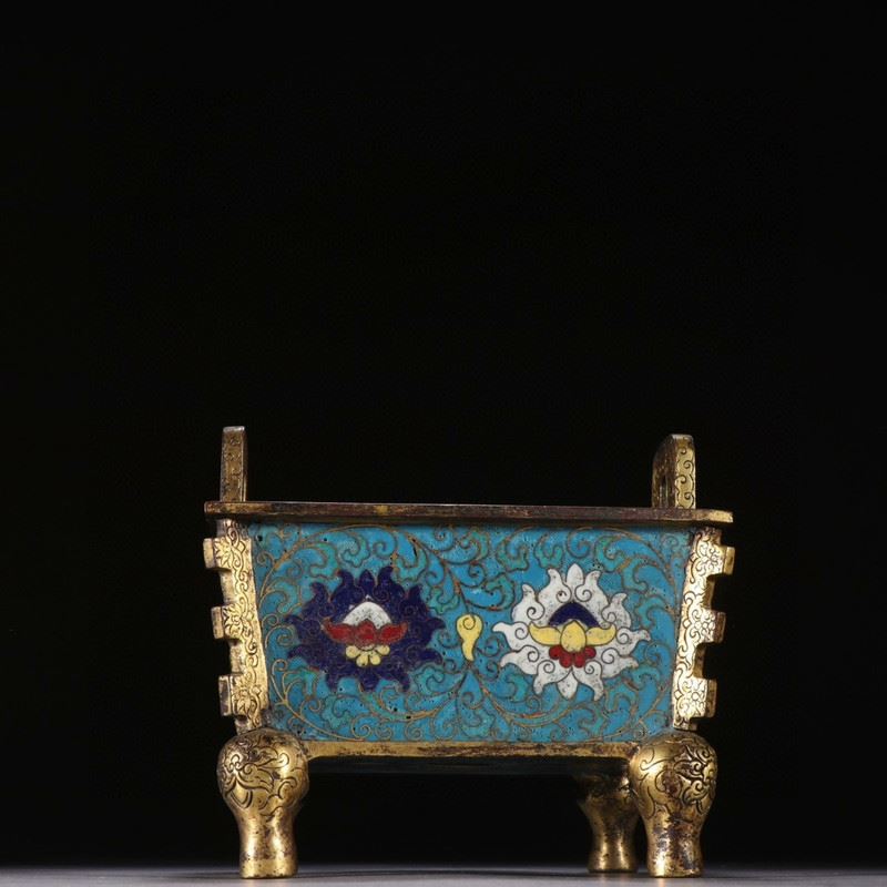 A finely crafted cloisonné enamel incense burner with intricate gold-gilded feet, featuring vibrant blue backgrounds and elegant entwining floral patterns. The central decorations include two symbolic floral motifs, each enhanced by subtle details in red, white, and gold.