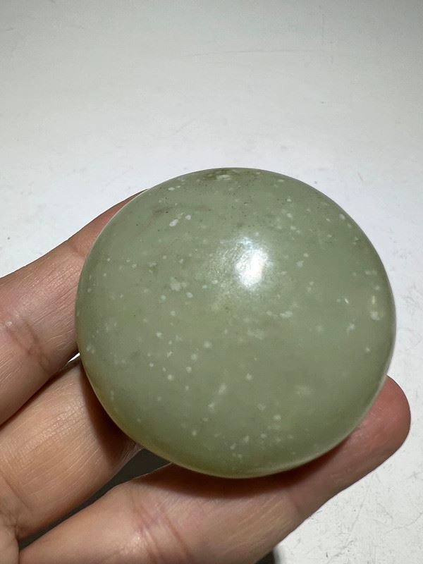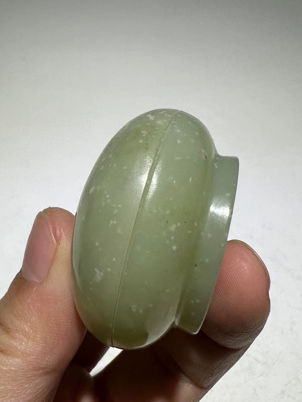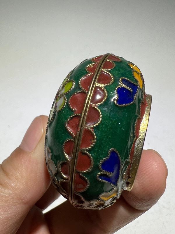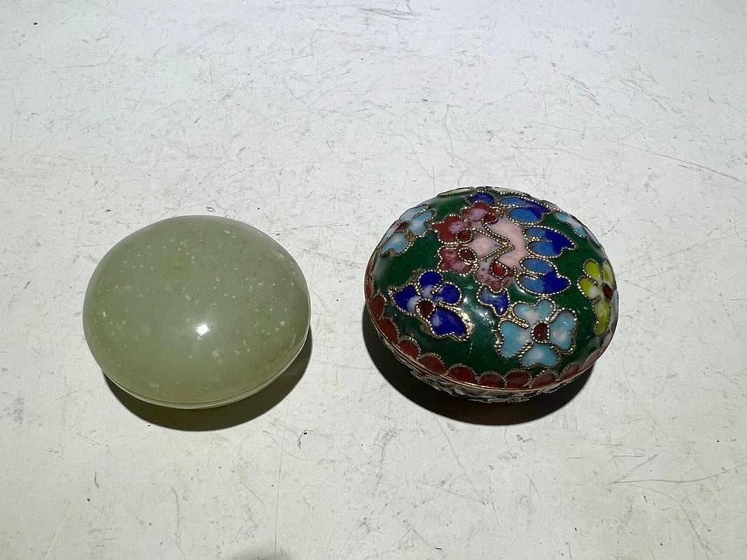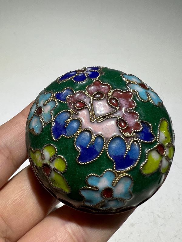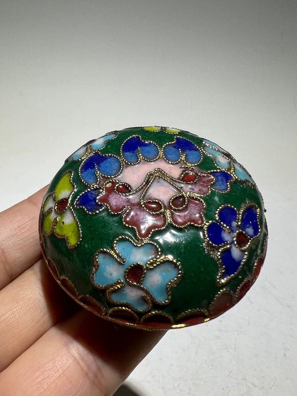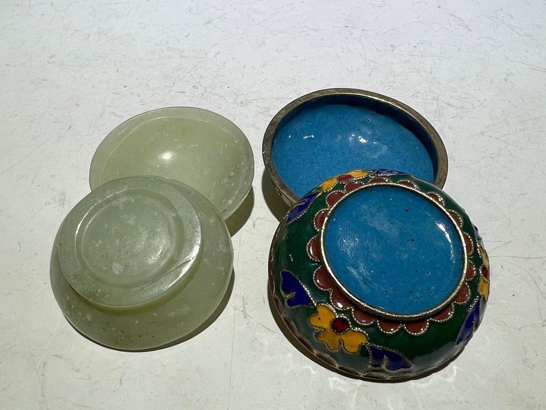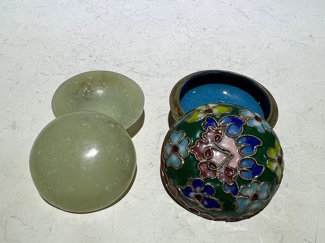 This box features two components: the left is made from smooth, translucent Hetian jade, shaped in a round form with a gentle, polished surface. The right side is crafted using cloisonné enamel, adorned with intricate floral patterns in vivid colors. Combining traditional functionality with artistic craftsmanship, it serves as both an ink paste box and incense container, making it a valuable piece for collectors.