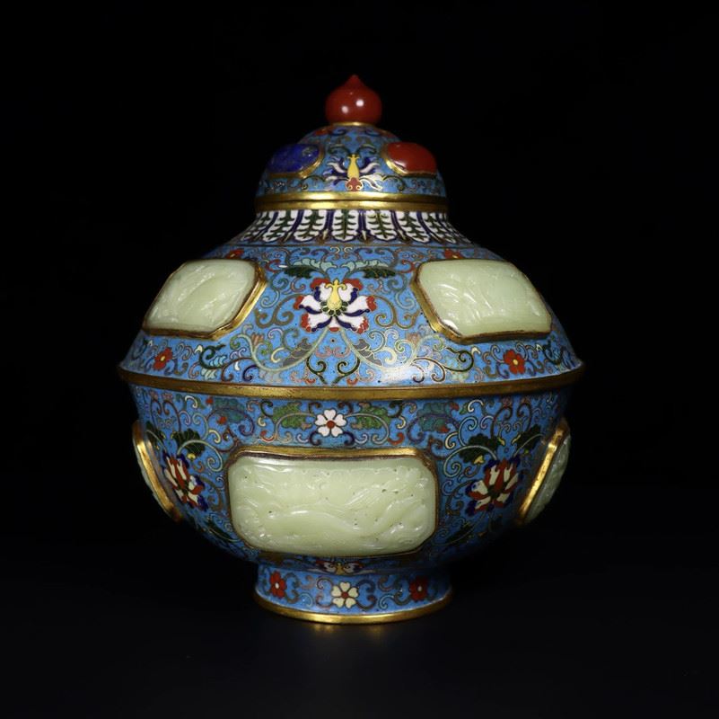 This Qing Dynasty cloisonné enamel jar features a blue base with intricate floral patterns, interspersed with Hetian jade inlays, highlighting exquisite craftsmanship. The combination of carving and enamel filling creates a seamless integration, with delicate patterns and vibrant colors that lend the piece both grandeur and elegance. The red gemstone on the top of the lid adds a vivid touch to the overall design. This jar is not only a representative example of Qing court art but also a classic fusion of cloisonné enamel and Hetian jade, reflecting the Qing imperial court's pursuit of art and luxury.