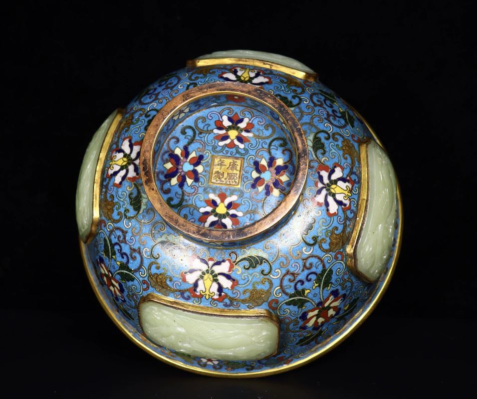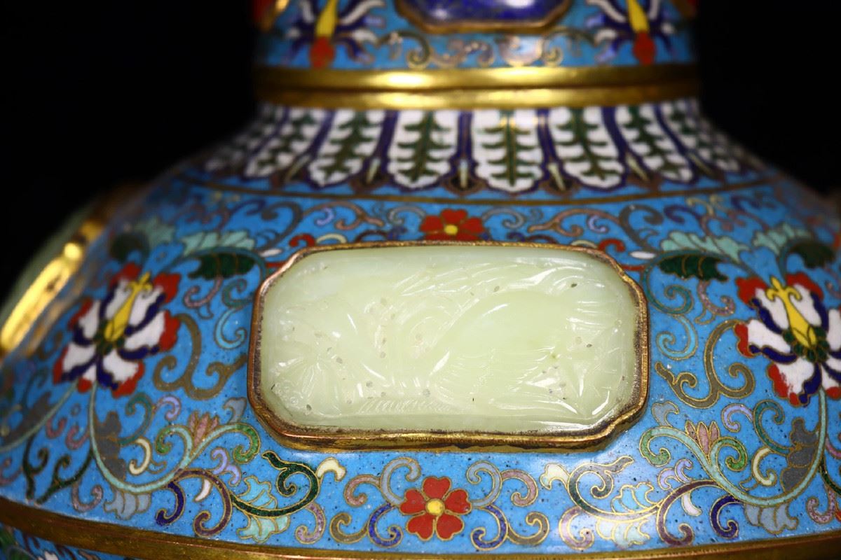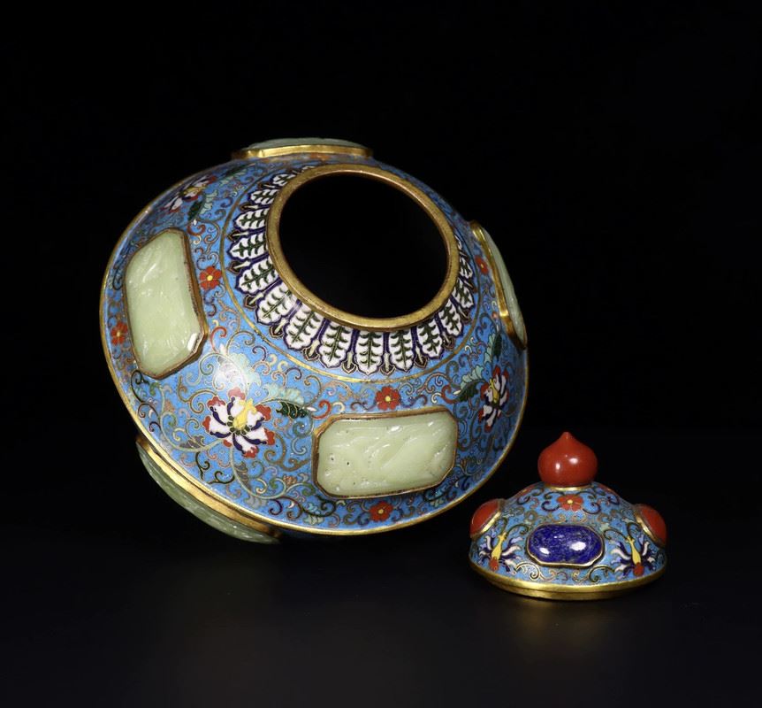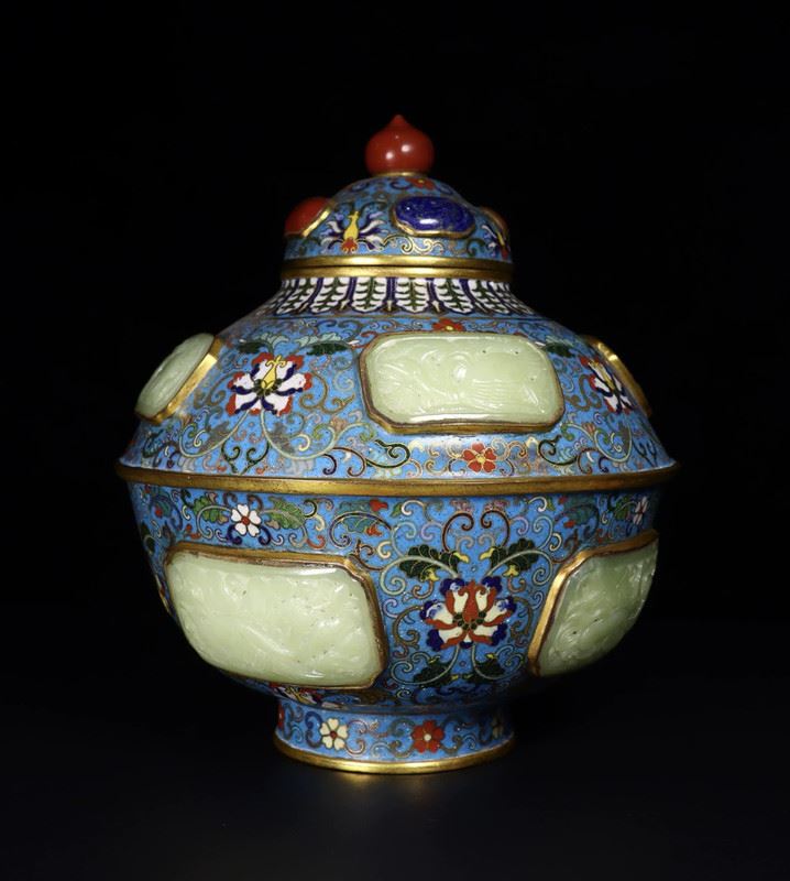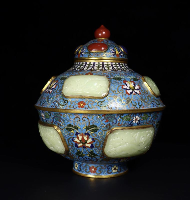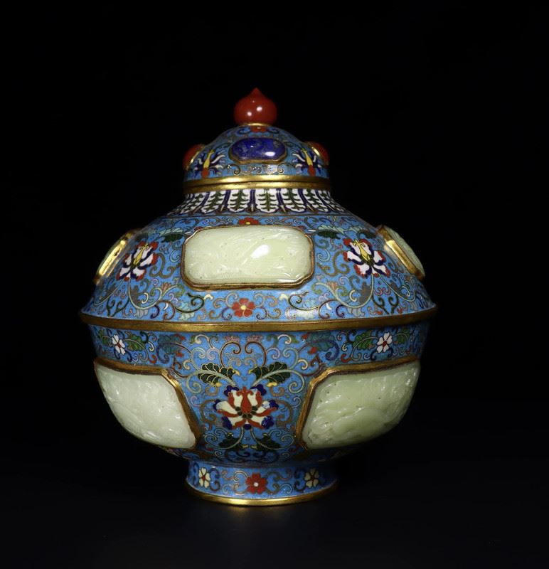 This Qing Dynasty cloisonné enamel jar features a blue base with intricate floral patterns, interspersed with Hetian jade inlays, highlighting exquisite craftsmanship. The combination of carving and enamel filling creates a seamless integration, with delicate patterns and vibrant colors that lend the piece both grandeur and elegance. The red gemstone on the top of the lid adds a vivid touch to the overall design. This jar is not only a representative example of Qing court art but also a classic fusion of cloisonné enamel and Hetian jade, reflecting the Qing imperial court's pursuit of art and luxury.