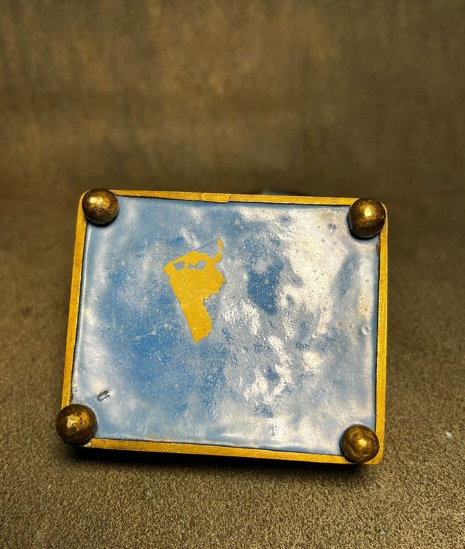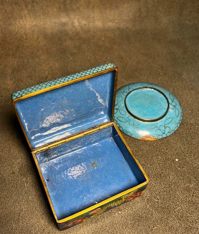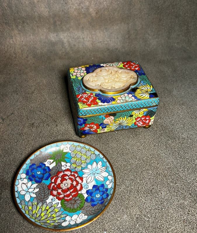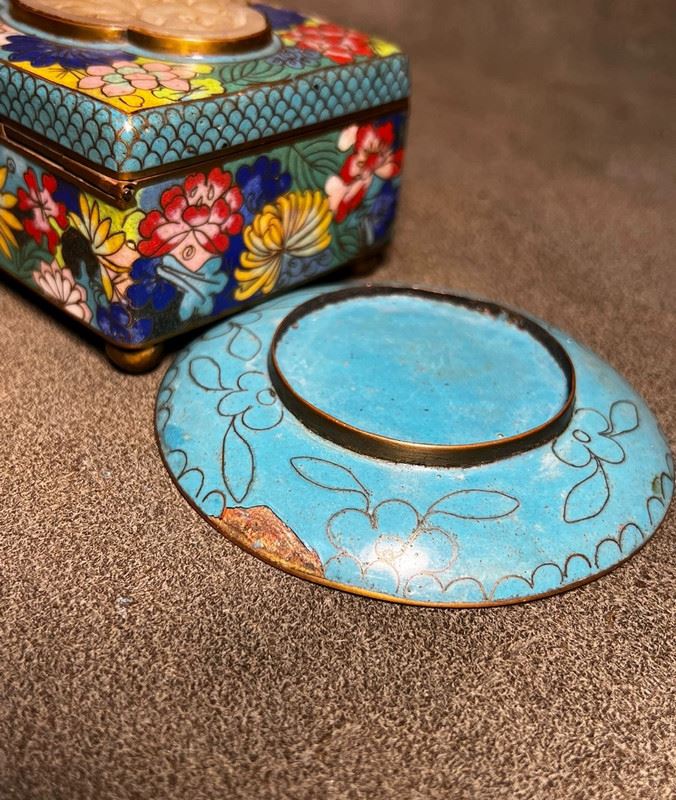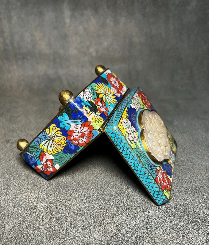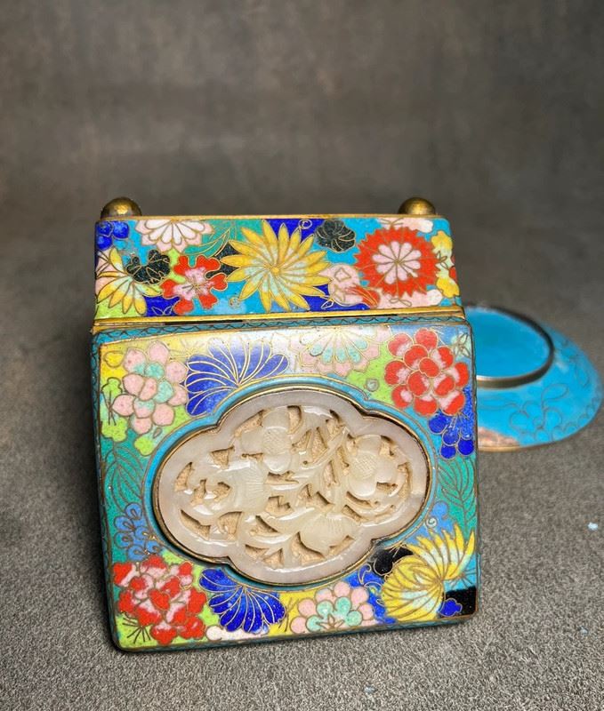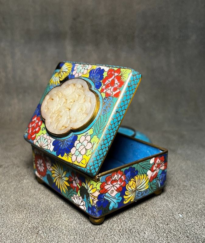 This jewelry box is crafted with a copper body and decorated in cloisonné enamel on a turquoise-blue ground. Adorned with vibrant floral scrolls, the cover is centered with a finely carved jade plaque, adding refinement and elegance. The interior is finished in turquoise enamel, and the box rests on four sturdy feet. With its harmonious design and exquisite craftsmanship, this piece served as both a functional jewelry container and a collectible decorative object.