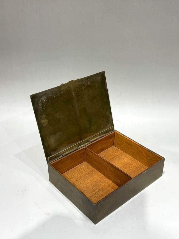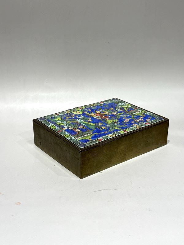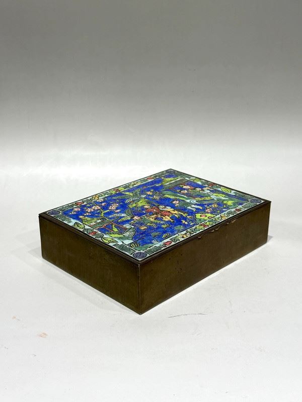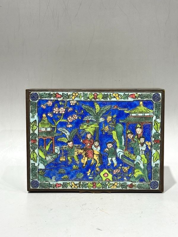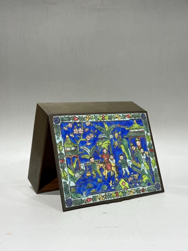 This jewelry box, crafted on a copper body with cloisonné enamel decoration, is shaped in the form of a folding book. The cover depicts the traditional Chinese theme “Return in Glory” (Yi Jin Huan Xiang) — the triumphant scholar returning to his hometown, surrounded by attendants and children on horseback, with pavilions and lush garden scenery. The composition is rich yet balanced, with figures rendered in vivid enamel colors on a bright blue ground. The borders are framed with scrolling floral designs. Made during the Republic period, this box served both as a practical jewelry container and a refined scholar’s ornament, symbolizing success and honor.