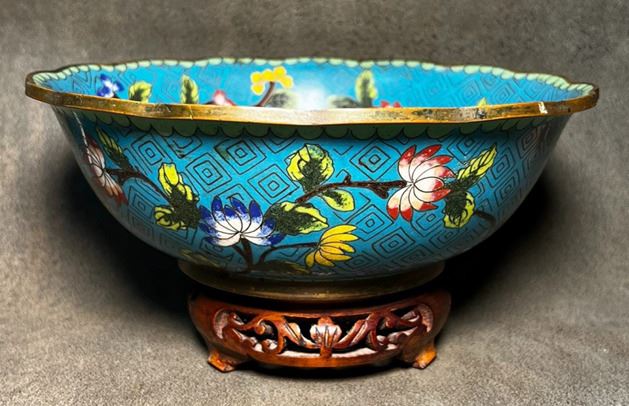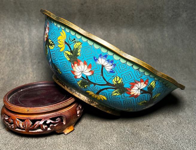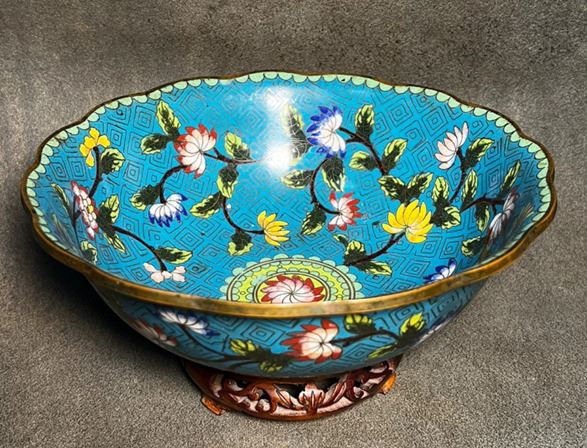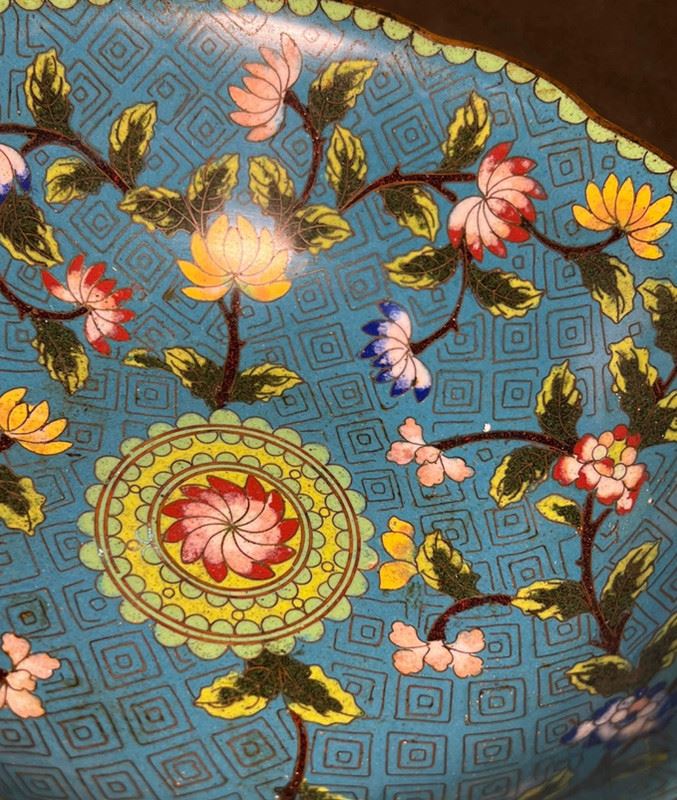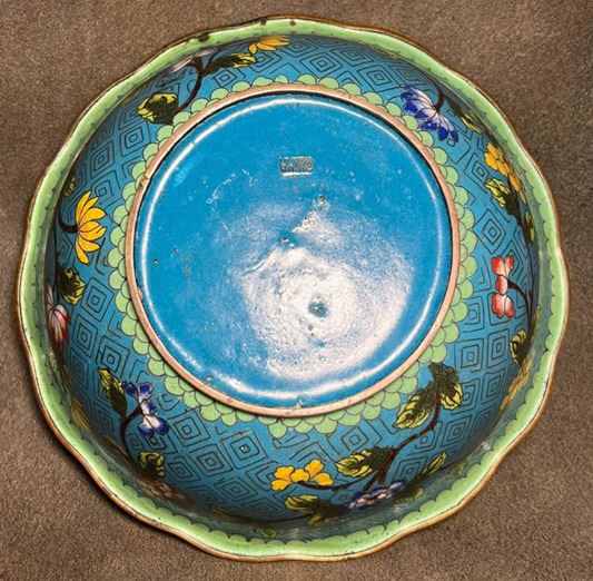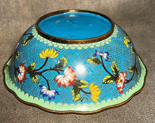 This lobed bowl features a copper body decorated with blue-ground cloisonné enamel. The interior is richly adorned with scrolling floral motifs in vivid colors, centered with a medallion flower design, and set against a geometric patterned ground. Elegant in form and refined in decoration, it demonstrates exquisite craftsmanship and holds both functional and collectible significance.