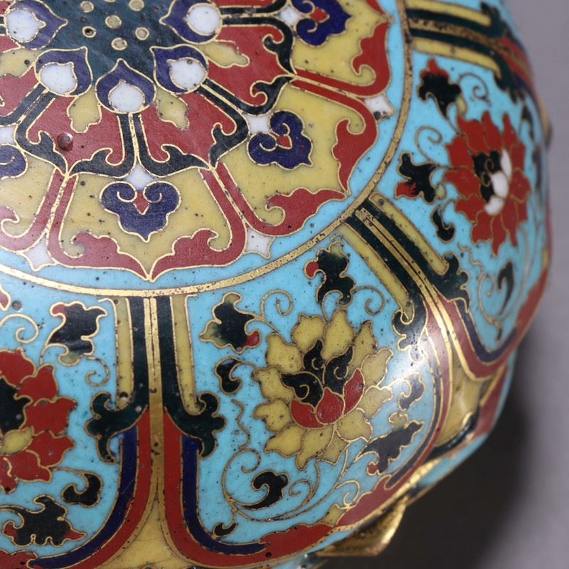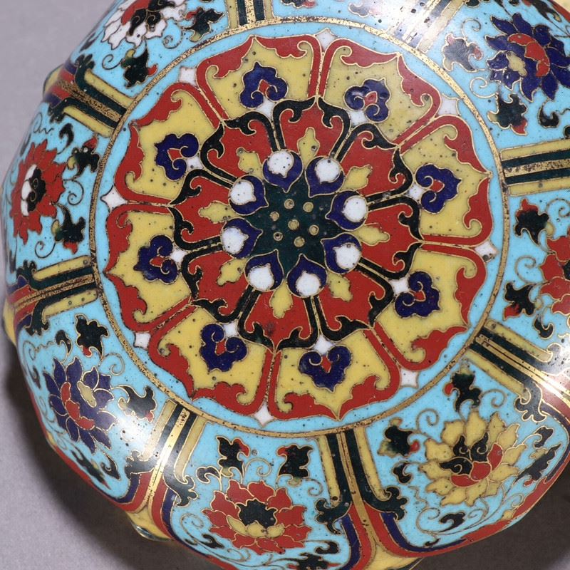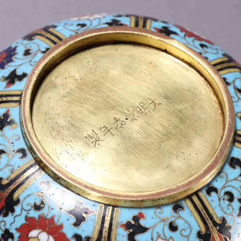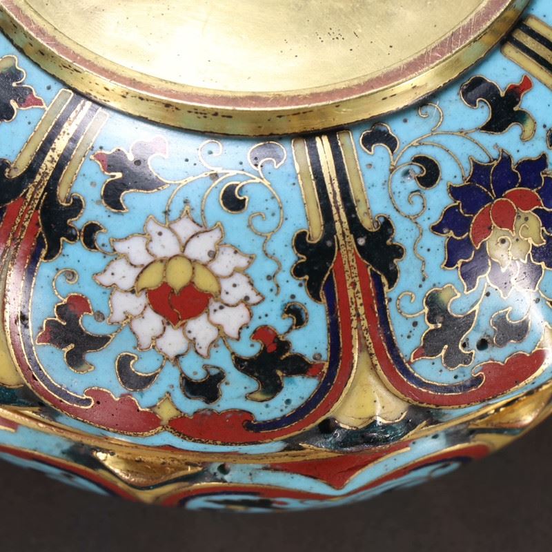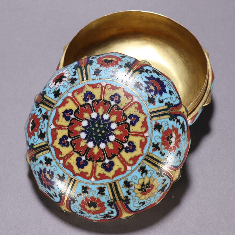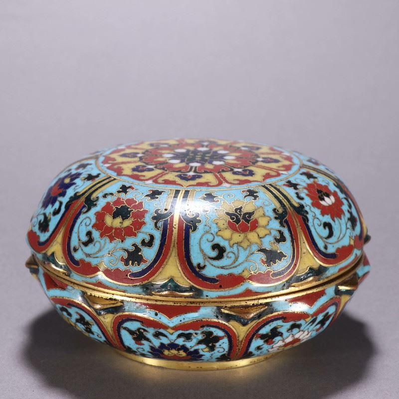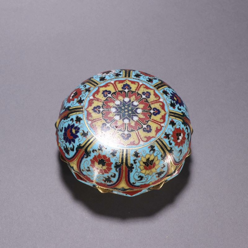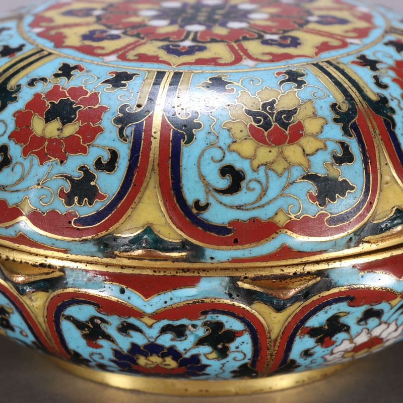 This covered box is made on a copper body with cloisonné enamel decoration. It is adorned throughout with scrolling lotus motifs in vibrant colors and a harmonious symmetrical design. Elegant in form, it embodies both functional and artistic value.