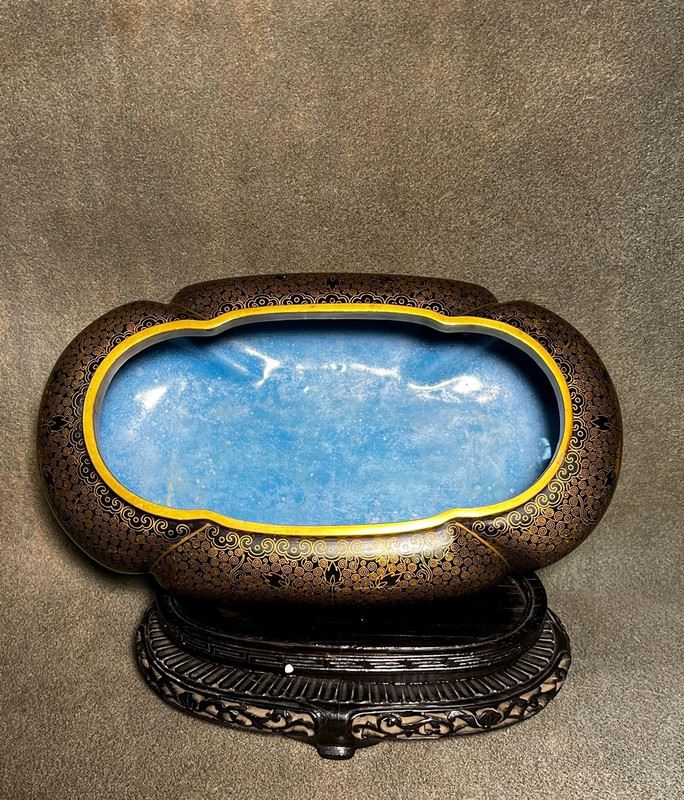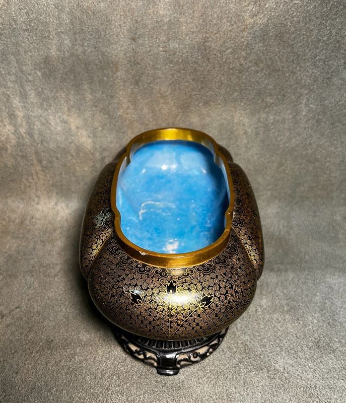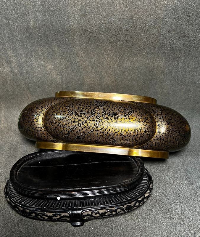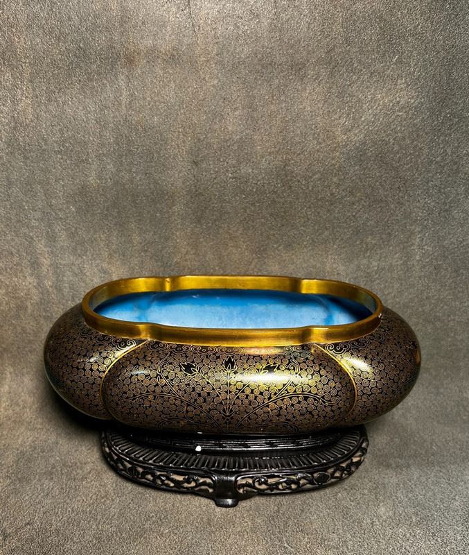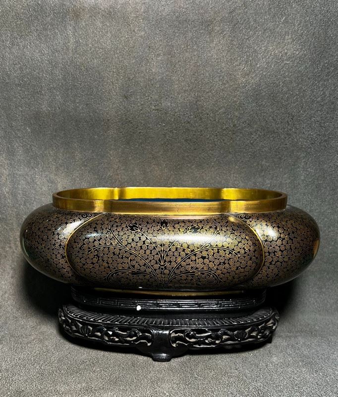 This narcissus basin is crafted with a copper body, featuring a gilt rim and a turquoise enamel interior. The exterior is adorned with dense gilt-dotted decoration, creating a refined shimmering effect. With its broad and rounded form, complemented by a finely carved wooden stand, the piece embodies both elegance and utility. Traditionally used for growing narcissus or bonsai, it serves as a functional vessel as well as a refined scholar’s desk ornament and collectible.