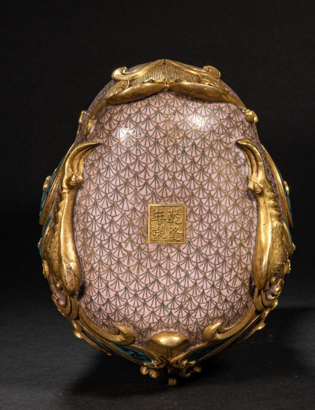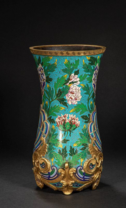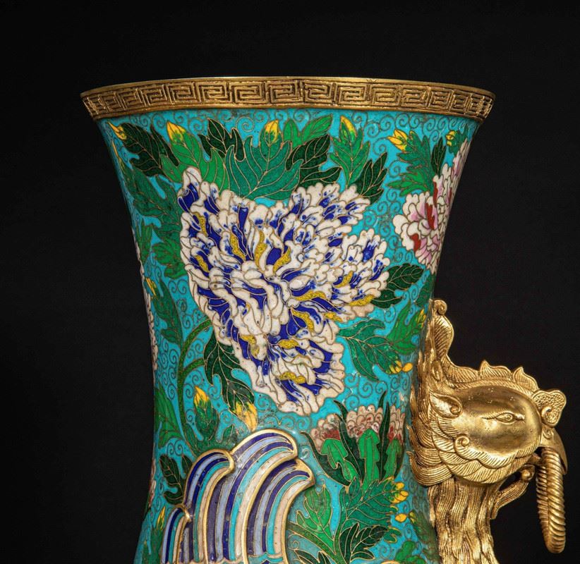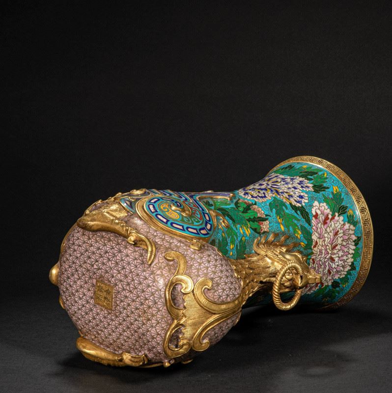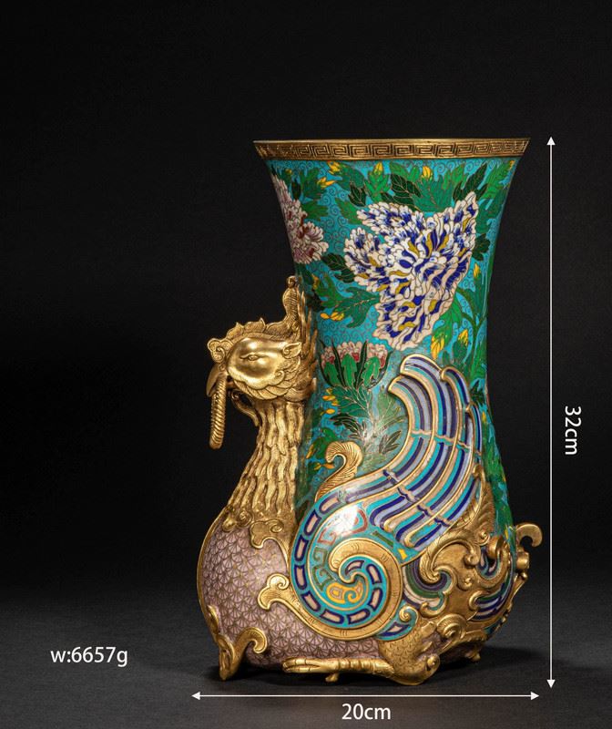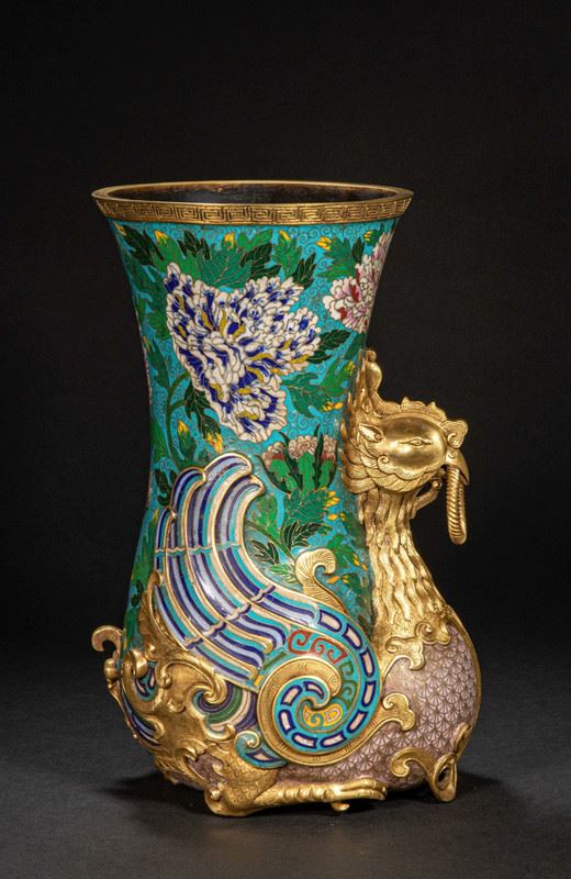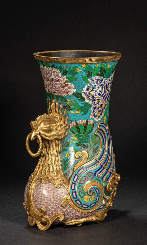 Copper body decorated in fine cloisonné: a turquoise ground of scrolling peonies with a gilt phoenix head biting a ring at the front. Pink seed-pattern and multicolored stylized wing motifs enrich the lower body; gilt rim and foot complete the piece. Elegant wirework and a sumptuous palette, the phoenix symbolizing auspicious rank—ideal for display and collection.