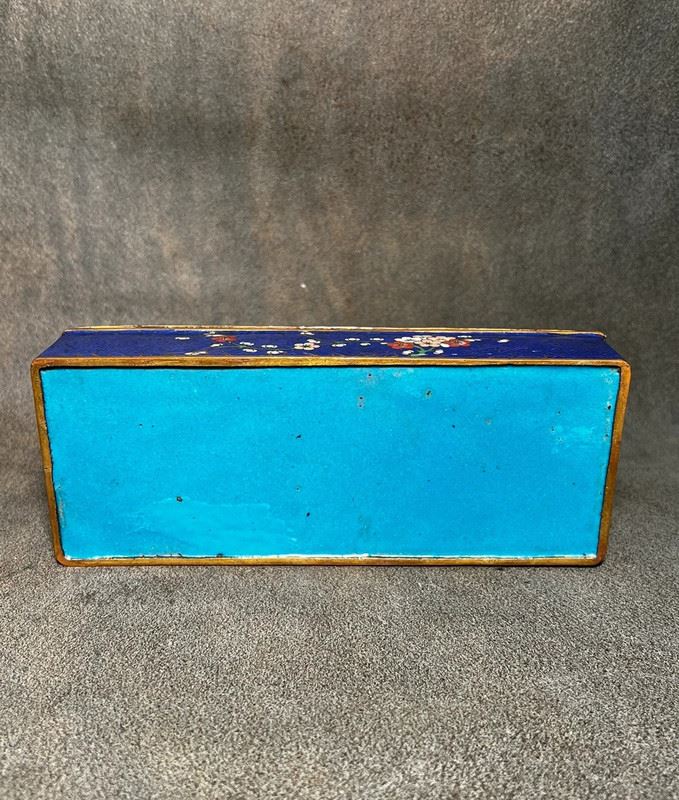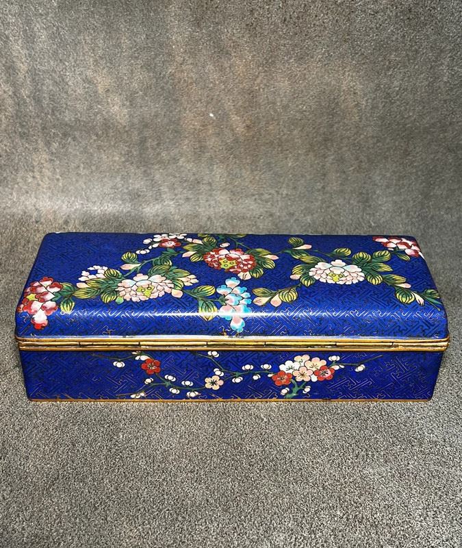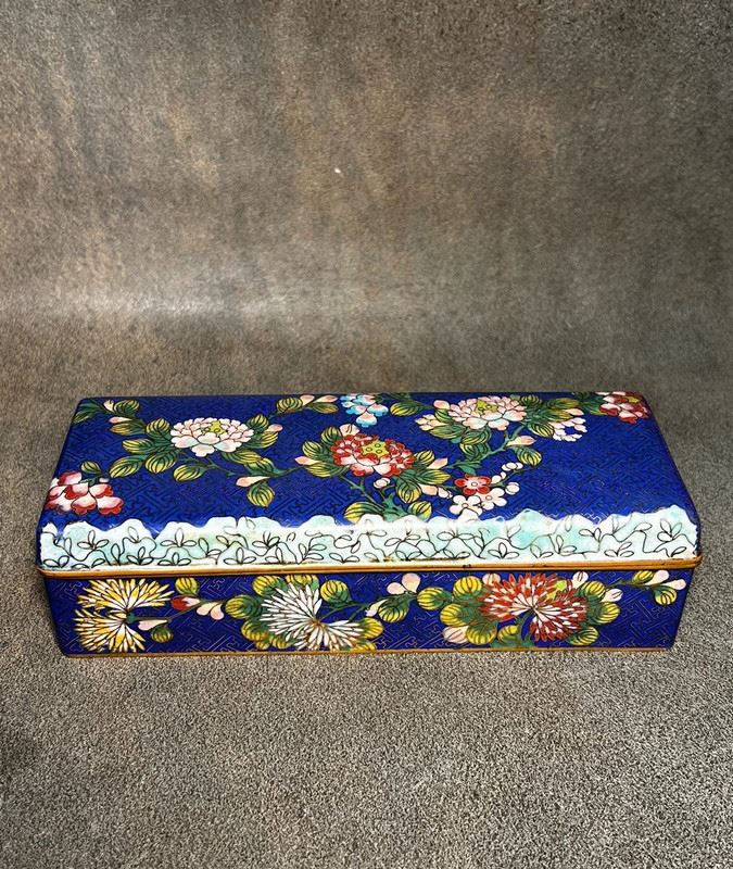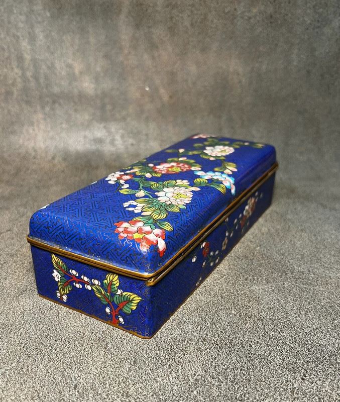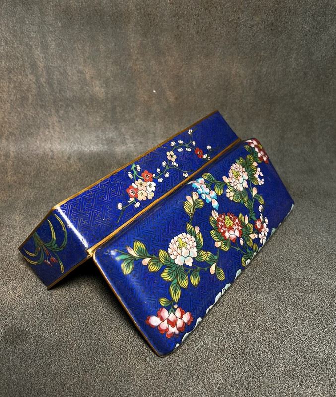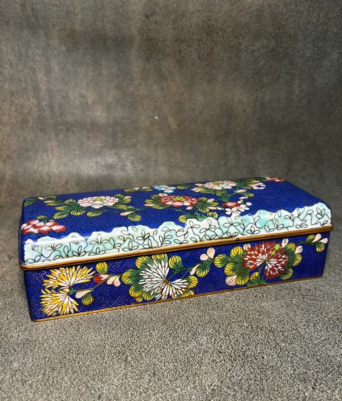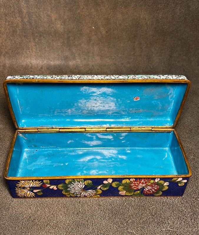This rectangular box is crafted with a copper body and decorated in vibrant cloisonné enamel. The deep blue ground is adorned with scrolling chrysanthemum motifs in vivid colors, highlighted by a white enamel cloud border along the lid. Elegant in form and intricate in decoration, it exemplifies refined craftsmanship and serves both practical and collectible purposes.