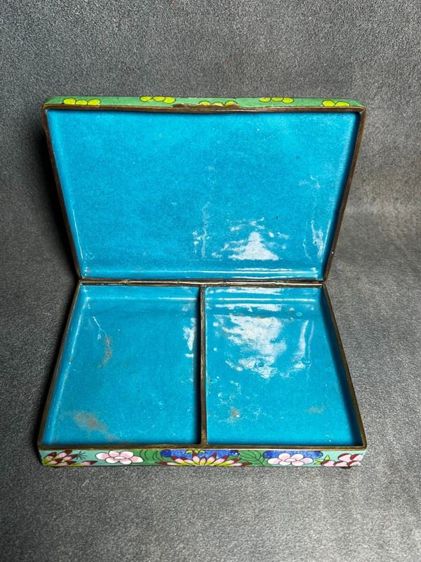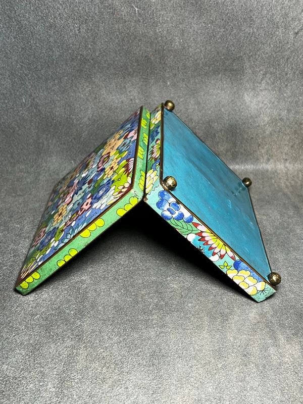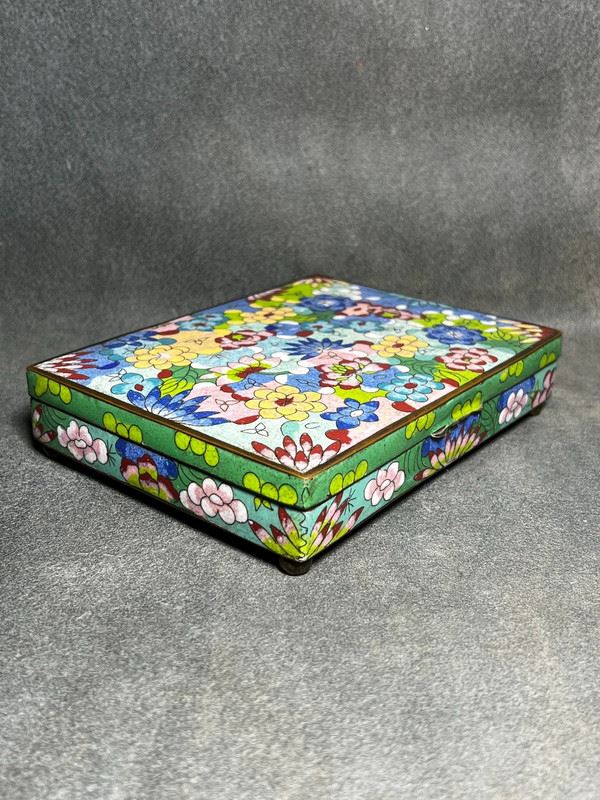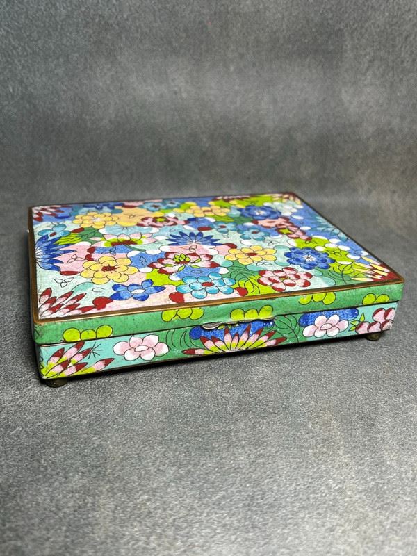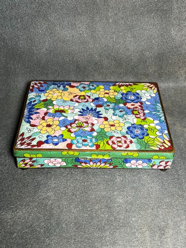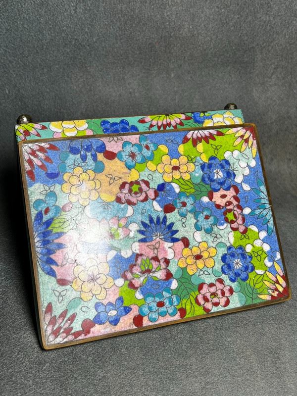This rectangular box is crafted with a copper body and decorated in cloisonné enamel, featuring an allover design of scrolling floral motifs. The decoration is rendered in vivid colors of red, blue, green, and yellow, creating a lively yet harmonious effect. The floral motifs on the cover and sides echo one another, while the form is elegant and well-proportioned. With its refined craftsmanship and striking design, this piece served both as a functional container and as a collectible decorative object.