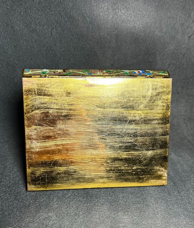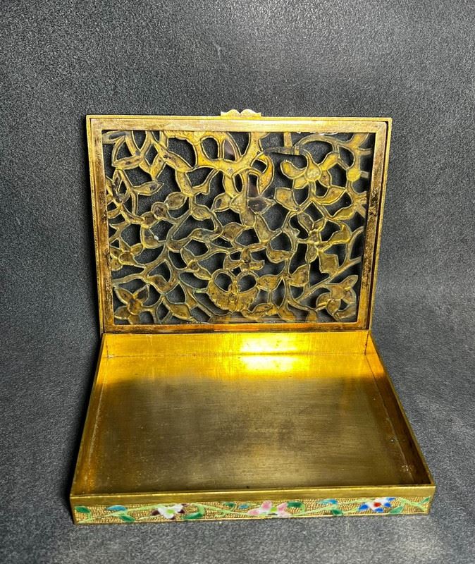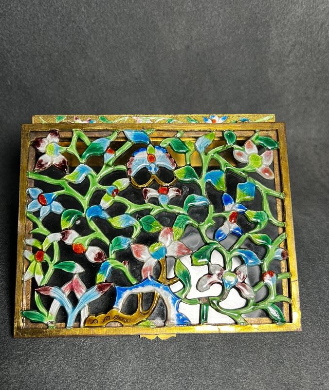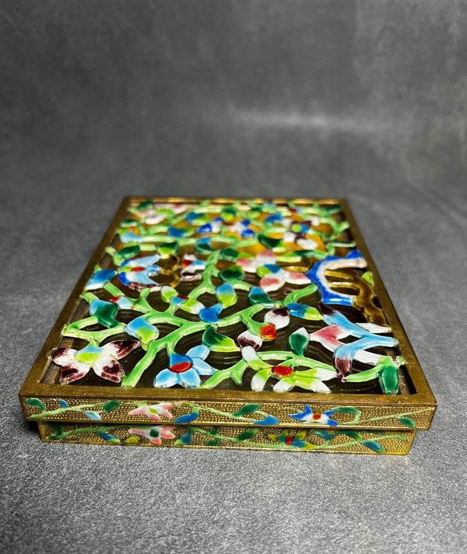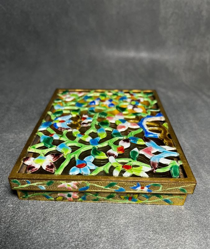 This box is crafted with a copper body and decorated in cloisonné enamel, featuring an intricate reticulated design. The surface is adorned with colorful floral motifs in green, red, blue, and yellow, creating a lively and harmonious palette. The openwork craftsmanship adds depth and transparency, lending the piece both weight and elegance. The sides are similarly decorated with floral branches, showcasing meticulous detail. Combining practicality with artistry, this box stands as a refined example of cloisonné craftsmanship and a valuable collectible.