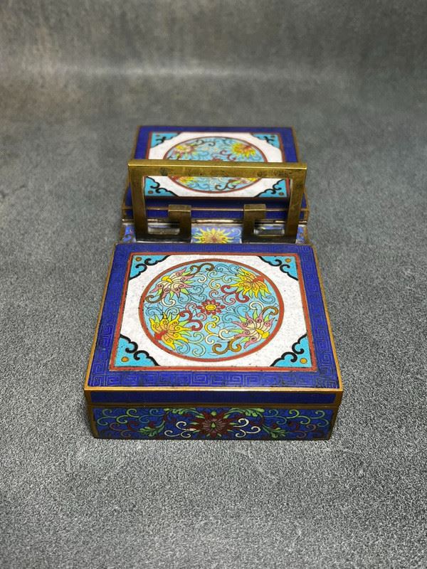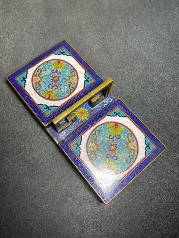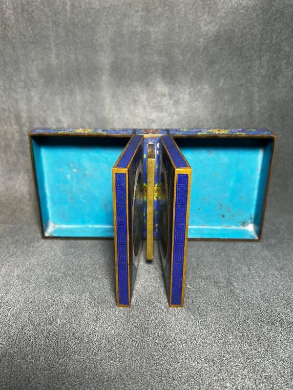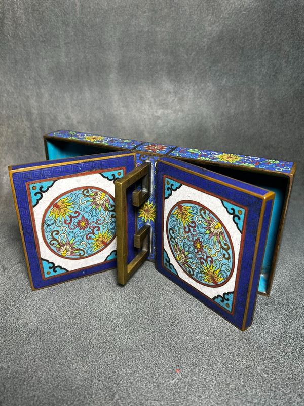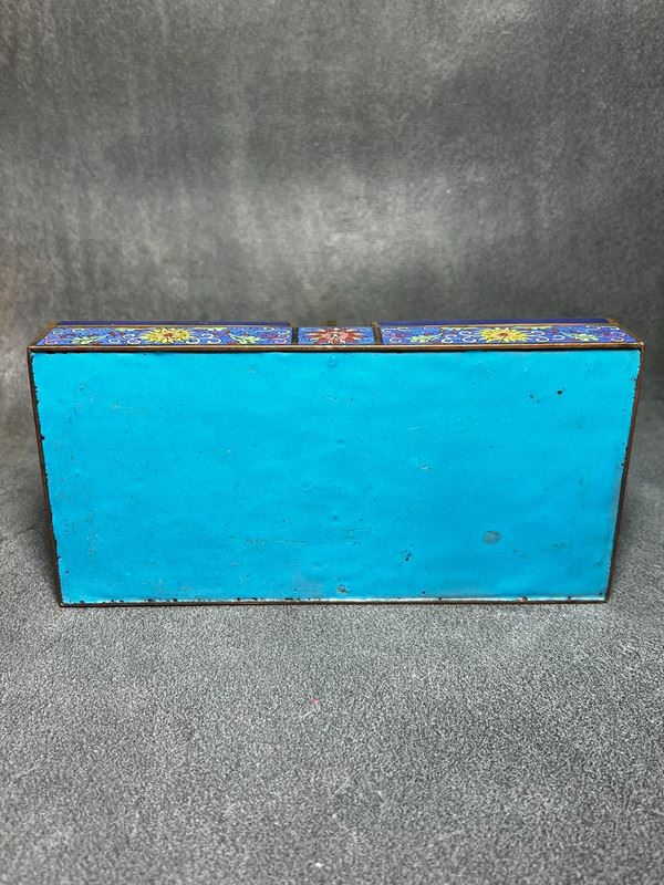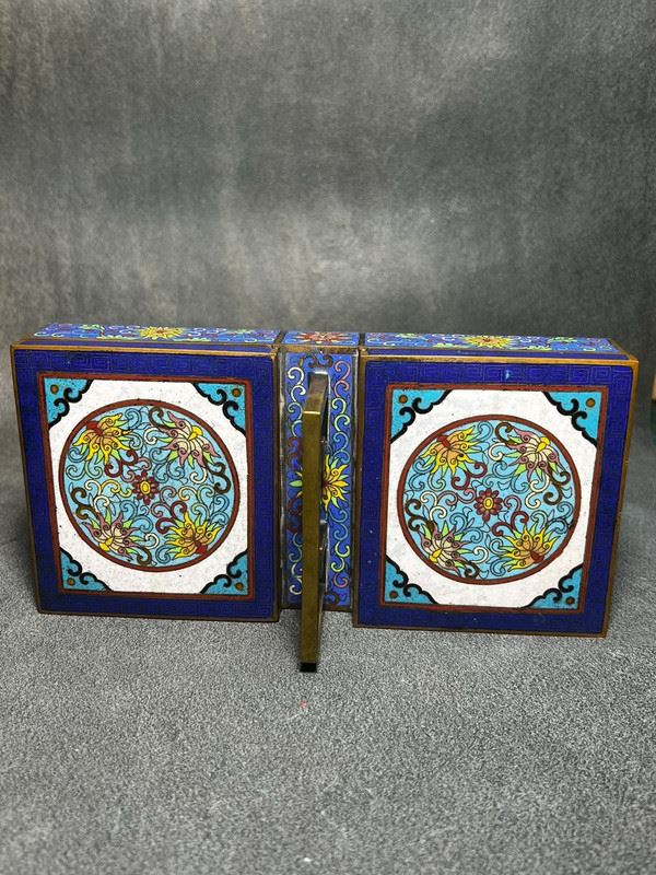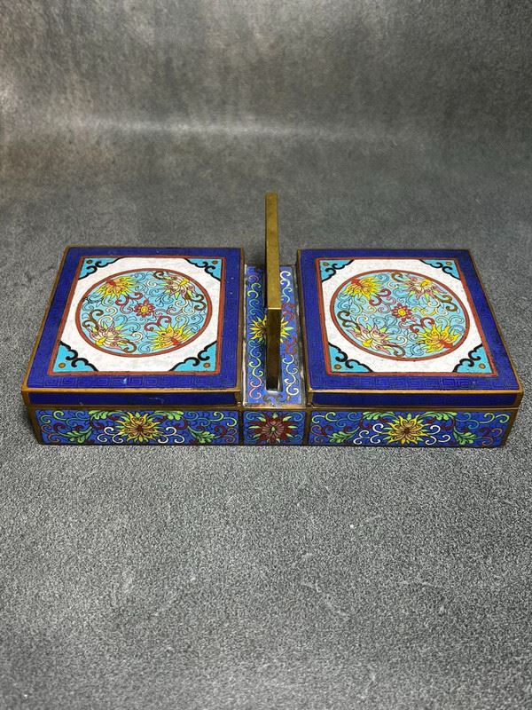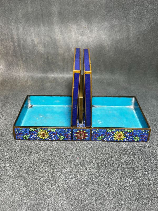 This scholar’s desk accessory is crafted with a copper body and decorated in cloisonné enamel. The double-compartment form features lids with medallions of scrolling lotus motifs on a white ground, framed by vivid blue borders. The sides are adorned with floral scrolls on a blue background, while a central metal handle provides balance and practicality. Combining utility with refined craftsmanship, this piece exemplifies the elegance of cloisonné artistry in traditional scholar’s desk culture.