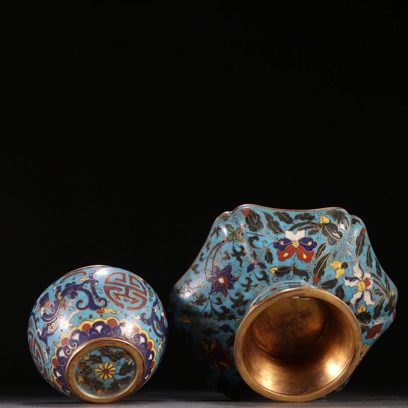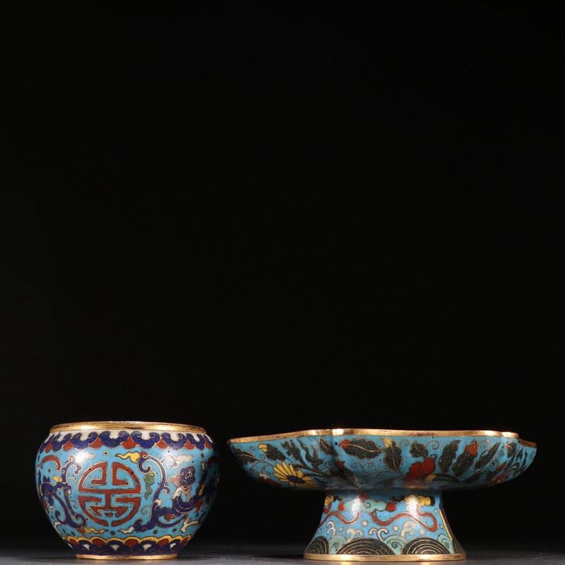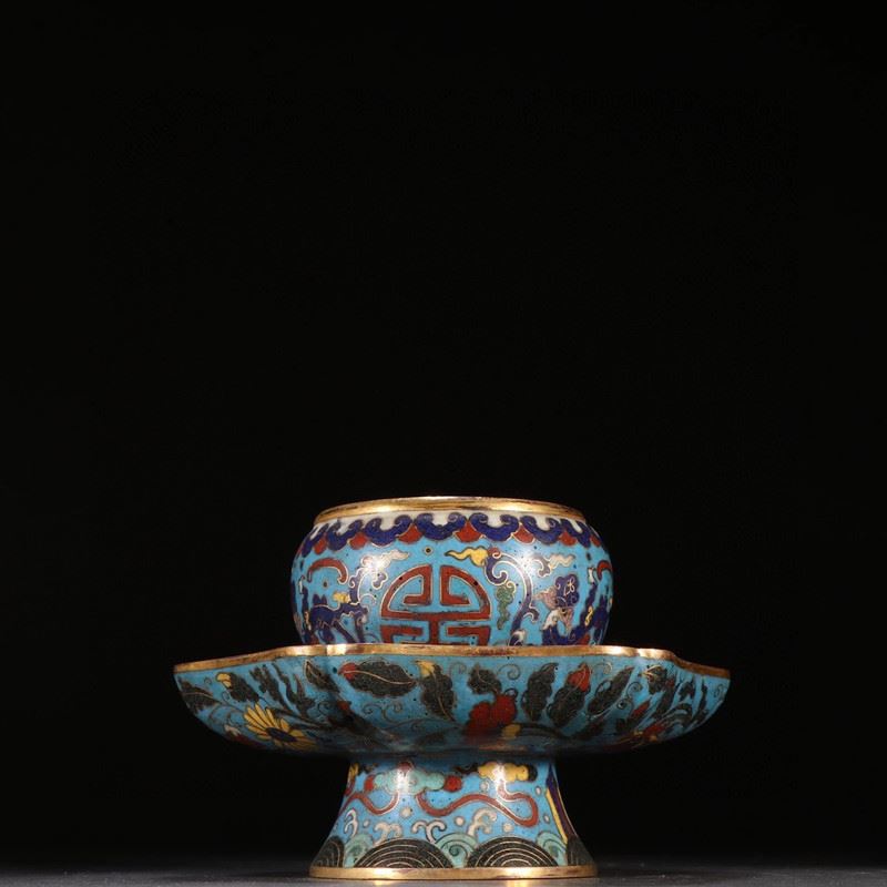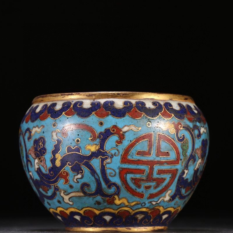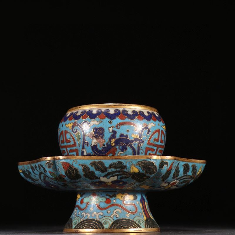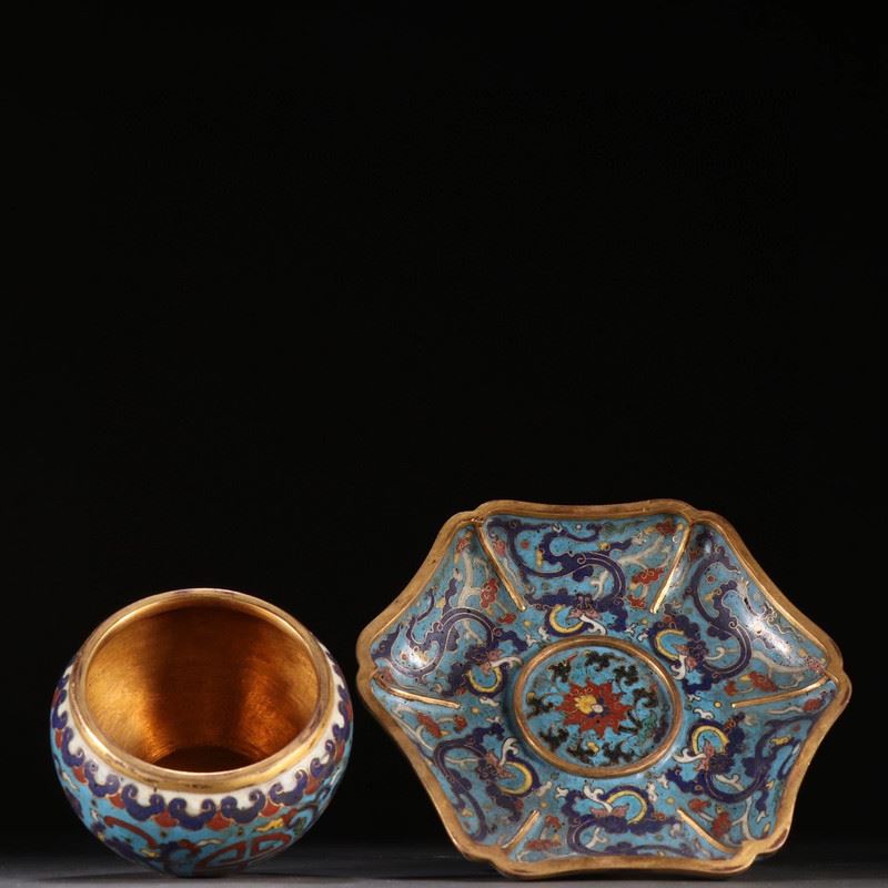 cloisonné enamel tea cup on a copper base features traditional cloisonné craftsmanship, with delicate patterns and rich color contrasts of blue and gold. The cup and its base present an elegant layered design, exuding classical beauty. The decorative motifs blend traditional Chinese auspicious symbols with natural elements, showcasing exquisite craftsmanship. This tea cup is not only a tea accessory but also a fine piece of art that embodies traditional Chinese culture and artistry.