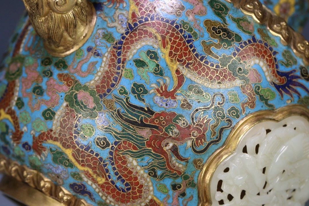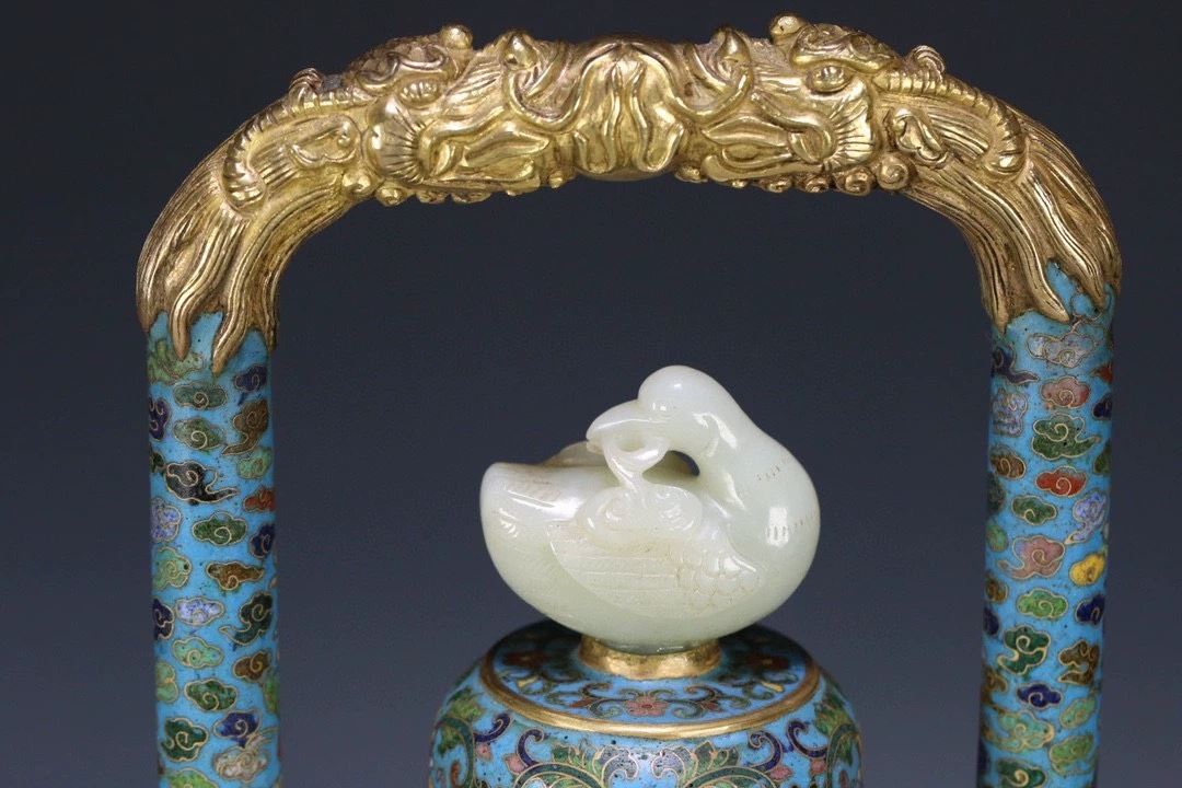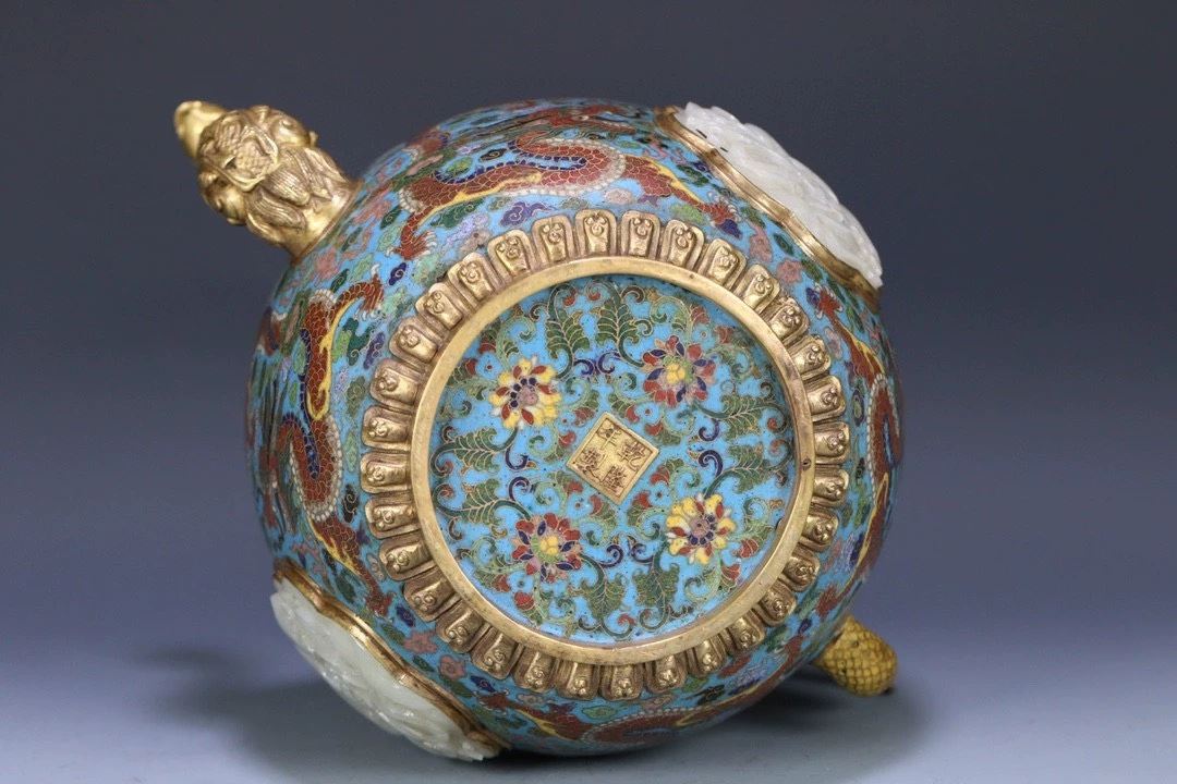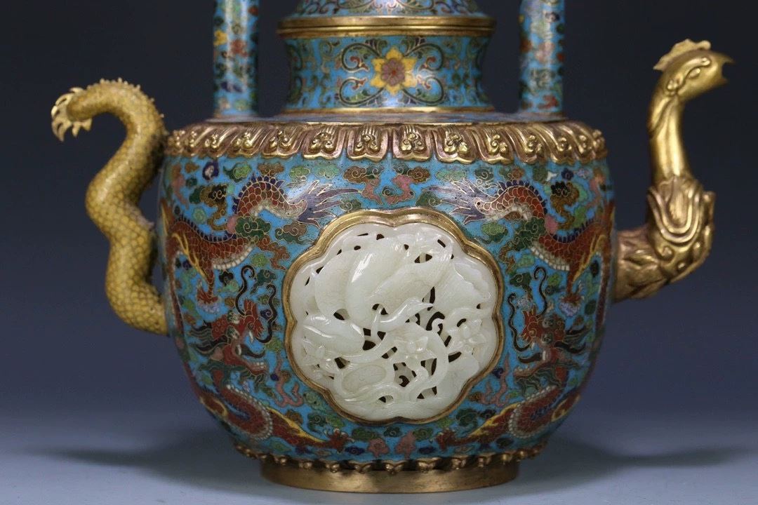 This teapot features the finest elements of traditional Chinese craftsmanship, combining cloisonné enamel and Hetian jade. The body of the teapot is decorated with vibrant and intricate floral and dragon-phoenix patterns, symbolizing prosperity and nobility. The distinctive phoenix-shaped handle adds both artistic value and a royal flair. The teapot's mouth is adorned with Hetian jade, known for its smooth texture and elegant color, enhancing its regal appeal. The overall design is graceful, reflecting the dual pursuit of beauty and functionality in ancient Chinese artifacts, making this a highly collectible art piece.