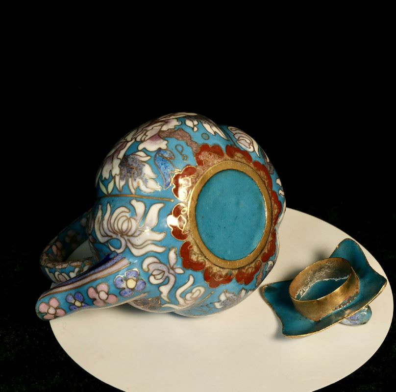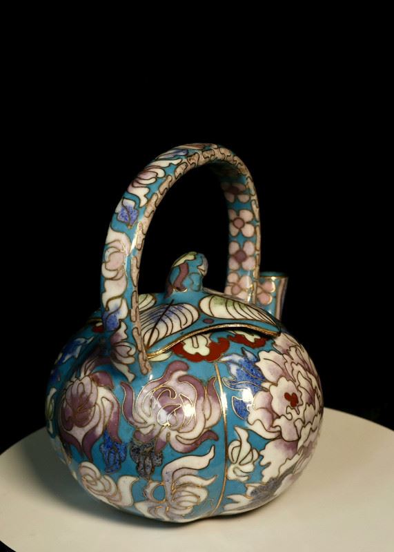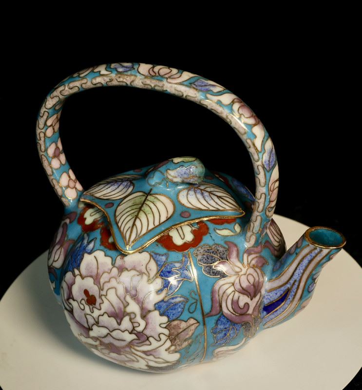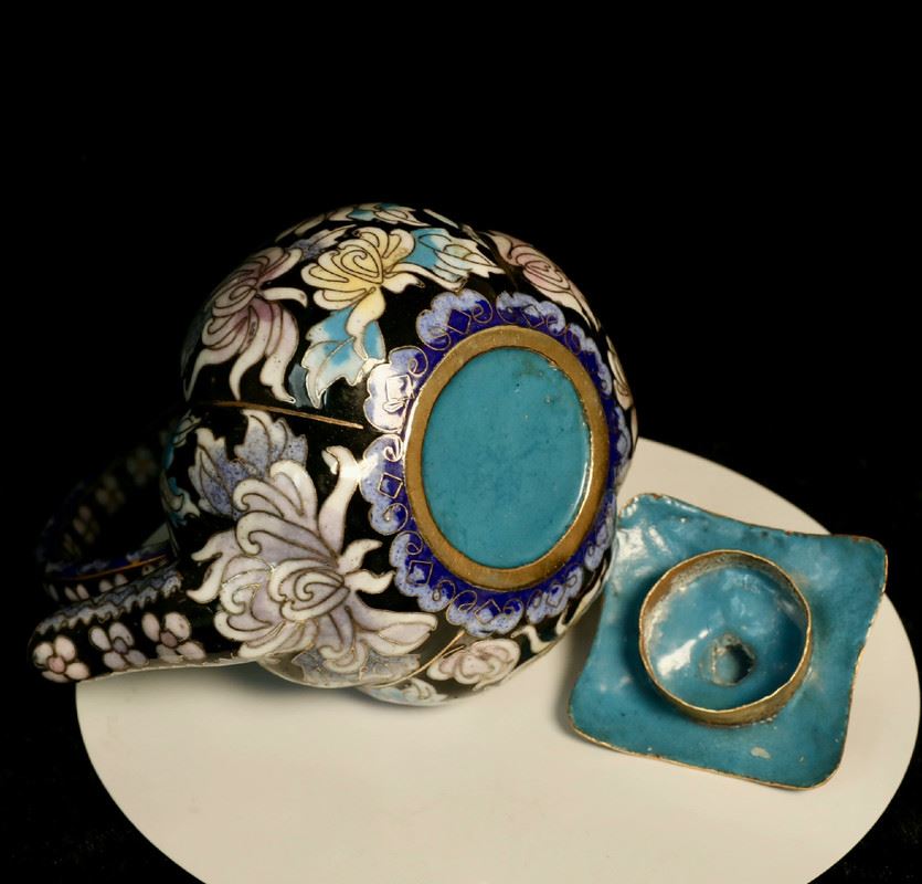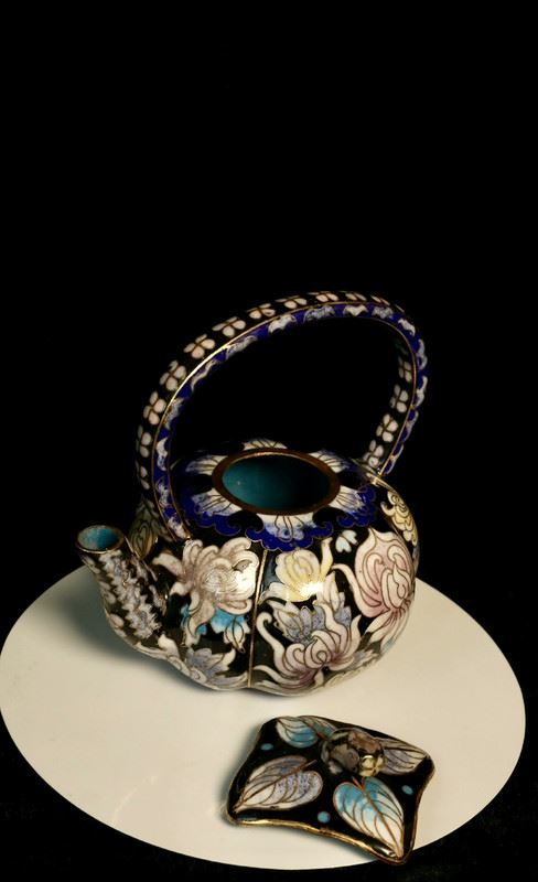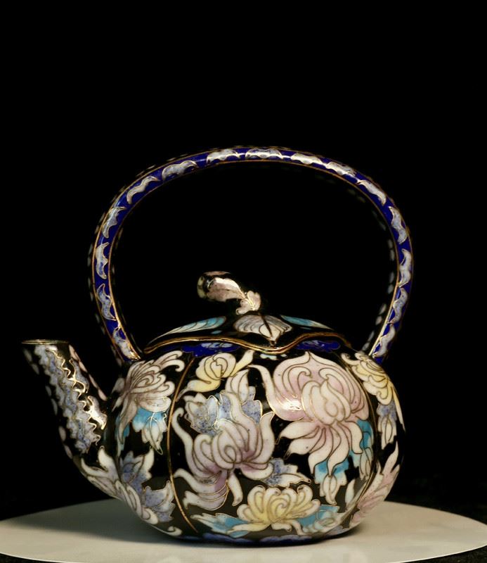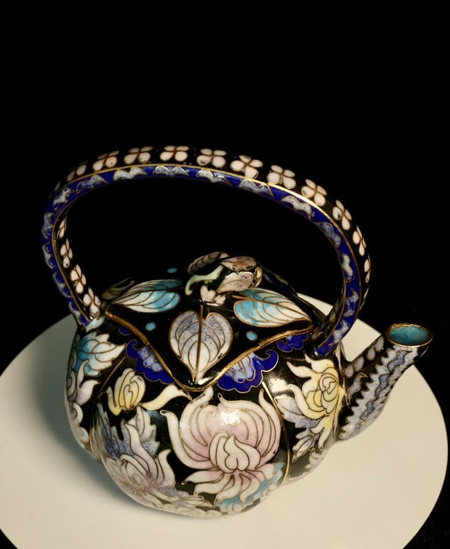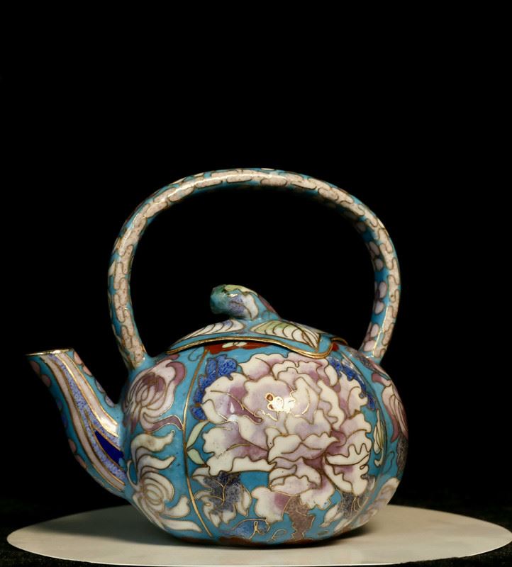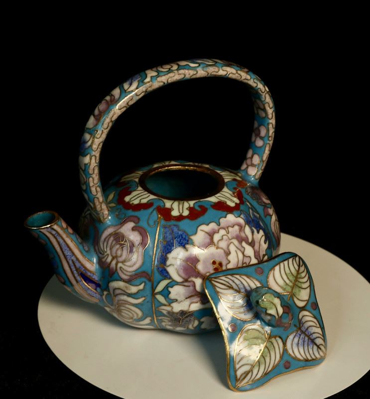 This cloisonné enamel teapot is crafted on a copper base, decorated with elegant peony motifs. The soft colors of the blossoms stand out against the black enamel ground, adding richness and refinement. The rounded body, arched handle, and spout are all adorned with delicate cloisonné patterns, showcasing superb craftsmanship. With its elegant design, it serves both as a functional teapot and as a highly collectible decorative piece.