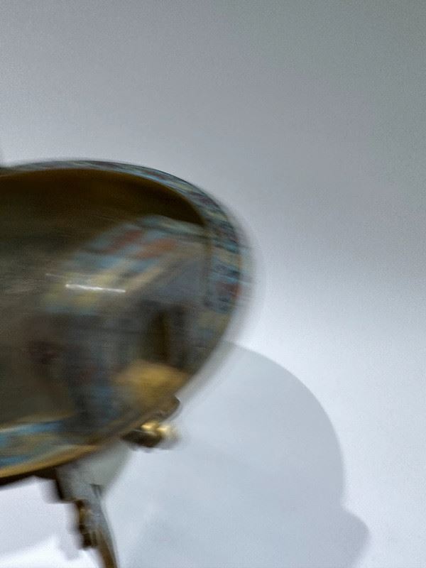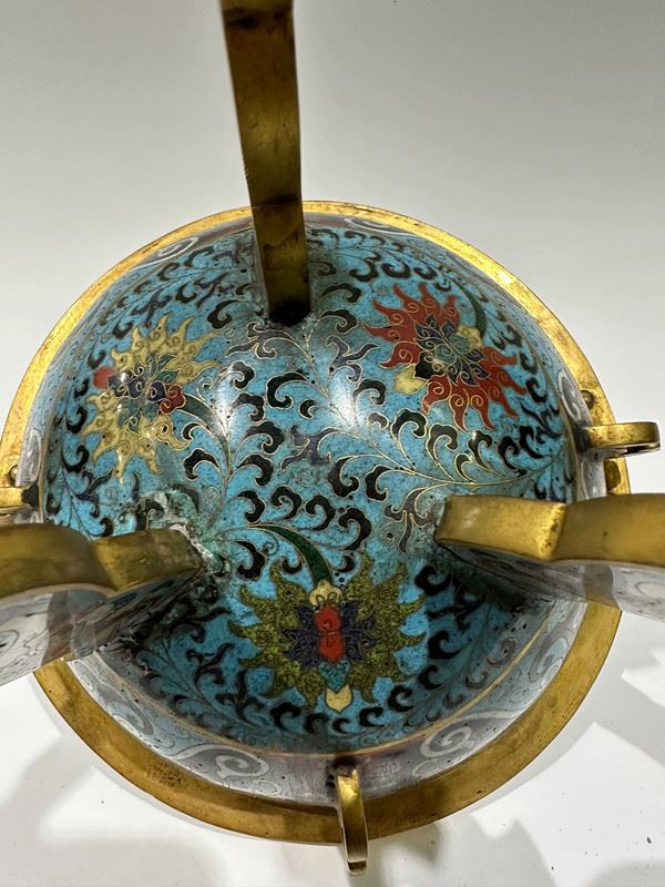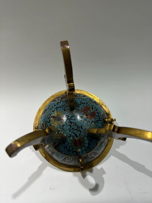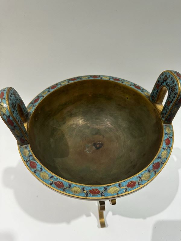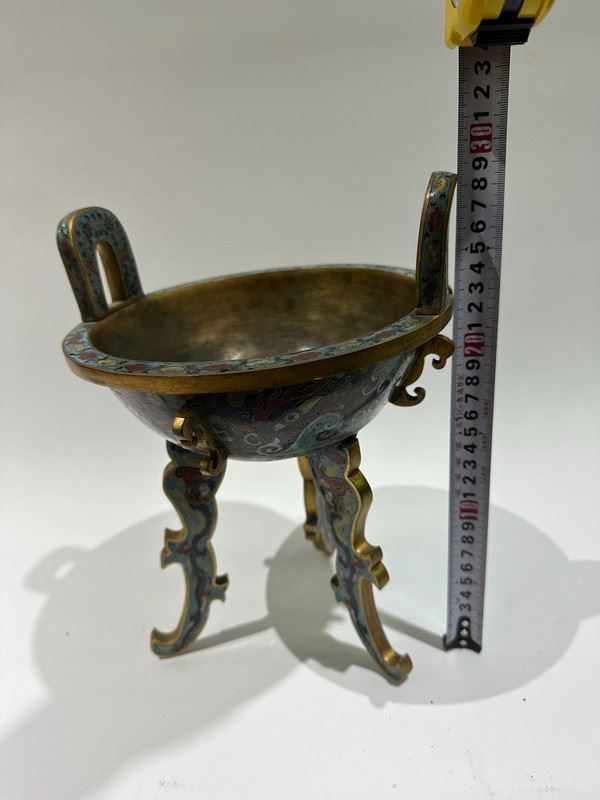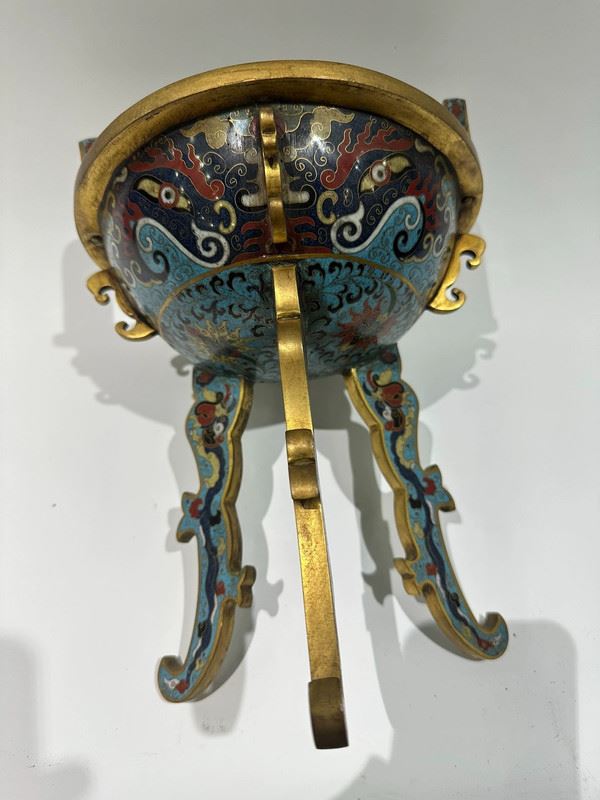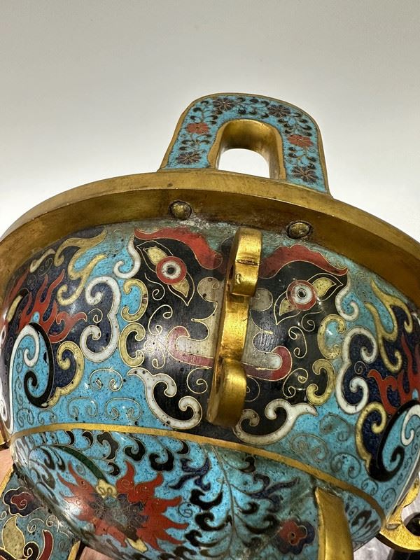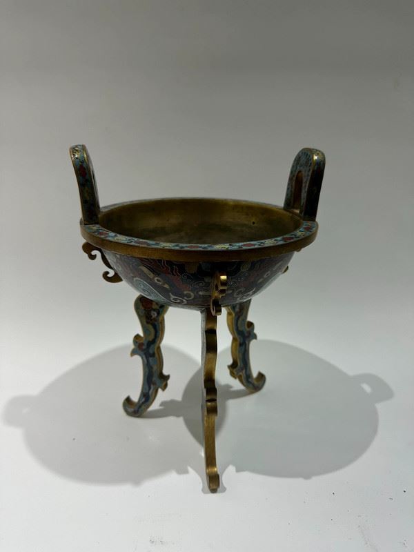 This tripod censer is crafted on a copper body with cloisonné enamel decoration, featuring scrolling patterns, colorful clouds, and dragon motifs on a vibrant blue ground. The vessel is designed with twin handles, embodying solemnity and elegance. The three splayed legs, gracefully shaped with openwork details, provide both stability and refined beauty. With its harmonious form and intricate ornamentation, the censer combines the tradition of ritual bronzes with the brilliance of cloisonné artistry, making it both a functional vessel and a highly collectible work of art.