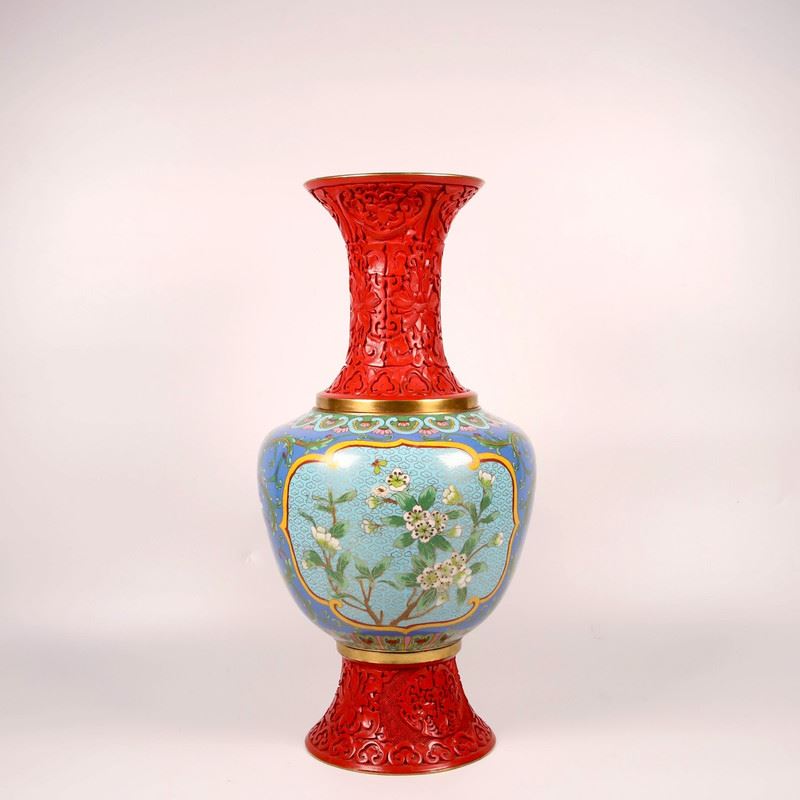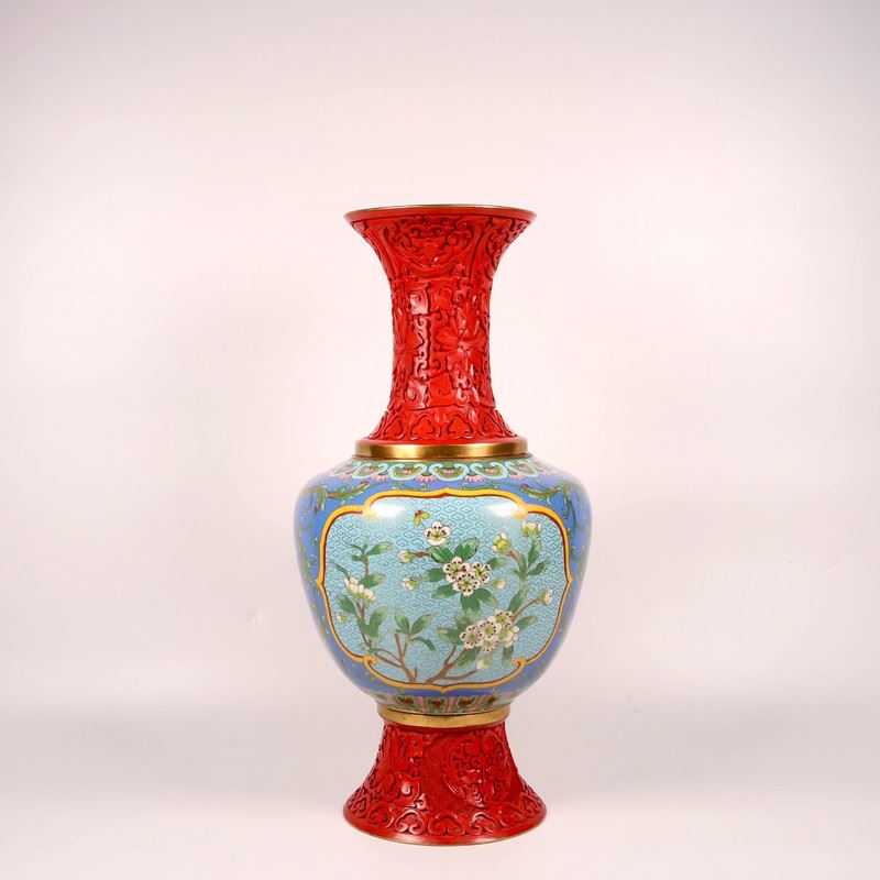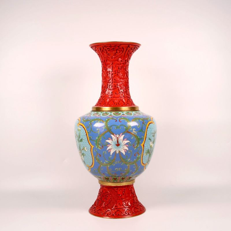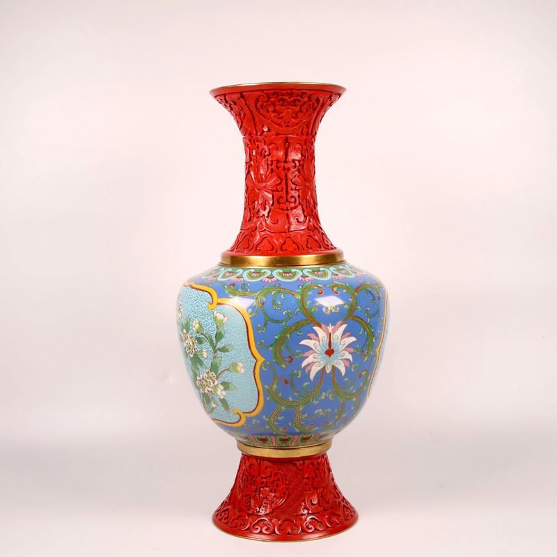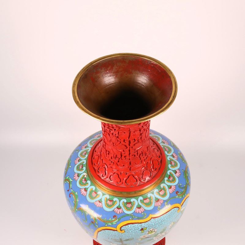This cloisonné enamel vase combines vibrant red and blue tones, featuring exquisite floral patterns on the body, showcasing a perfect blend of elegance and vitality. The detailed floral designs are delicately crafted, while the red carved base and neck enhance the antique charm. This piece embodies the traditional craftsmanship of cloisonné and serves as a functional and collectible art piece.