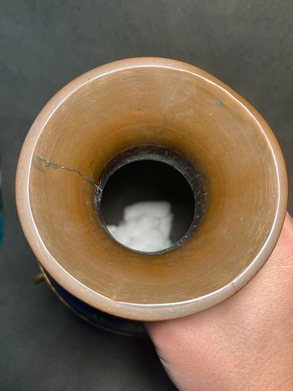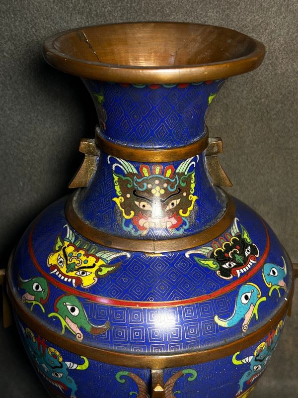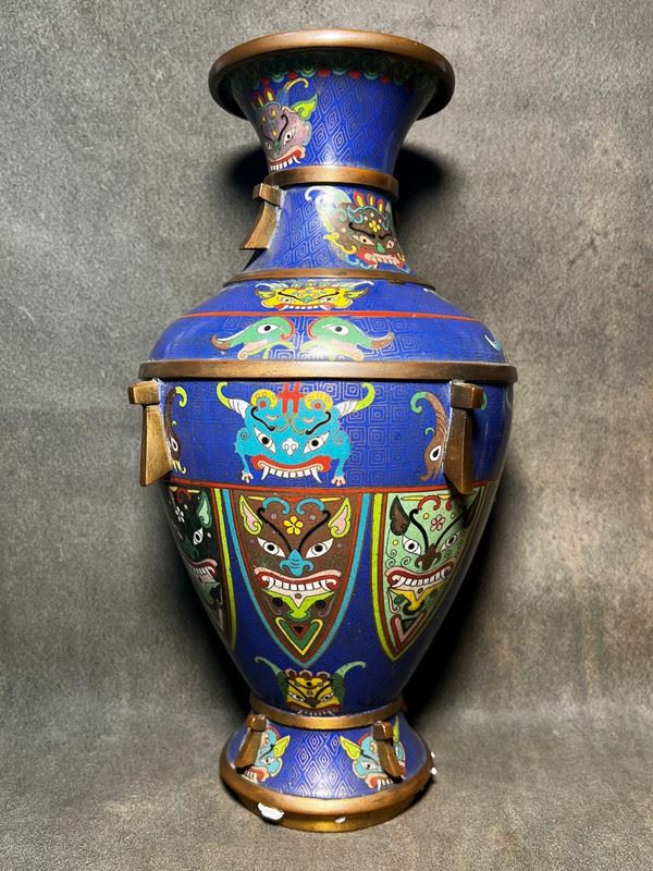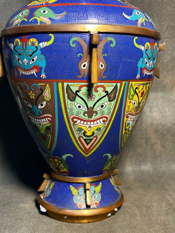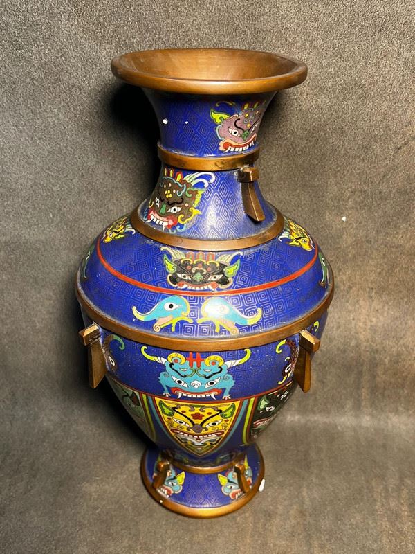 This imposing vase is crafted with a copper body and decorated in vibrant cloisonné enamel on a blue ground. The surface features bold taotie mask motifs in striking colors, exuding a sense of power and authority. Divided into decorative panels and fitted with bronze gilt ring handles, the design reflects both structural precision and artistic grandeur. Such pieces were often created as auspicious ornaments for warding off evil and symbolizing protection, particularly in the late Qing to early Republic period.