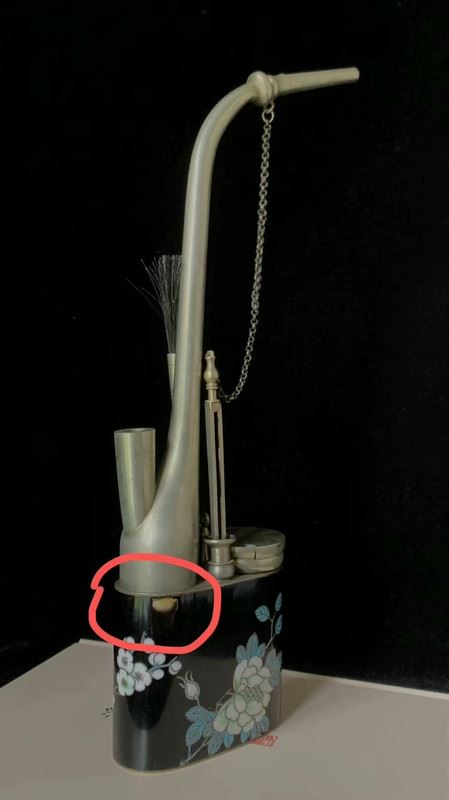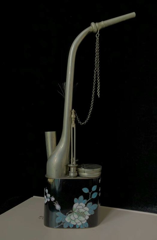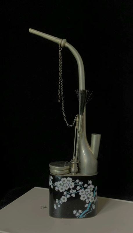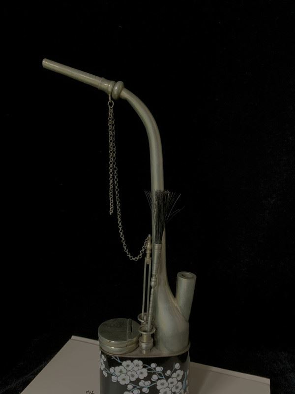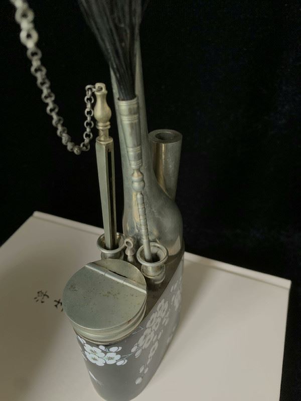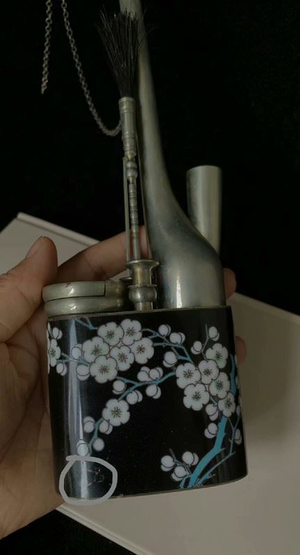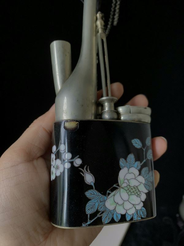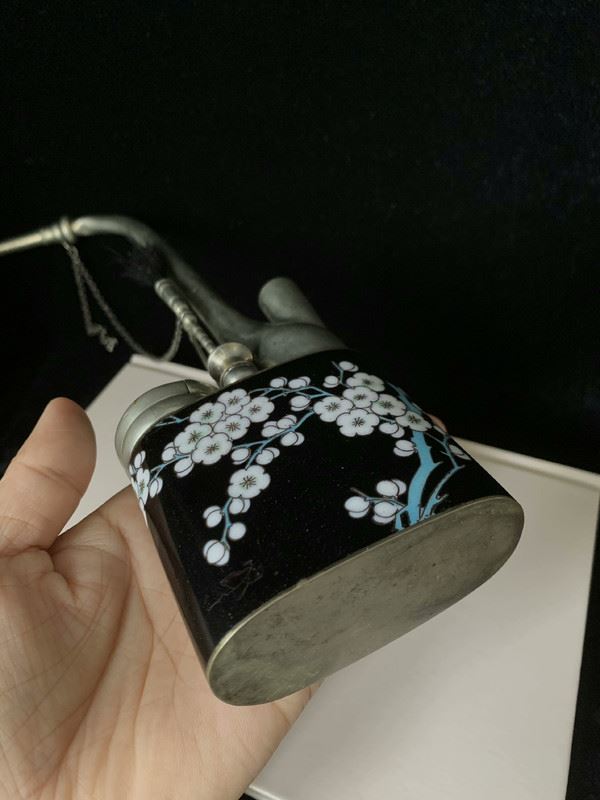 This cloisonné enamel water pipe features an elegant curved stem with a suspended metal chain for convenience. The base is decorated with floral patterns on a black enamel ground, showcasing the intricate artistry of cloisonné craftsmanship. With its refined form and artistic decoration, it serves as both a functional smoking pipe and a collectible art piece.