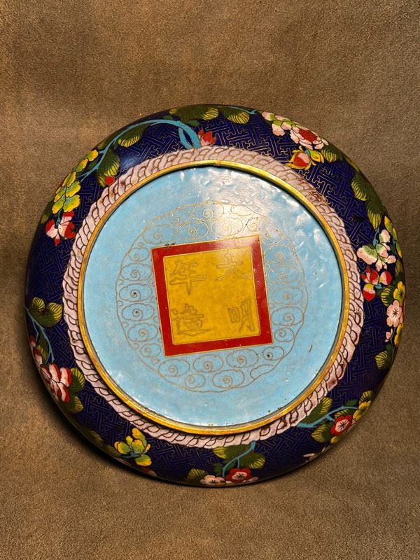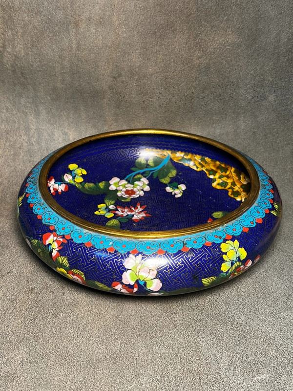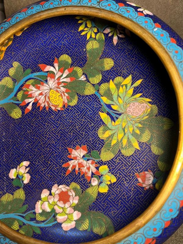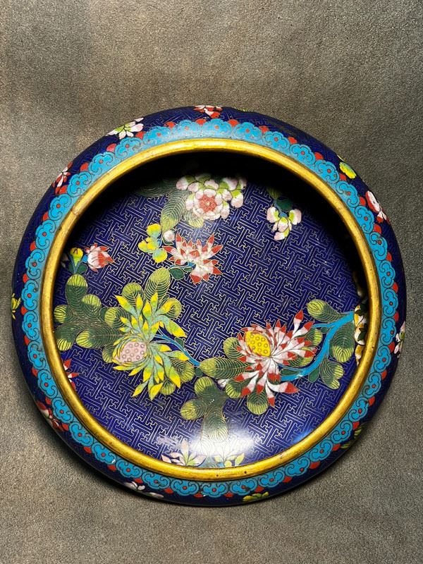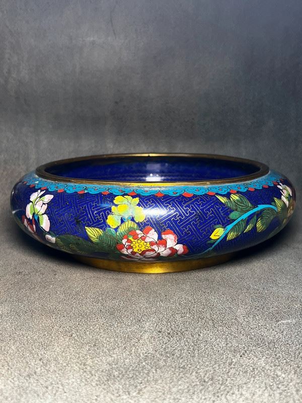 This water pot, crafted with a copper body, features a deep blue enamel ground richly decorated with scrolling floral motifs in vivid red, yellow, and white enamels. The rim is encircled with a turquoise ruyi-cloud border, enhancing its elegance. With its broad, rounded form and vibrant decoration, the piece reflects both the aesthetic charm of scholar’s desk objects and the refined artistry of cloisonné enamel.