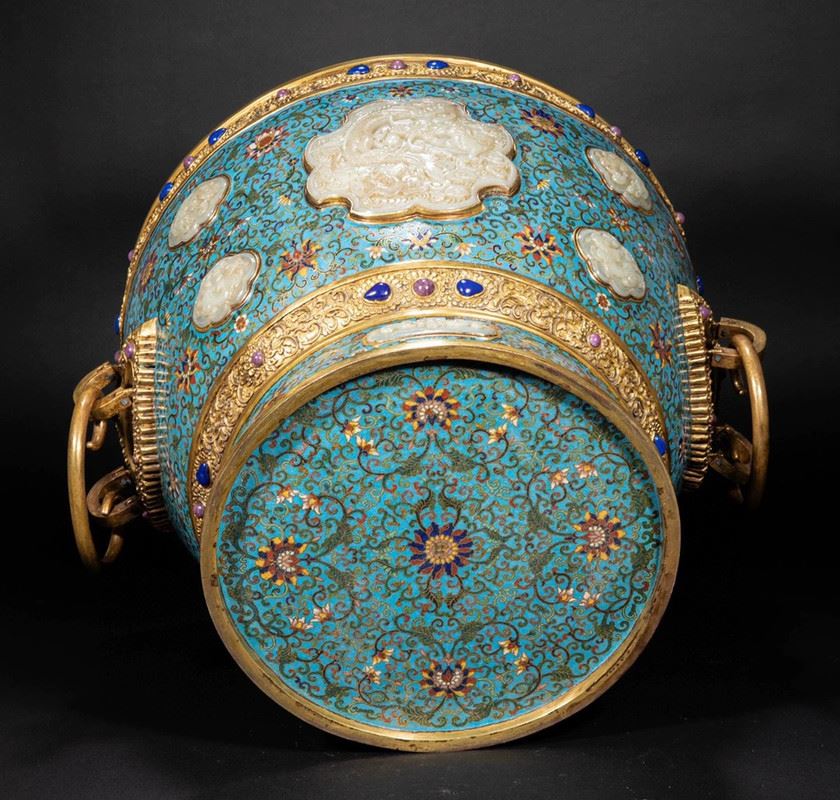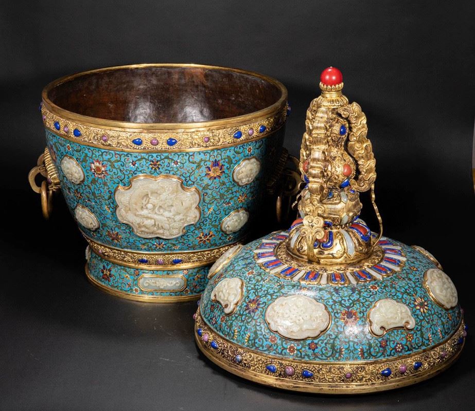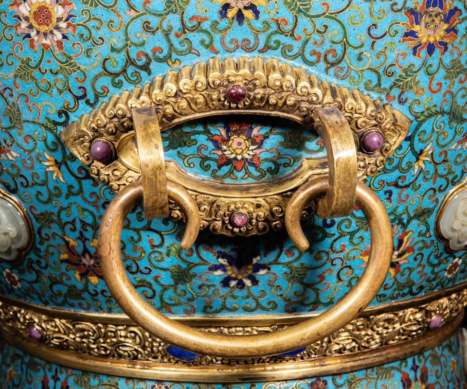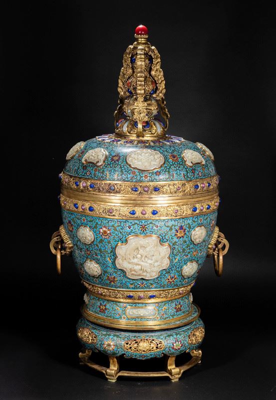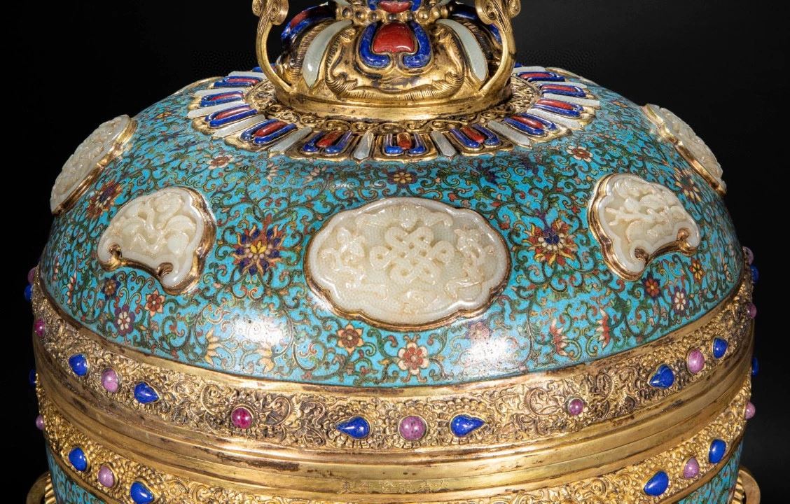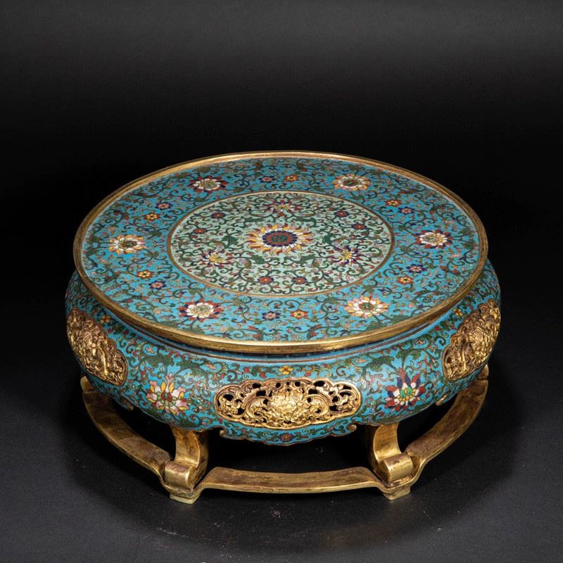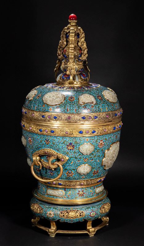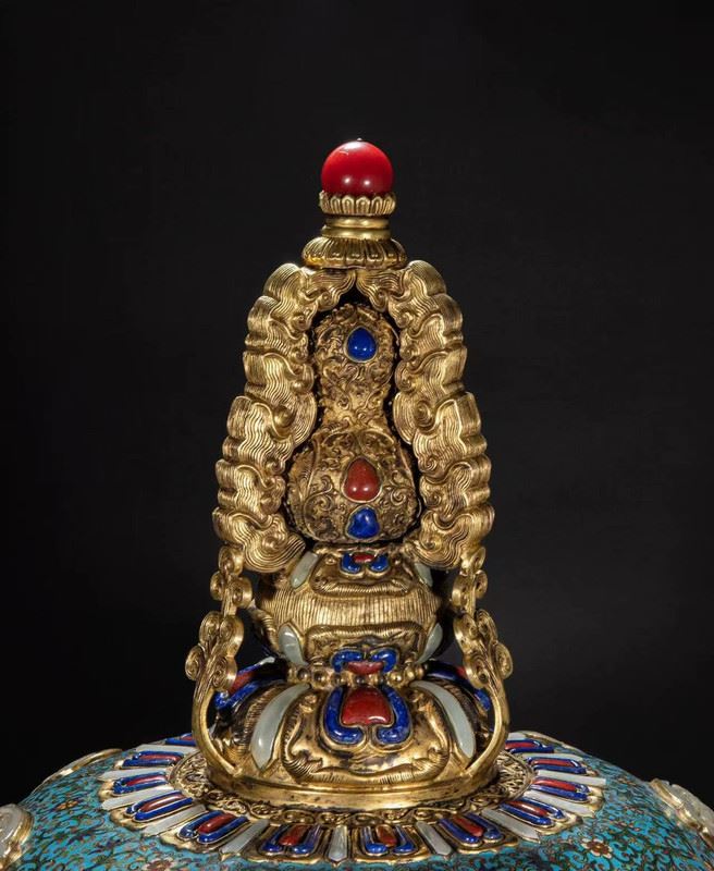 This cloisonné enamel butter lamp holder made from a copper base exemplifies superb craftsmanship and elegant design. The body is covered with exquisite enamel, showcasing vibrant colors and intricate details. The cloisonné technique enhances the layered appearance, and the embedded gemstones add a luxurious touch, elevating its artistic value. This butter lamp holder is not only a practical item but also an artistic treasure, rich in cultural significance and religious symbolism, especially in Tibetan Buddhism.