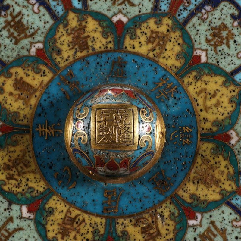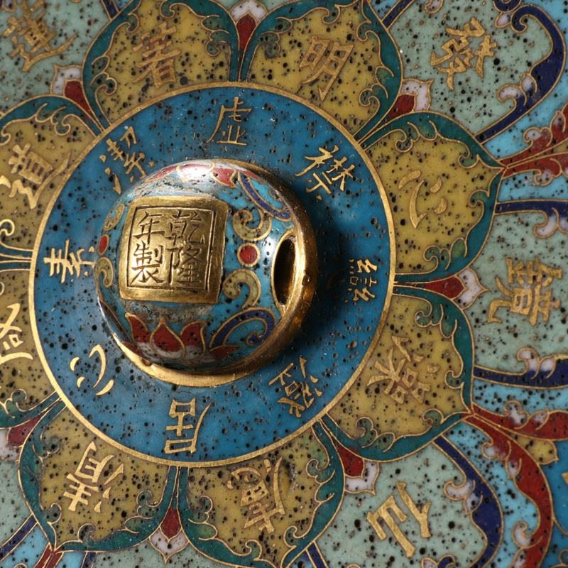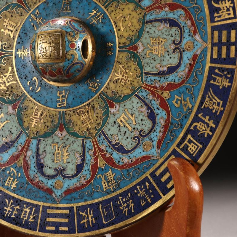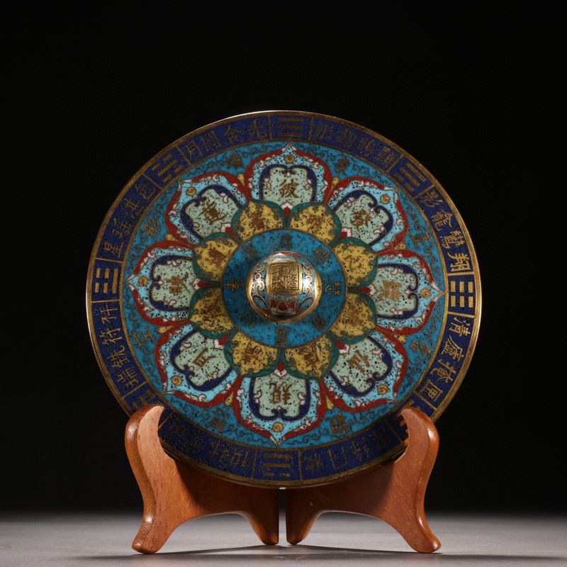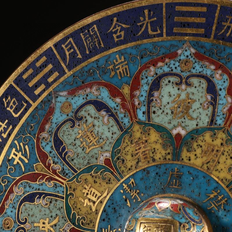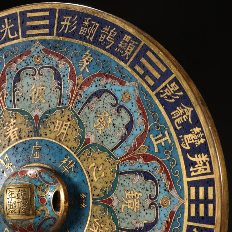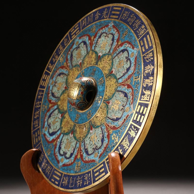 This gilded copper cloisonné enamel Bagua mirror combines ancient Chinese philosophy with traditional craftsmanship, with the intricate Bagua pattern symbolizing the balance of yin and yang and the harmony of the universe. The central decoration of the mirror, along with the surrounding cloisonné design, complements each other, featuring vibrant colors and rich layers. The use of gilded copper enhances the overall elegance, showcasing the superb craftsmanship of the Qing Dynasty and the deep cultural heritage.