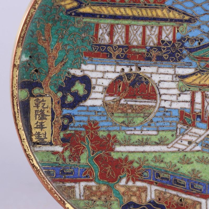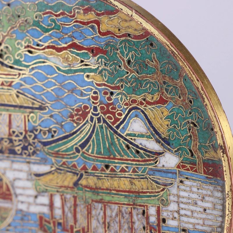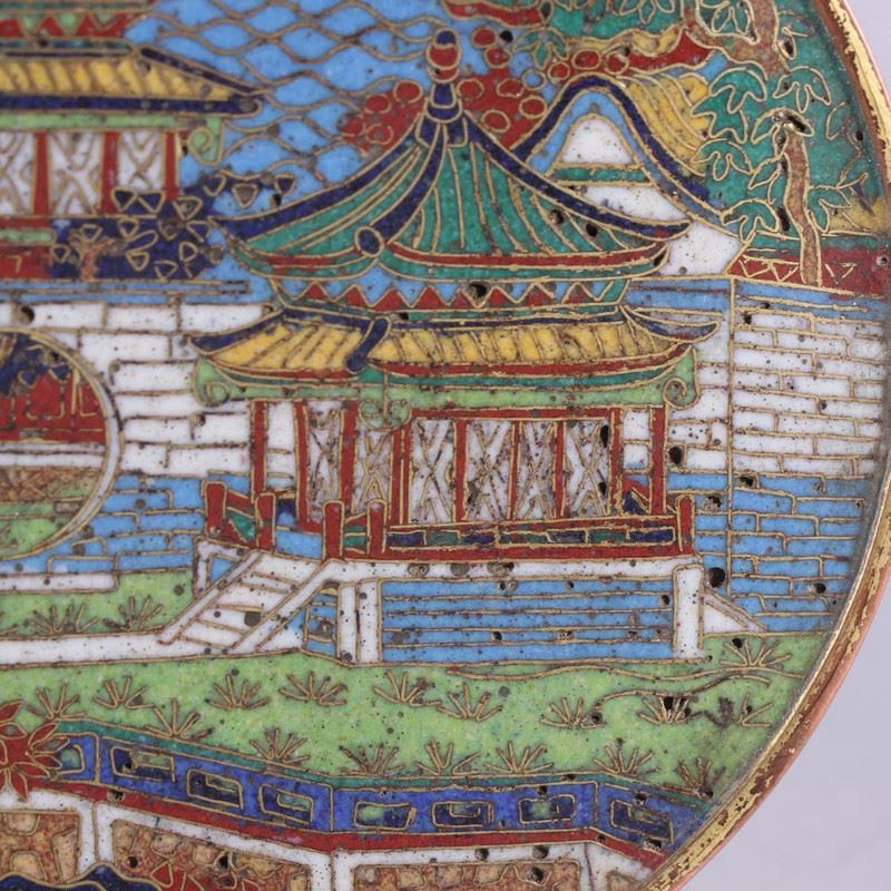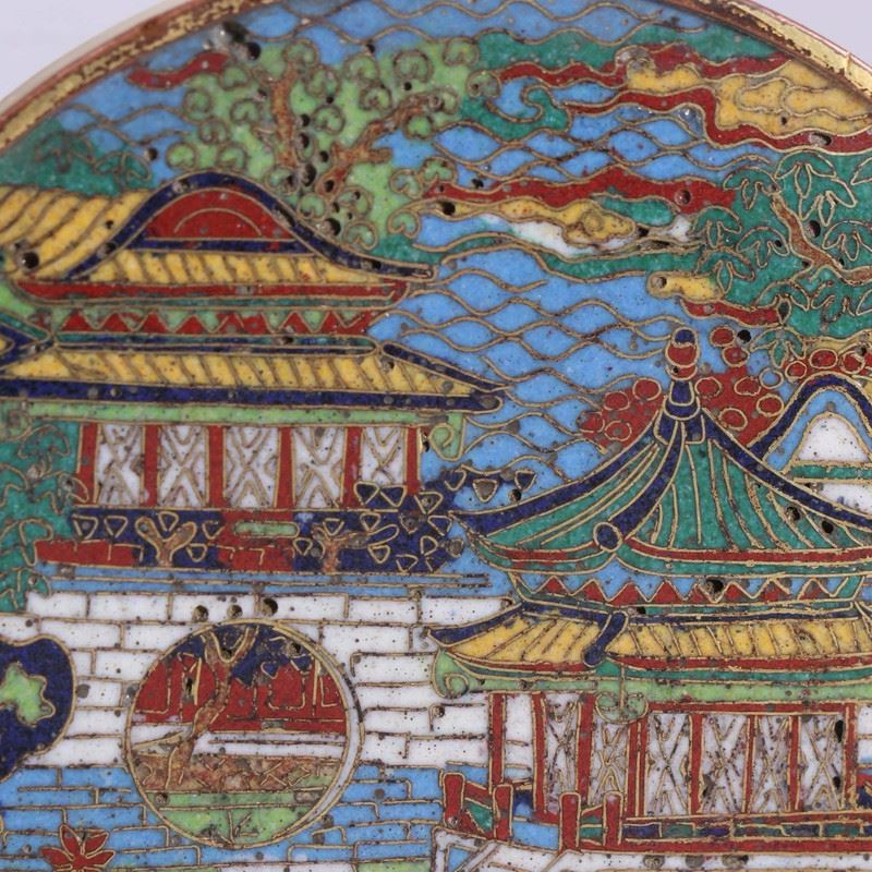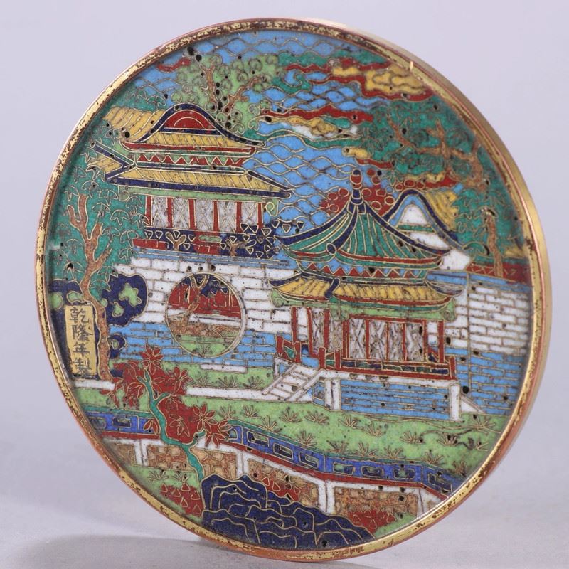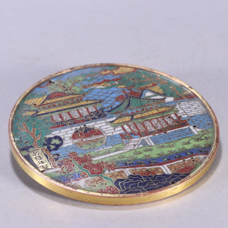 This gilded copper cloisonné mirror showcases a delicate landscape and pavilion design, blending traditional Chinese natural scenery and architectural aesthetics. The intricate cloisonné technique, combined with the gleaming gilded copper, enhances the overall elegance. The surrounding cloisonné enamel features rich colors, depicting the fine details of the landscape and the grandeur of the pavilions, embodying a perfect fusion of traditional art and craftsmanship.