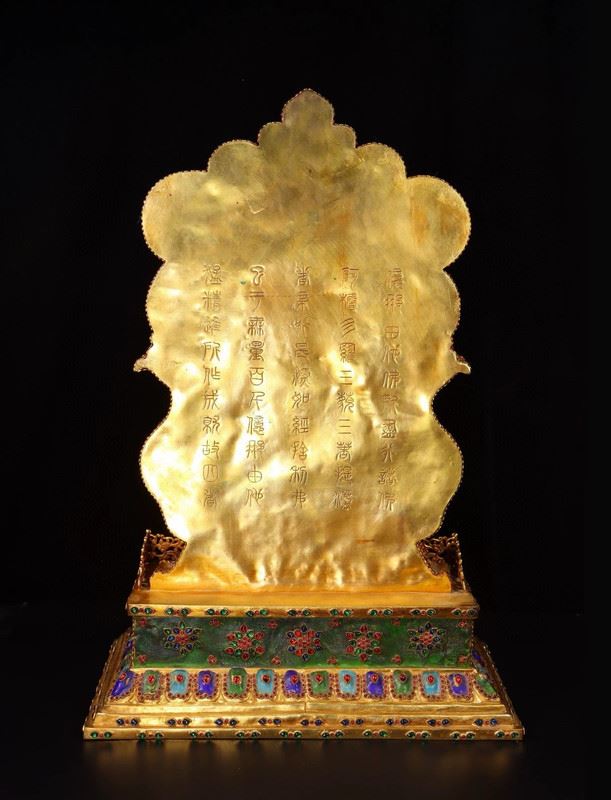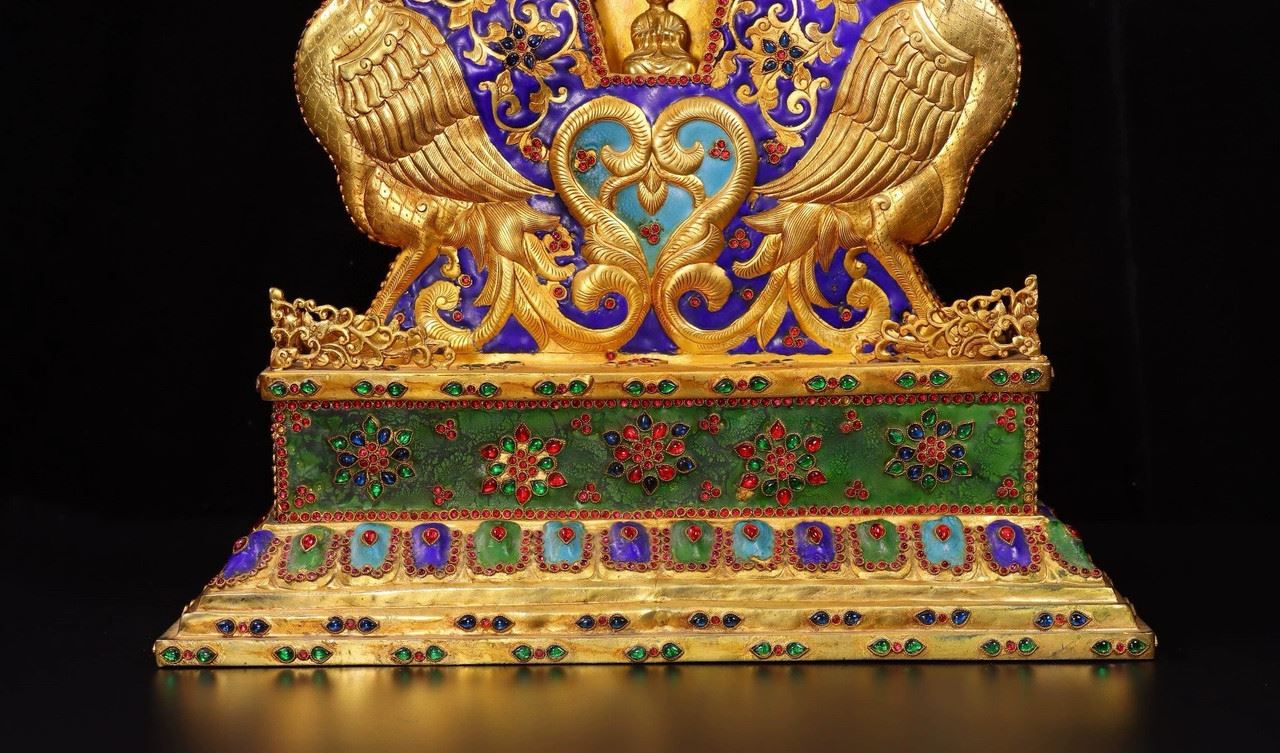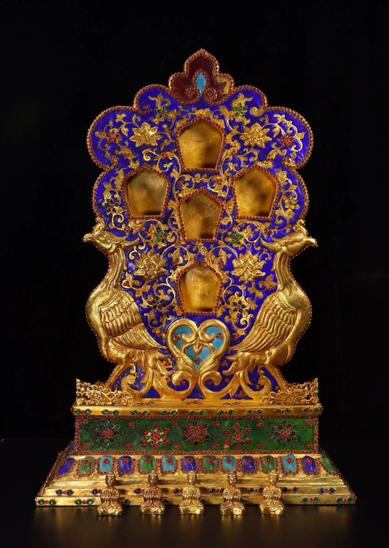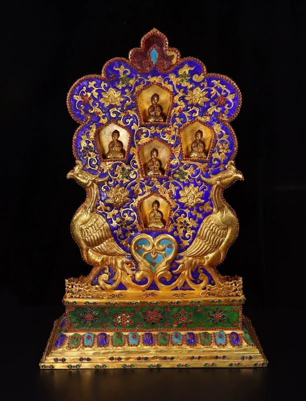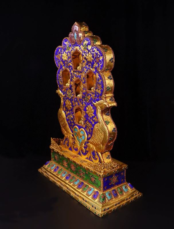 This cloisonné enamel and gilt Buddha shrine ornament showcases exquisite craftsmanship and solemn Buddhist symbolism. At the center, six Buddha figures are intricately inlaid, surrounded by delicate floral and cloud patterns, reflecting the fine detail and reverence of Buddhist art. The golden peacock figures on each side add a dynamic and auspicious touch, symbolizing eternity and good fortune. The base of the shrine is adorned with colorful gemstones, further enhancing its luxurious appeal. The combination of golden accents and blue cloisonné enamel creates a perfect balance, making this Buddha shrine both a spiritual symbol and a highly valuable art collectible.
