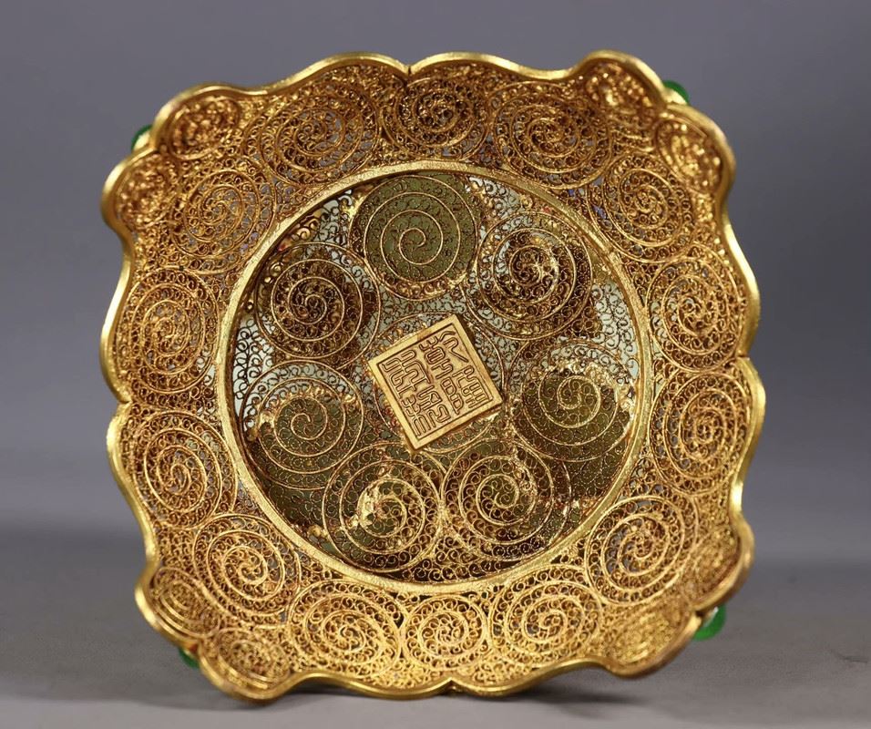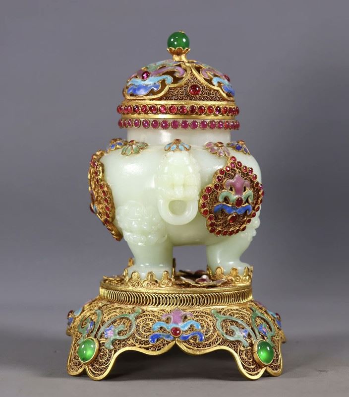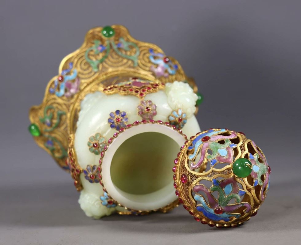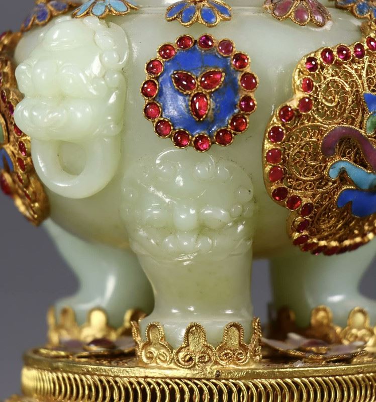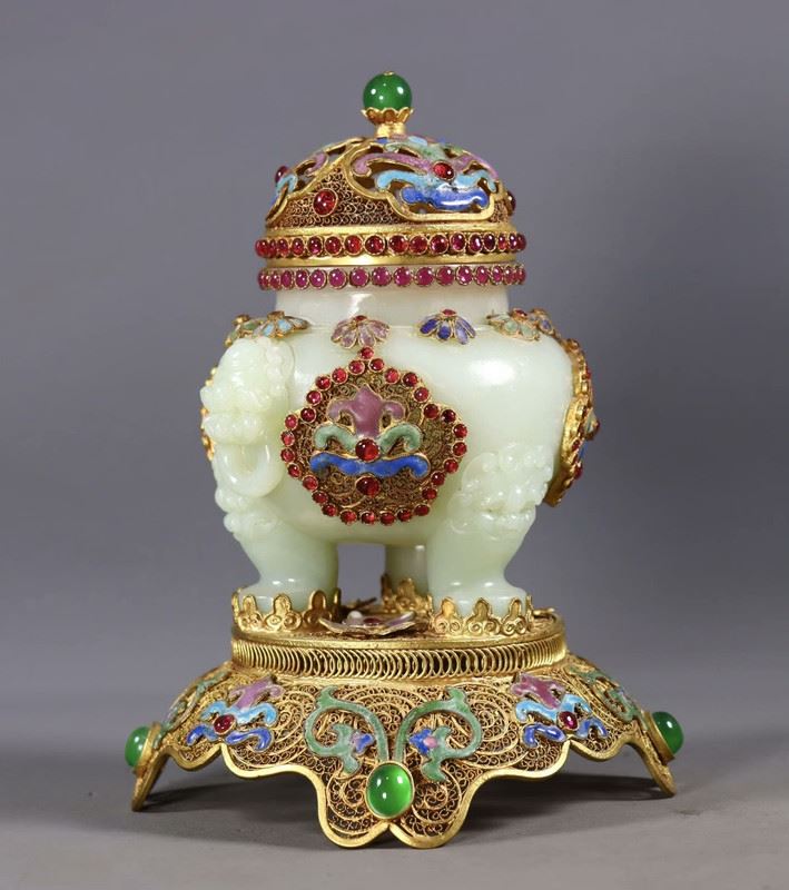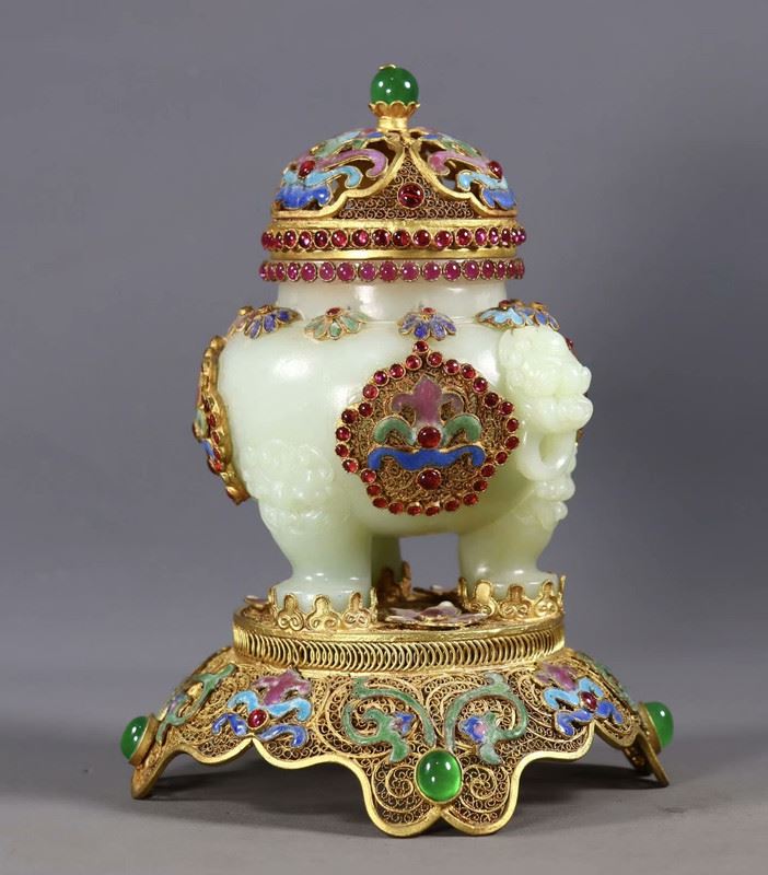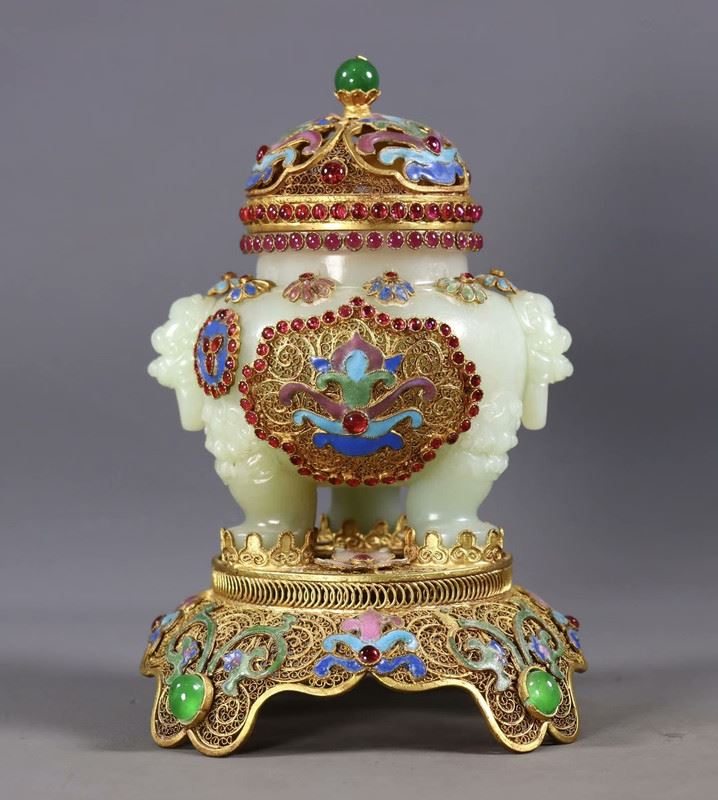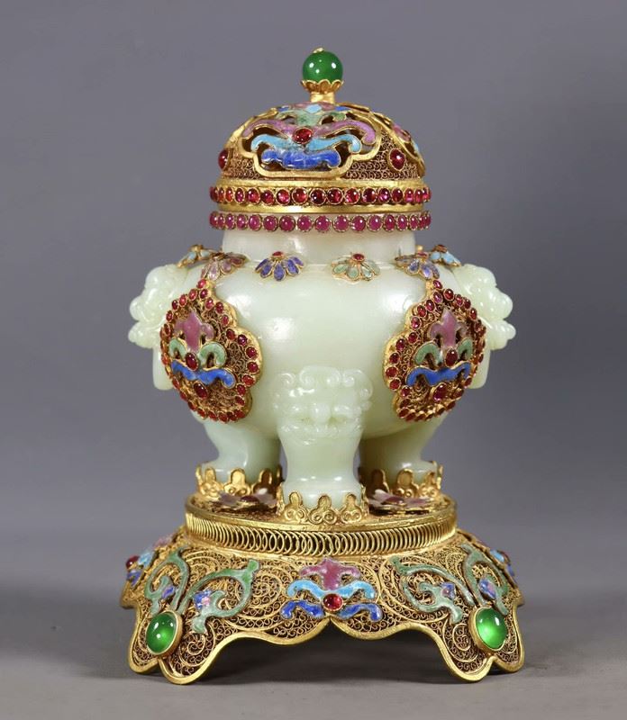 This exquisite incense burner features a high-quality jade base, adorned with fine cloisonné enamel craftsmanship, and set with dazzling gemstones. The elegant design is complemented by a gilded base, with intricate golden wire outlining the structure. The lid is crowned with a green gemstone, while the four corners of the base are decorated with lifelike qilin figures, symbolizing good fortune and showcasing remarkable craftsmanship. The combination of jade material and exceptional artistry highlights the ancient artisans' mastery, making this piece a highly valuable cultural relic.