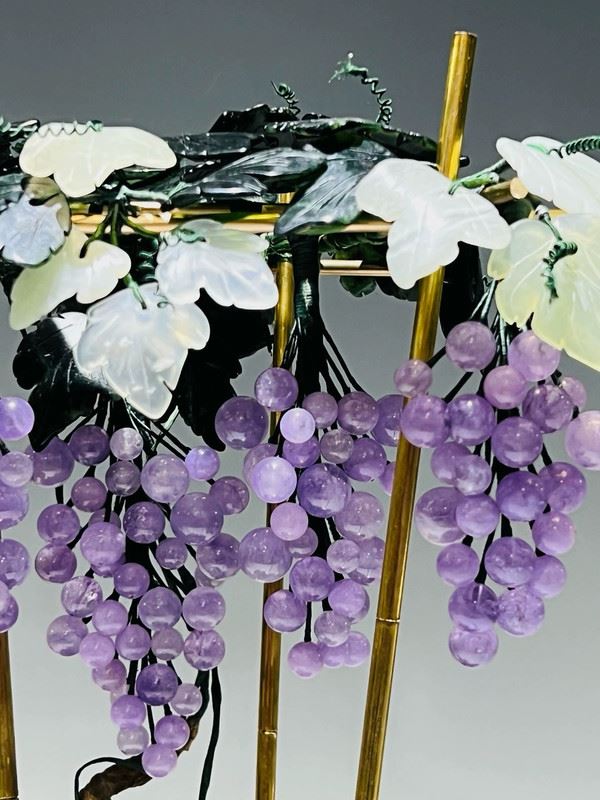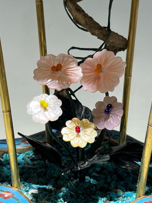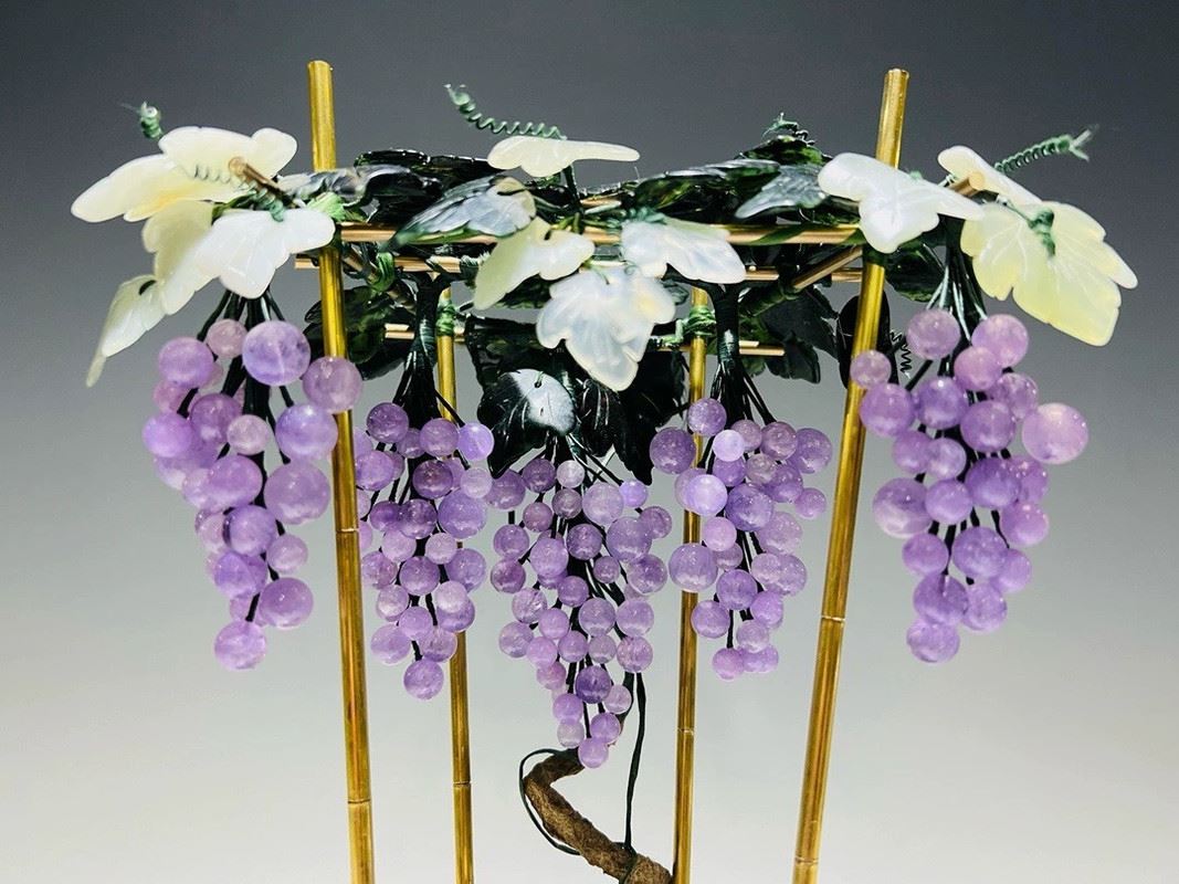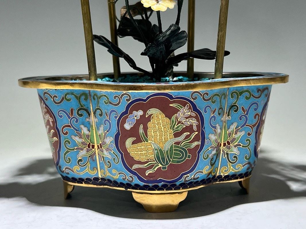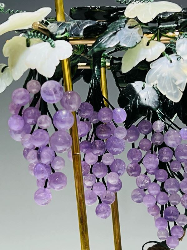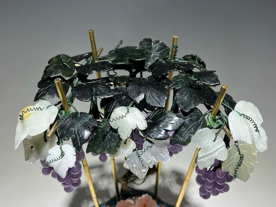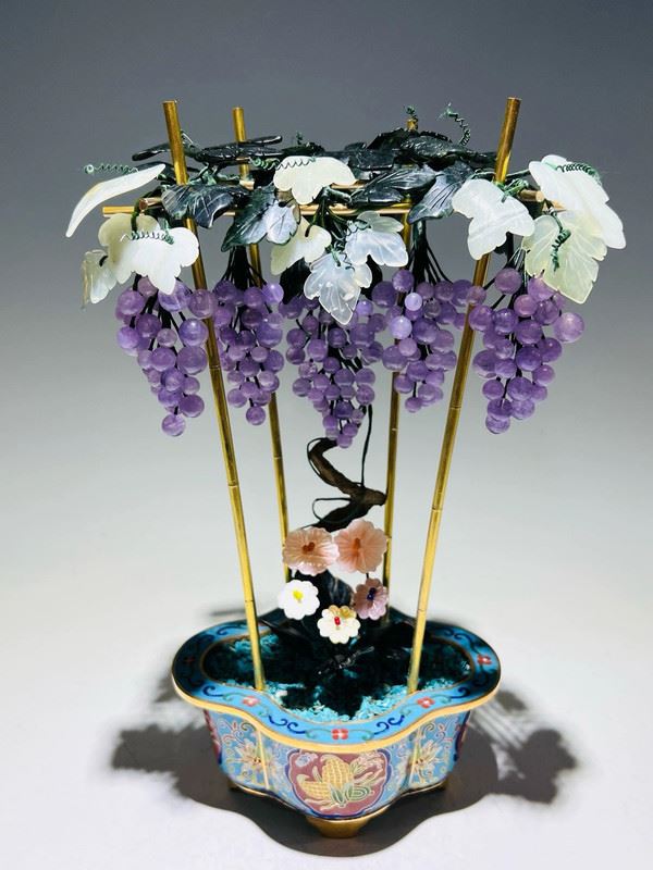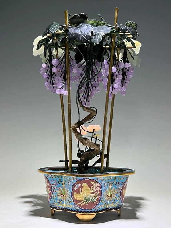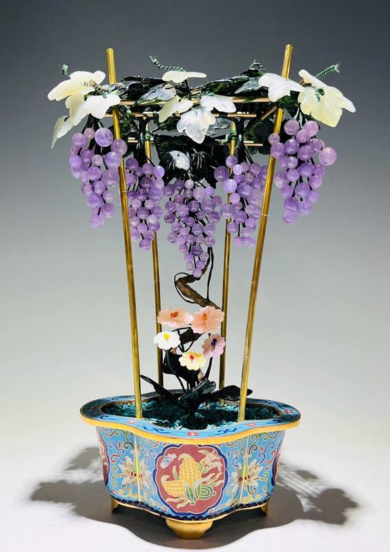 This exquisite bonsai features a cloisonné enamel planter adorned with colorful motifs, housing intricately crafted grapevines and flowers. The grapes are carved from translucent stones, while the blossoms and leaves are fashioned from jade, coral, and glass. Lifelike and elegant, the piece symbolizes prosperity and abundance, making it both a decorative treasure and a valuable collectible.