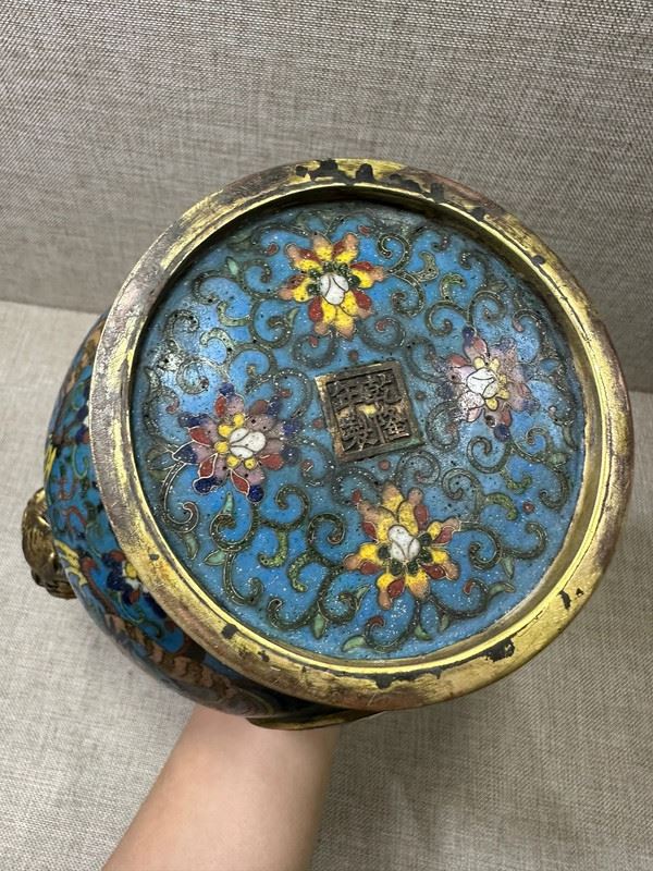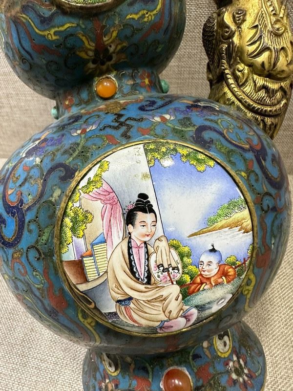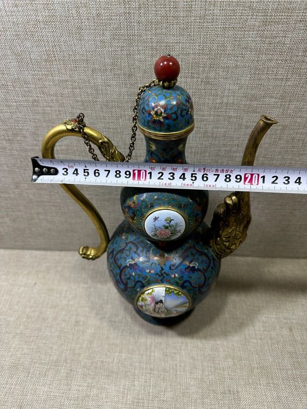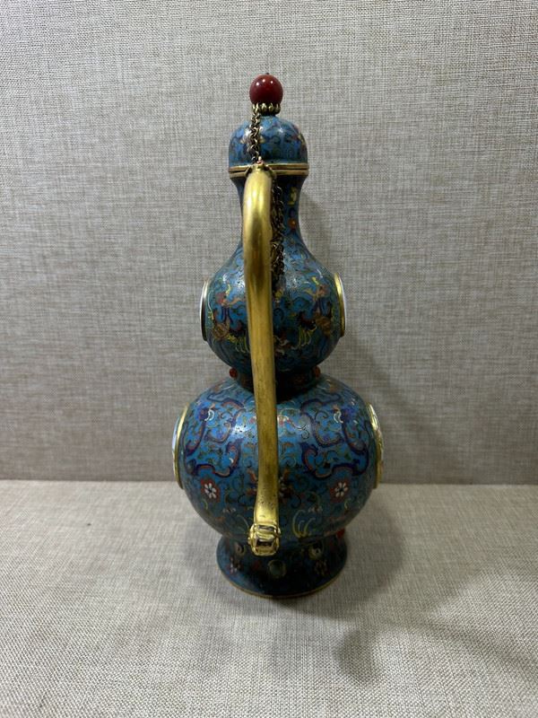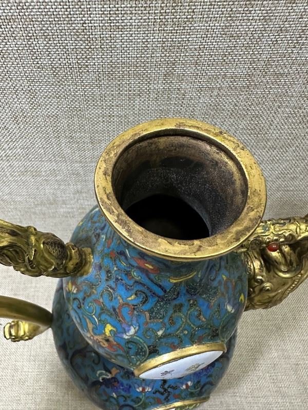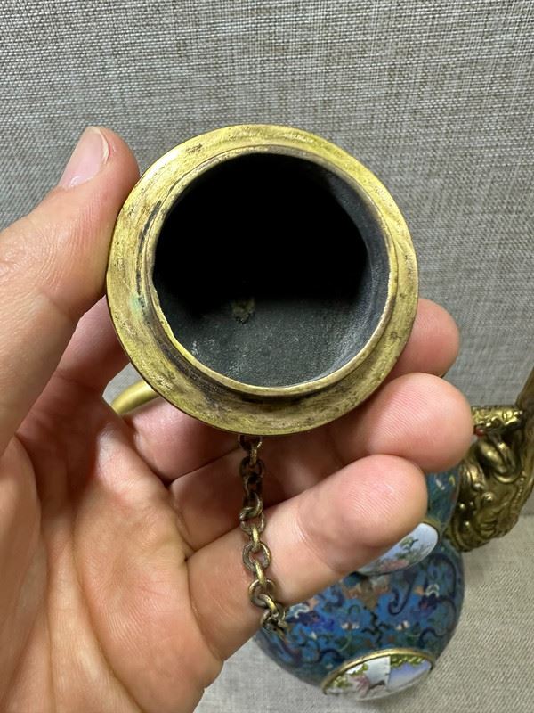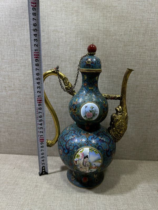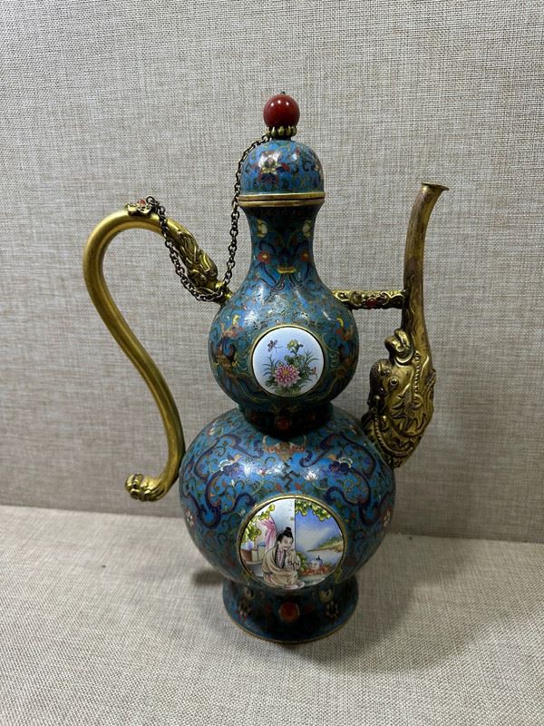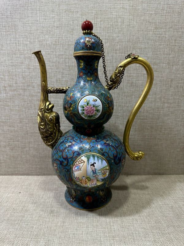 This wine ewer is crafted on a copper base in a double-gourd form, decorated with cloisonné enamel on a blue ground featuring scrolling floral motifs. The body is inset with painted enamel medallions depicting courtly figures and garden scenes, rendered with vivid detail. The spout is shaped as a gilt dragon head, while the curved gilt handle is elegantly attached with a chain to the lid, which is topped with a polished agate finial. Combining the brilliance of cloisonné enamel with the refinement of painted enamel, this piece exemplifies both functionality and decorative artistry, making it a fine and valuable collectible.