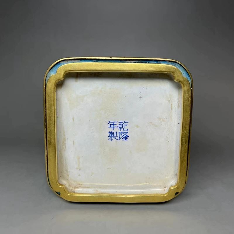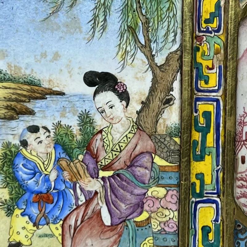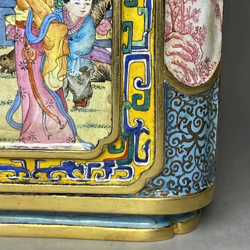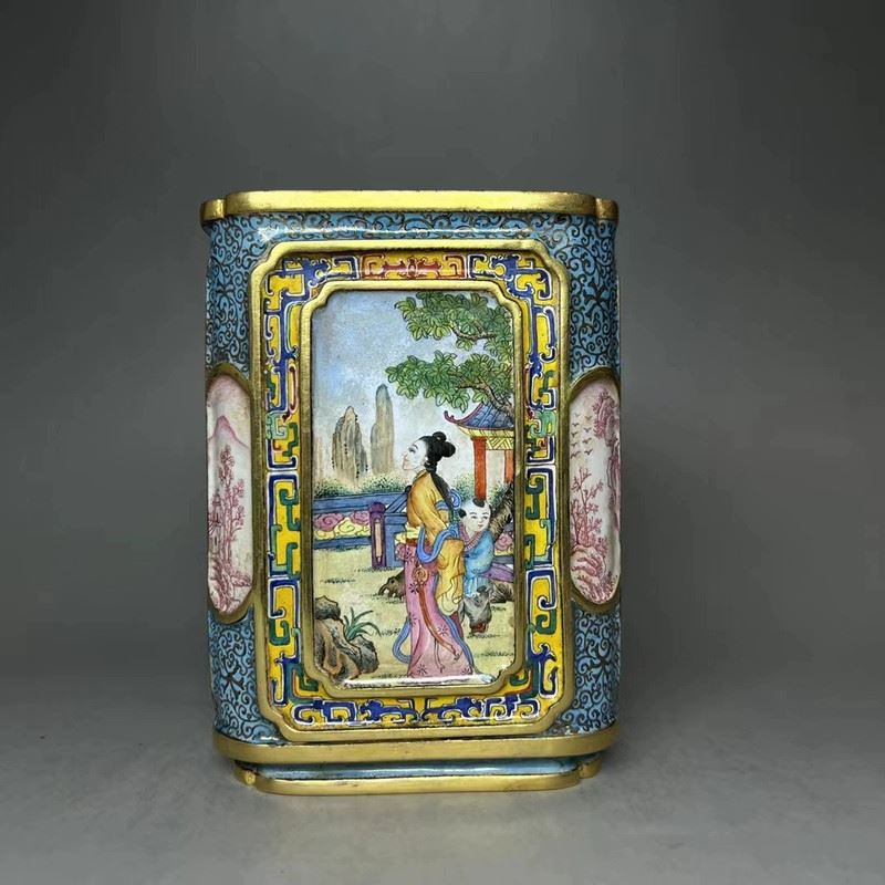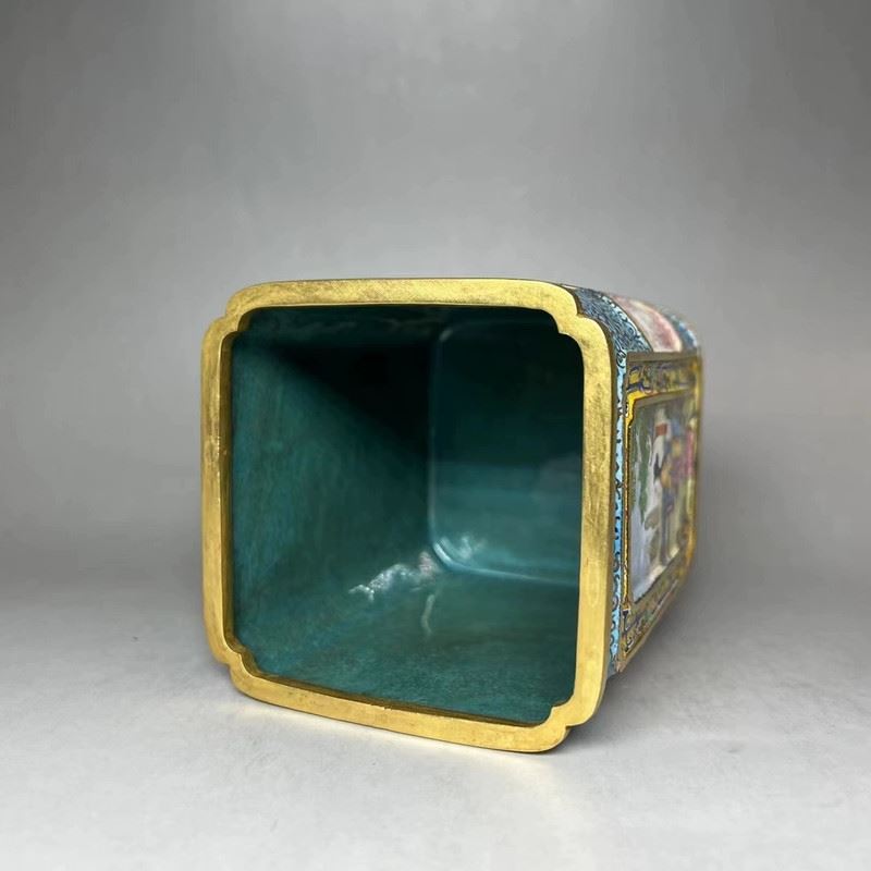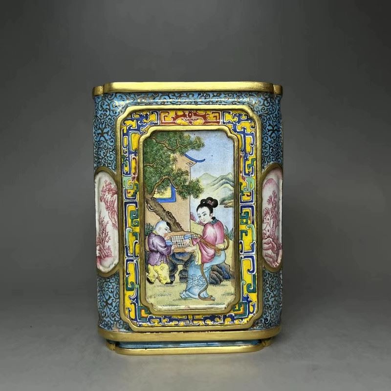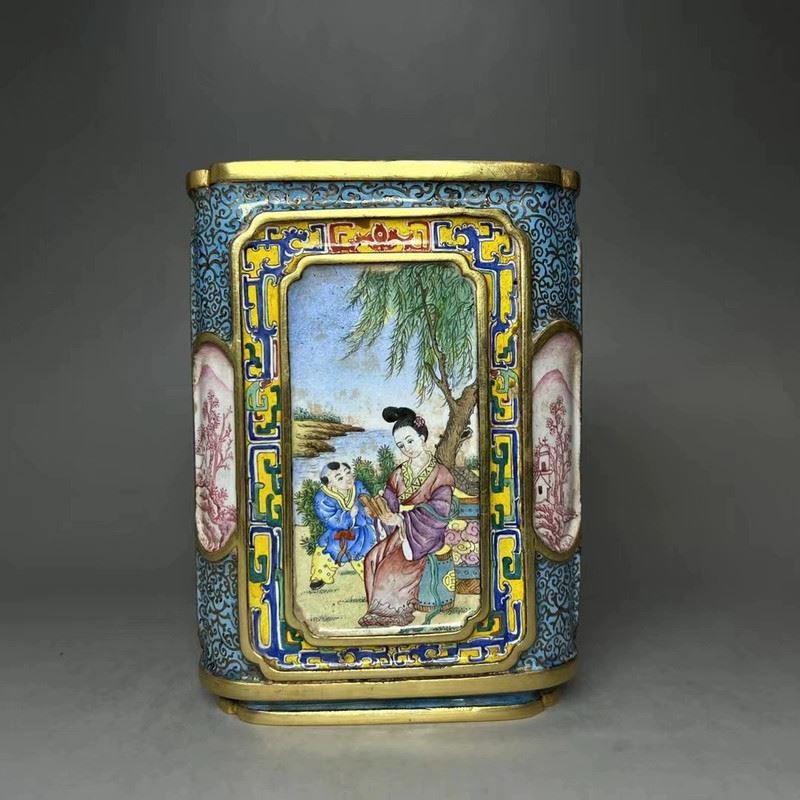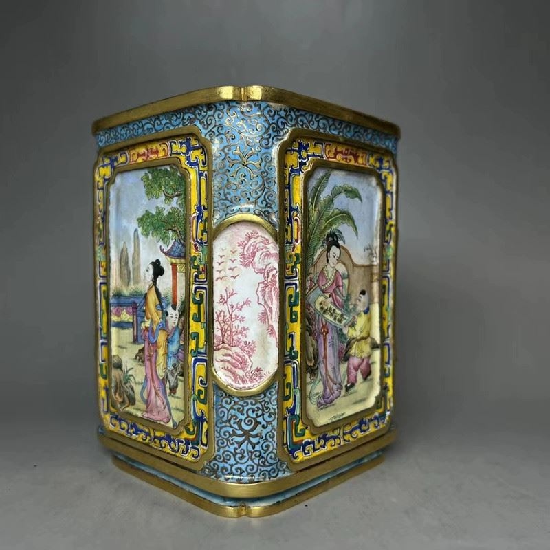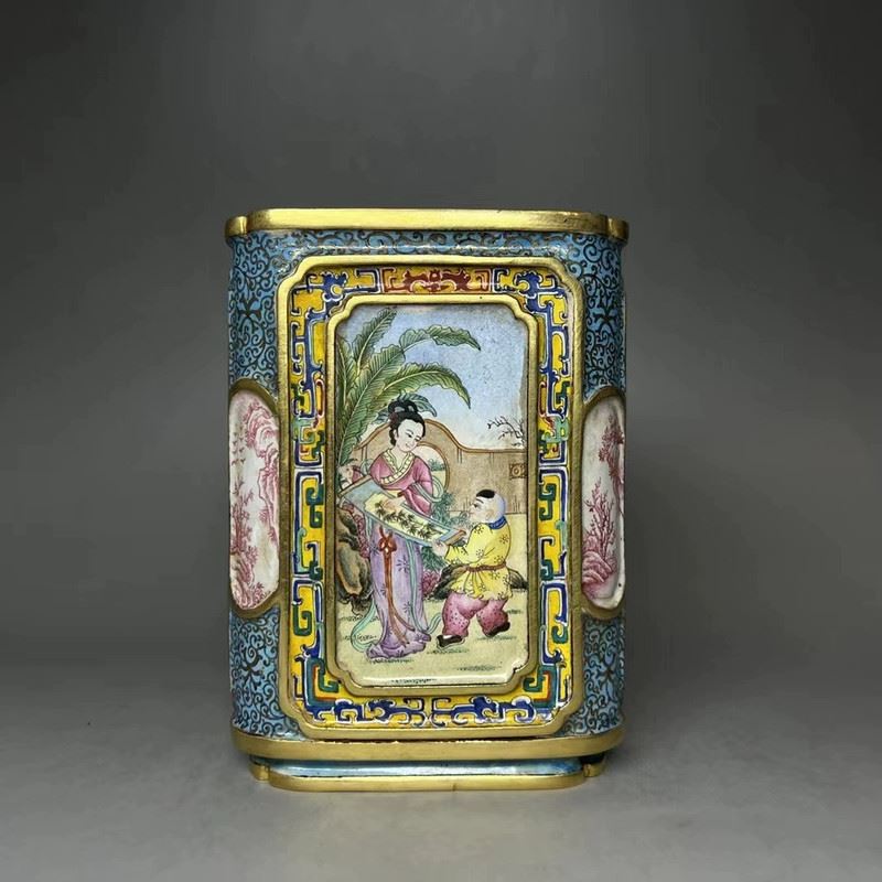 This copper cloisonné enamel brush pot features exquisite craftsmanship and a fine depiction of traditional figures. The square pot is constructed with a delicate copper base, adorned with gilded accents, and surrounded by vibrant cloisonné patterns. The central enamel panel depicts a vivid scene of a well-dressed woman conversing with a man, set against a garden backdrop, in the delicate style of Qing Dynasty court paintings. The combination of gilded elements and colorful enamel creates an elegant and harmonious design, making this piece both functional and a highly valuable collectible with significant artistic merit.