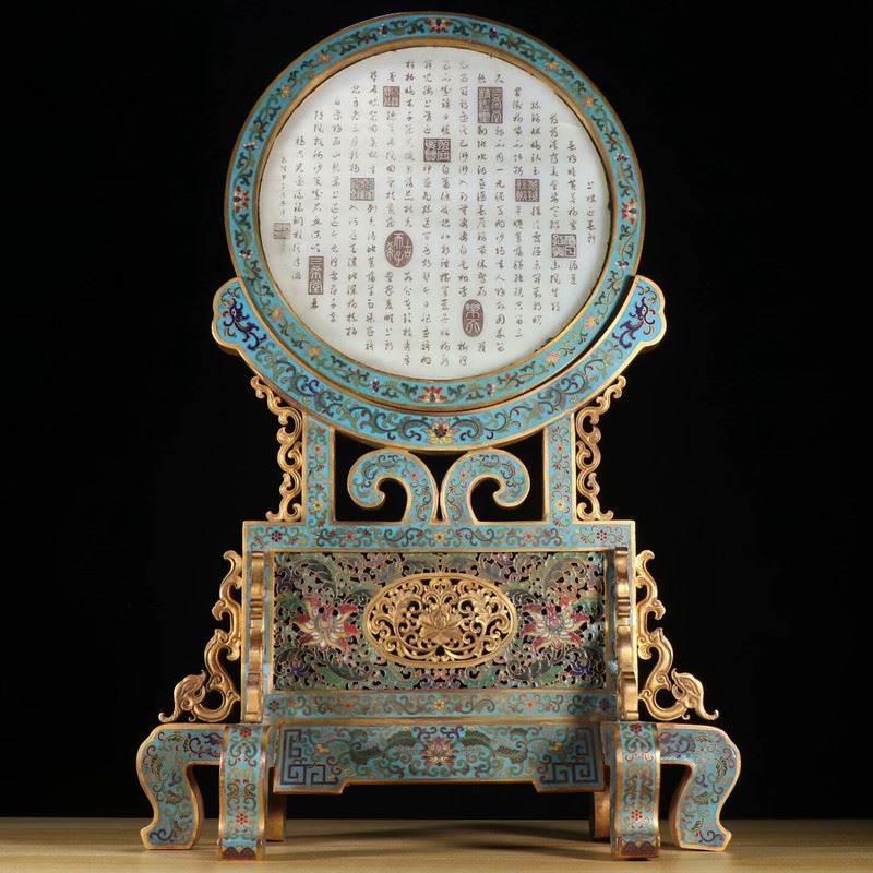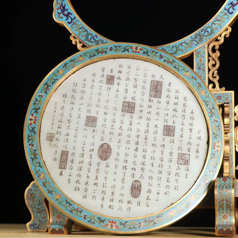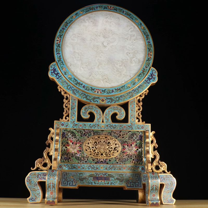 This Cloisonné enamel screen inlaid with Hetian jade features intricate craftsmanship. The centerpiece is a beautifully carved Hetian jade with a dragon motif, symbolizing good fortune and strength. The outer frame, adorned with the elegant cloisonné enamel technique, showcases vibrant colors and detailed patterns, blending traditional and modern craftsmanship. This artwork is not only a decorative piece but also a symbol of Chinese cultural heritage.