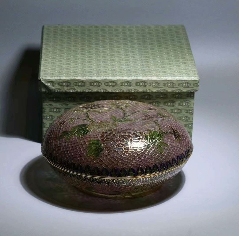 This copper base transparent cloisonné enamel lid box merges exquisite metal craftsmanship with the unique charm of transparent enamel. The patterns on the lid make clever use of transparent enamel techniques, creating a rich layering of colors that allow light to shine through, producing a noble and elegant visual effect. This piece is both practical and highly collectible, showcasing the brilliance of traditional Chinese copper cloisonné enamel art.
