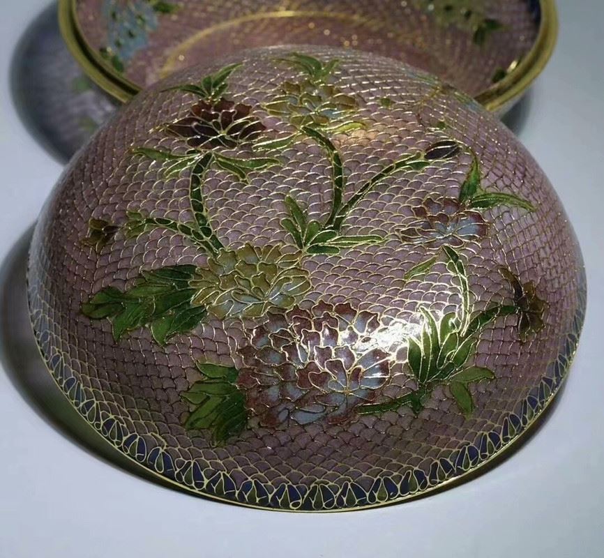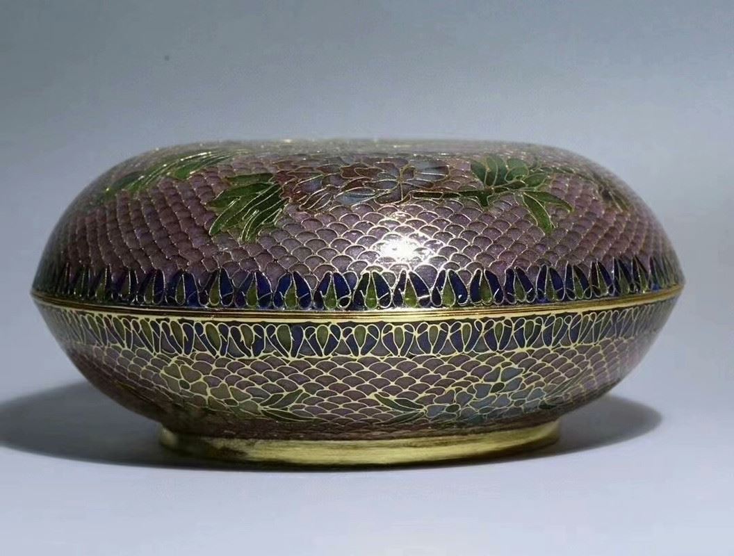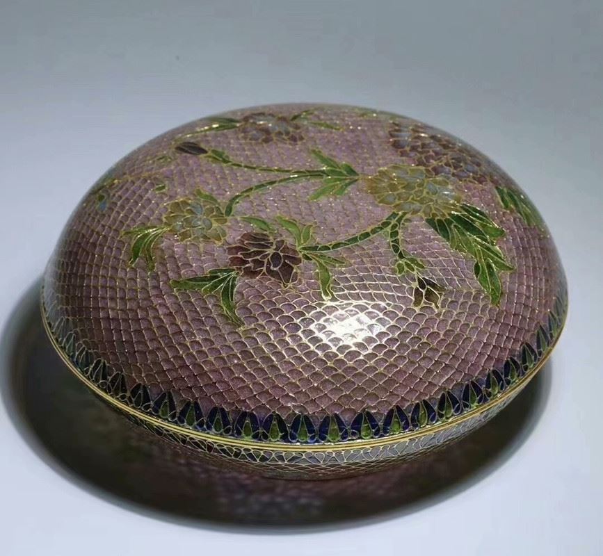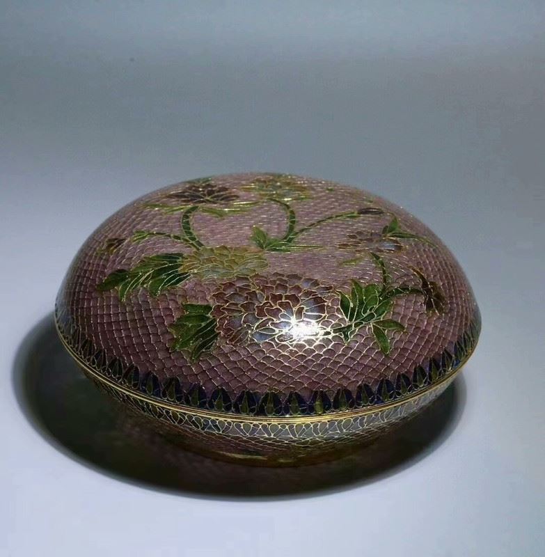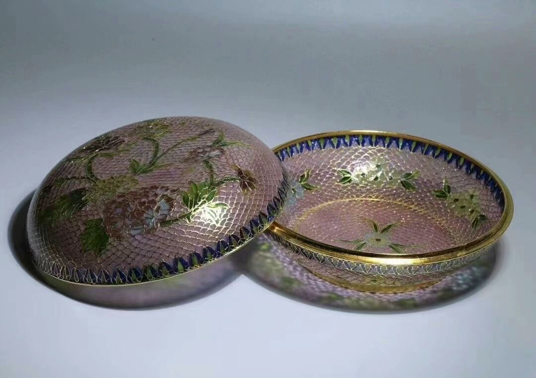 This copper base transparent cloisonné enamel lid box merges exquisite metal craftsmanship with the unique charm of transparent enamel. The patterns on the lid make clever use of transparent enamel techniques, creating a rich layering of colors that allow light to shine through, producing a noble and elegant visual effect. This piece is both practical and highly collectible, showcasing the brilliance of traditional Chinese copper cloisonné enamel art.