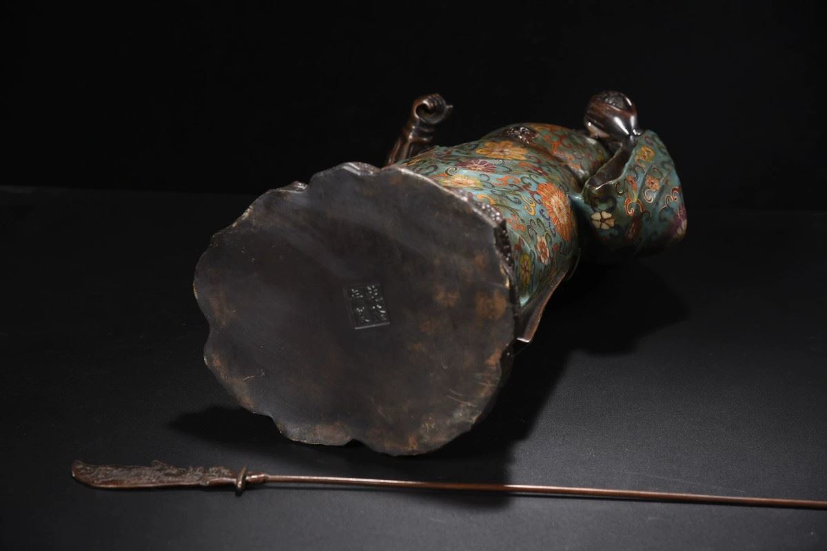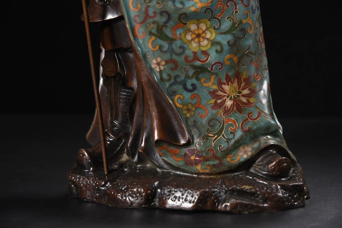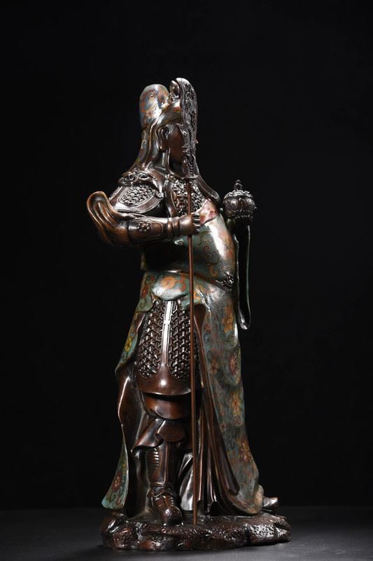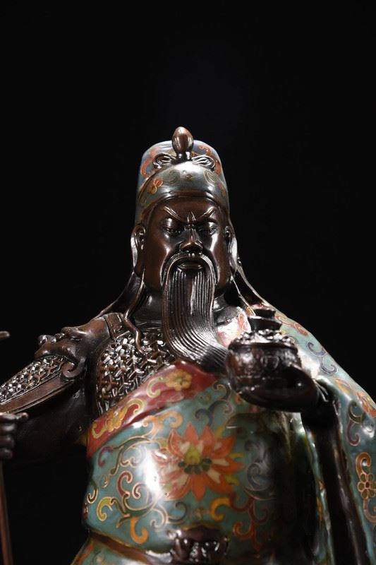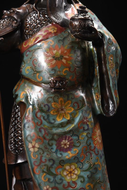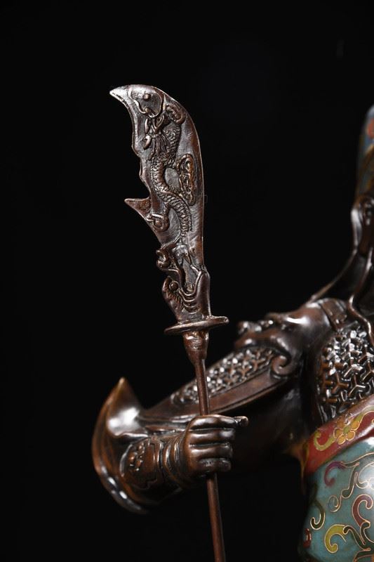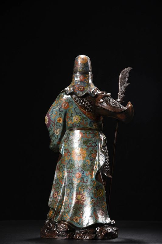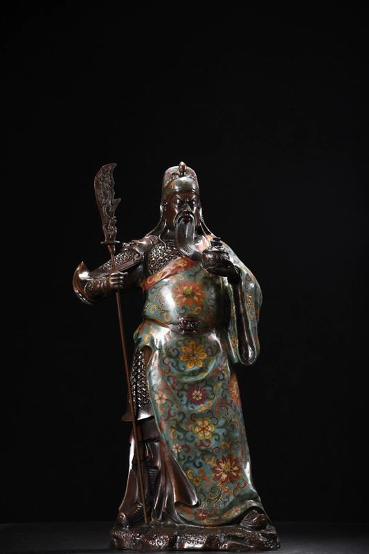 This cloisonné figure of Guan Yu stands in majestic form, clad in armor and a floral-patterned robe with brilliant colors and exquisite craftsmanship. Holding the Green Dragon Crescent Blade, Guan Yu’s steadfast gaze and commanding presence embody loyalty, righteousness, and valor. The body is richly decorated with scrolling floral motifs, enhancing its splendor while showcasing the artistry of cloisonné. As both a cultural and spiritual symbol, this statue serves as a guardian figure and a distinguished collectible work of art.