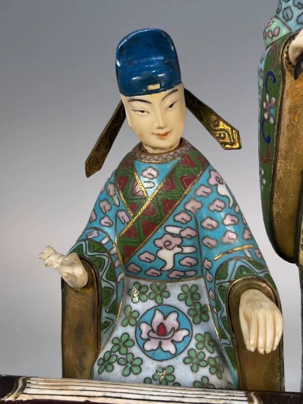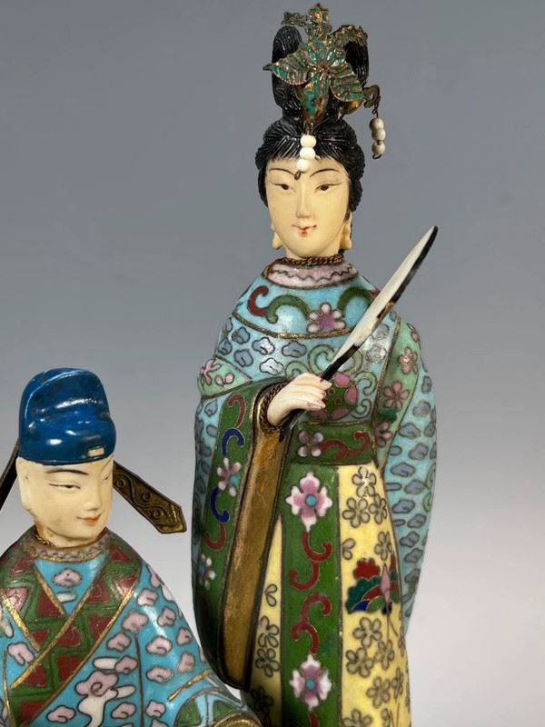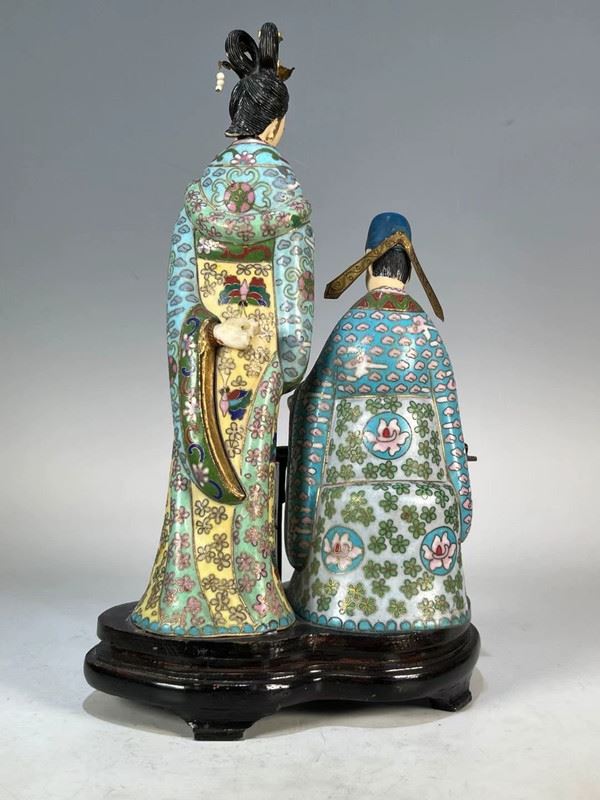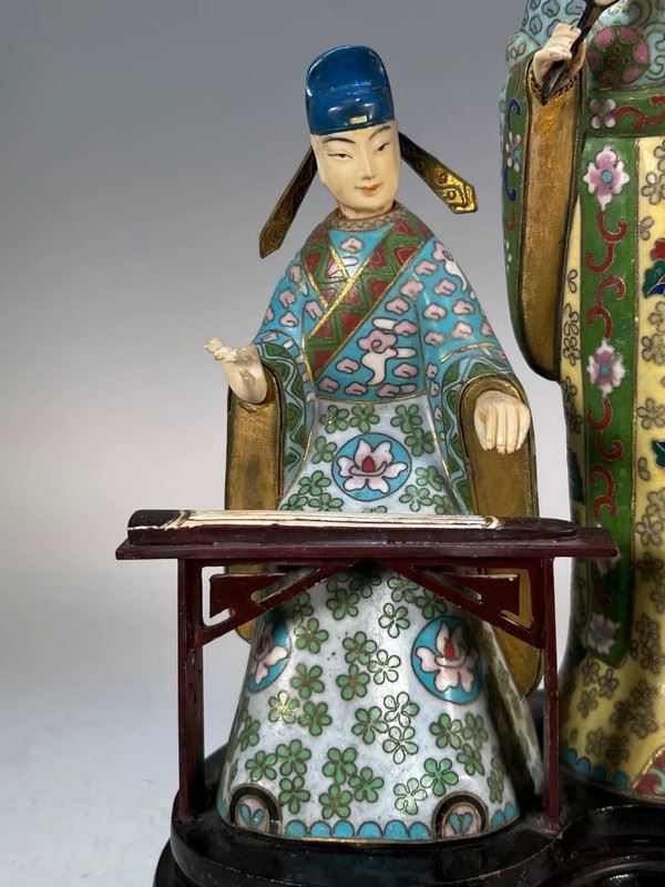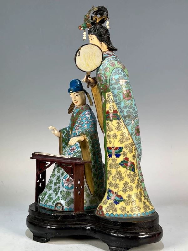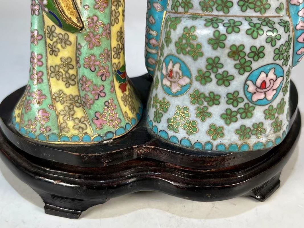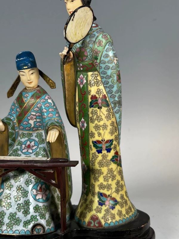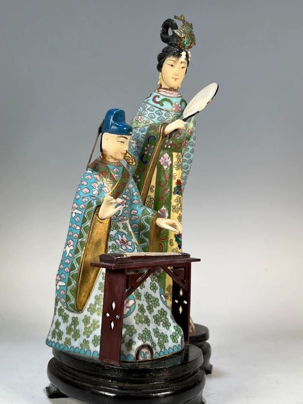 This cloisonné enamel figurine depicts an elegant scene of a lady and a scholar. The lady holds a round fan, adorned with a pearl-detailed headdress, exuding grace and refinement. The scholar, seated at a table, wears a blue cap and intricately decorated robes. The figures’ garments are crafted in vibrant cloisonné enamel, featuring floral and butterfly motifs symbolizing auspiciousness. Mounted on a lacquered wooden stand, this piece embodies exquisite craftsmanship and traditional Chinese decorative artistry, making it highly collectible and visually captivating.