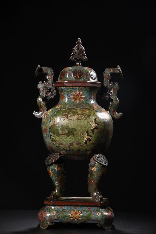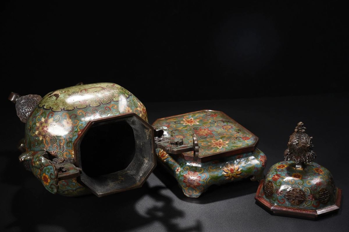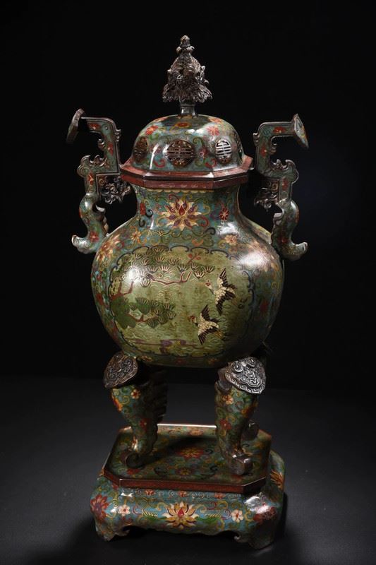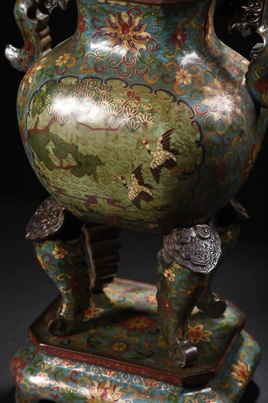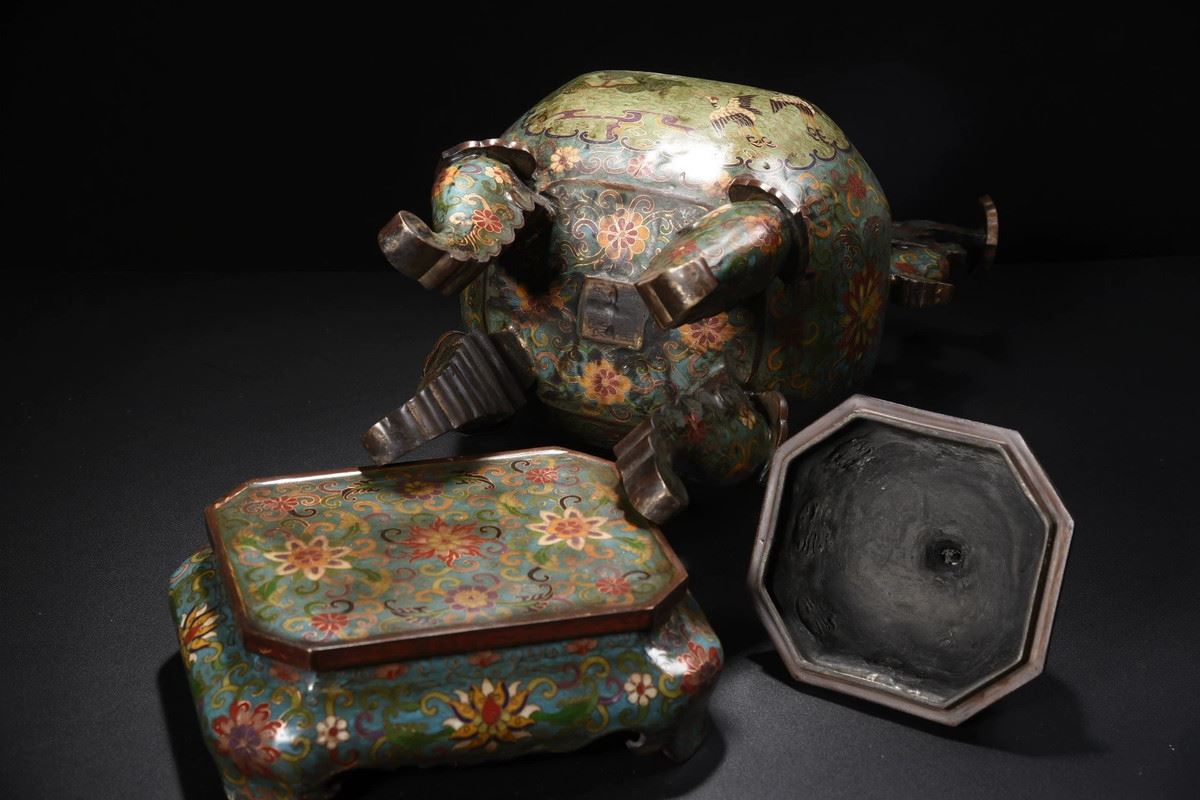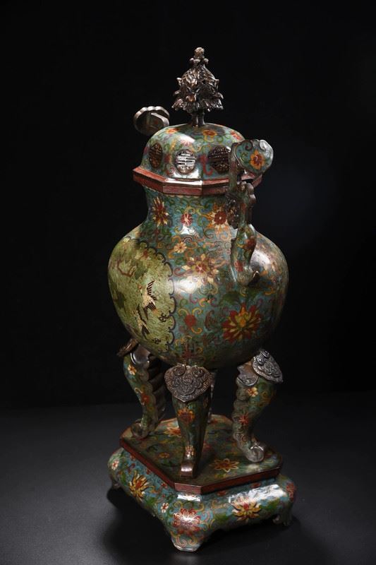 This cloisonné incense burner features exquisite floral patterns, showcasing the unique charm of traditional cloisonné craftsmanship. Its three-legged design and intricate decorations make it not only functional but also a valuable piece of art, perfect for displaying in a collection of Chinese art.