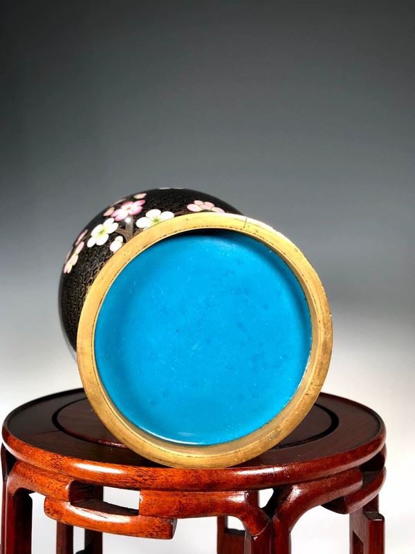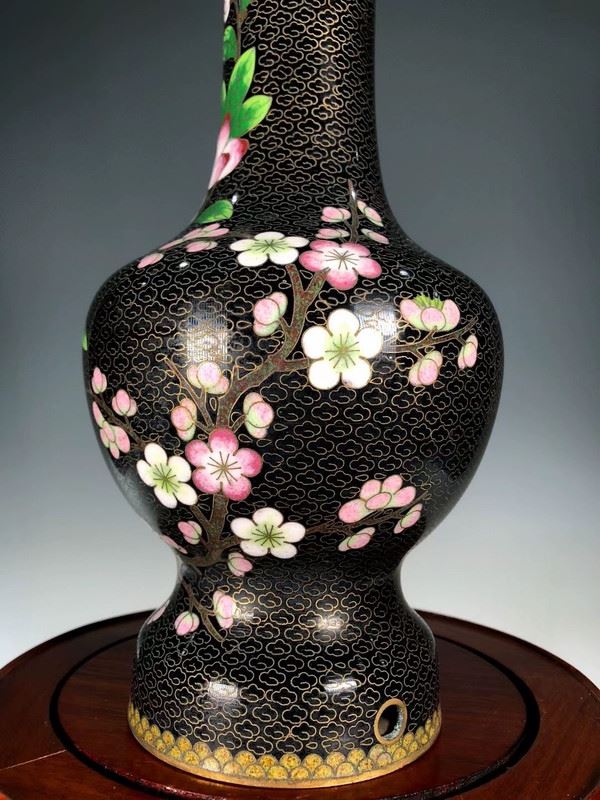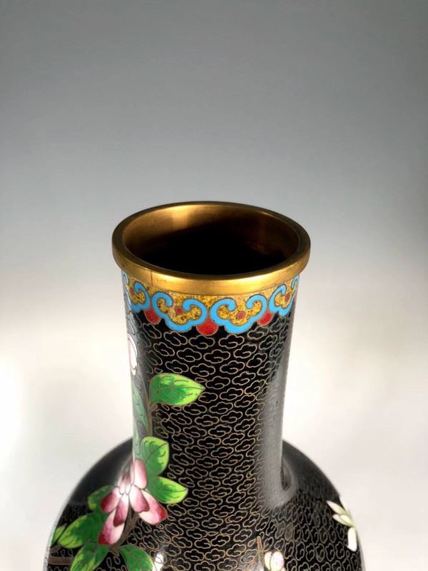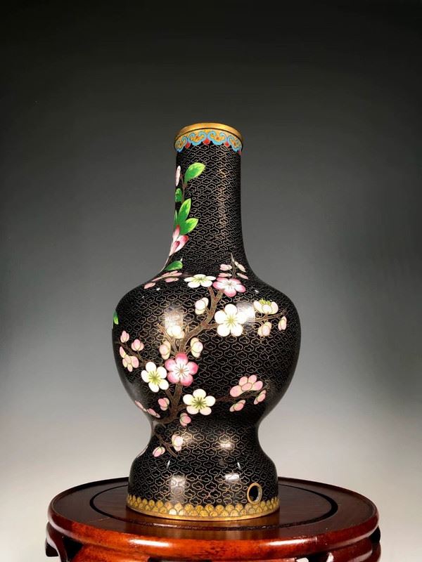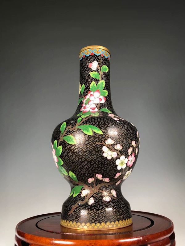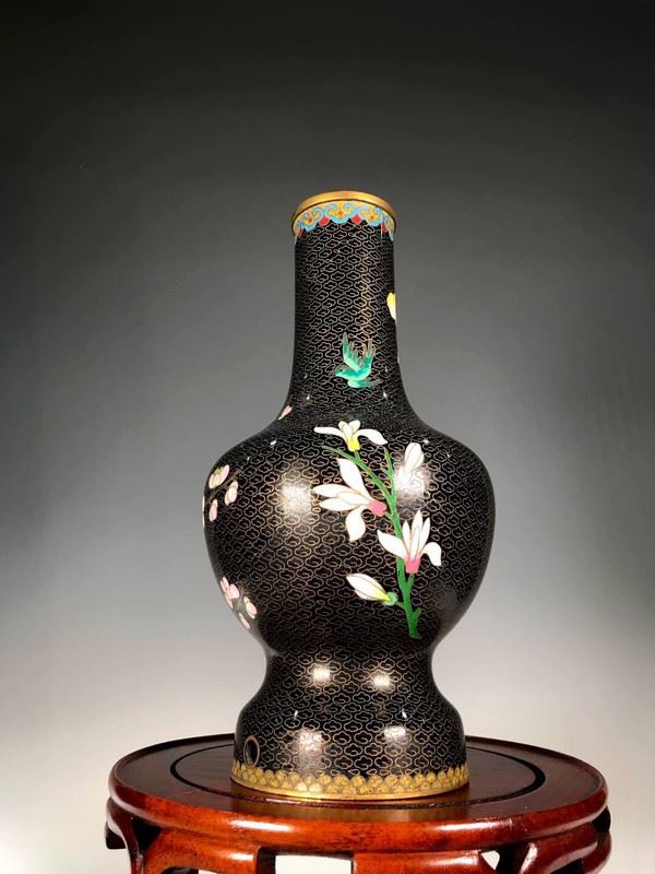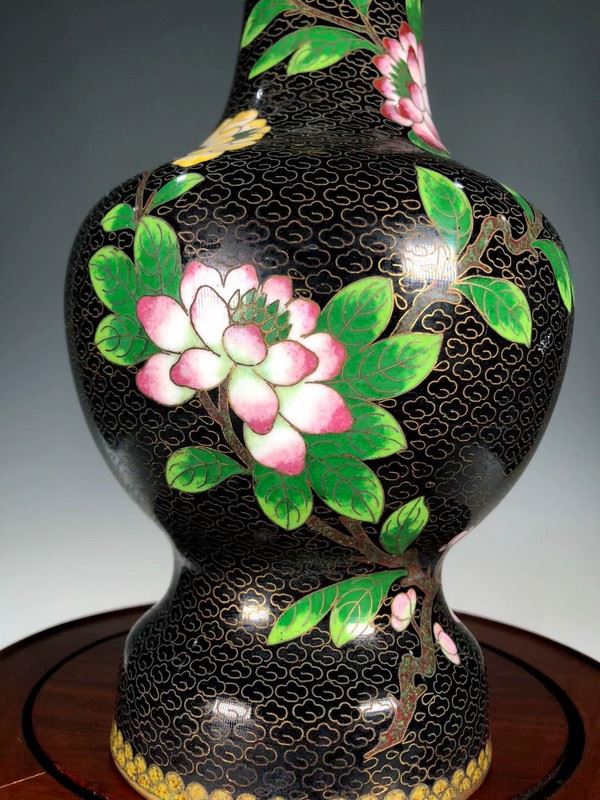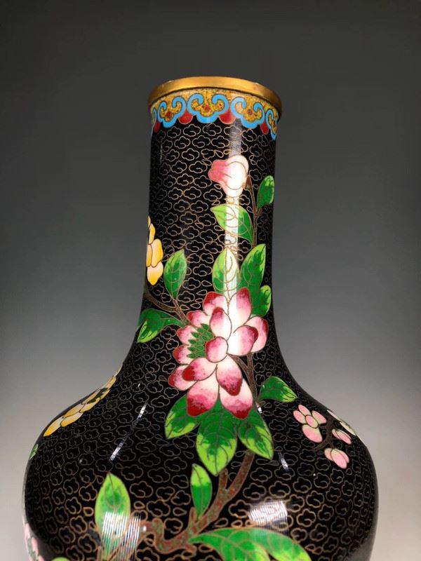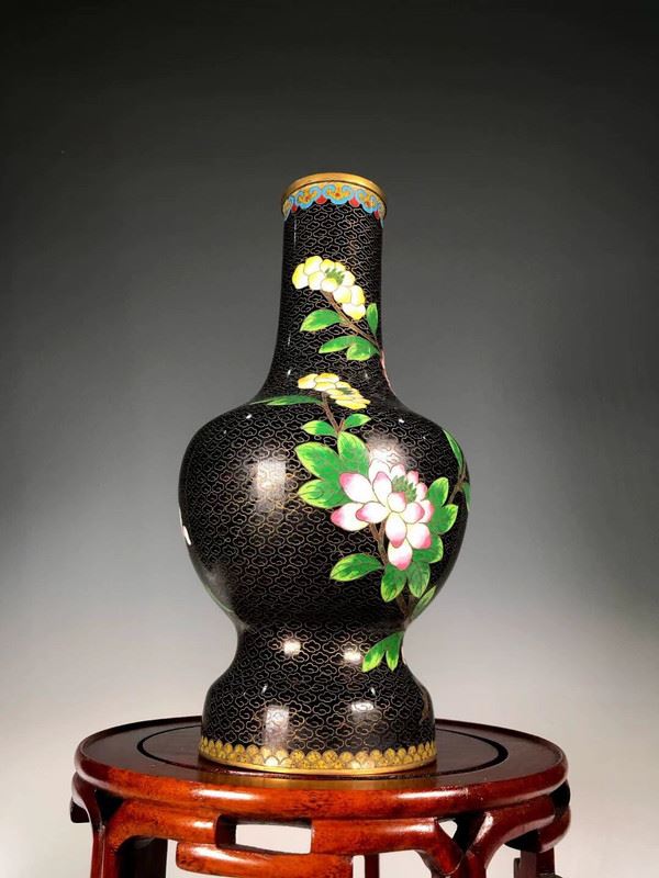 This exquisite cloisonné floral vase features a deep black base adorned with vibrant floral patterns. The delicate flowers and fresh leaves reflect exceptional craftsmanship. Its unique shape and color combination give the piece a distinctive artistic appeal.