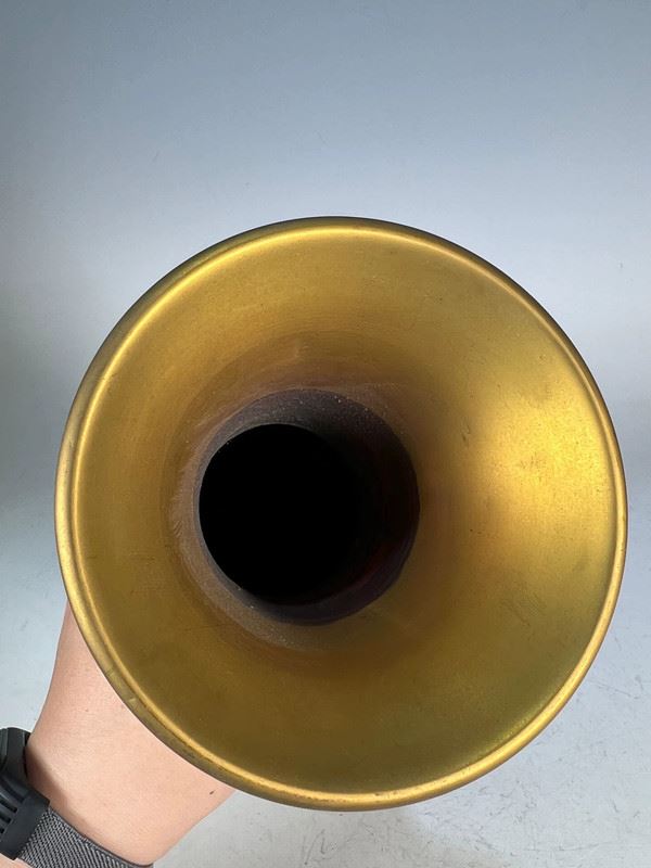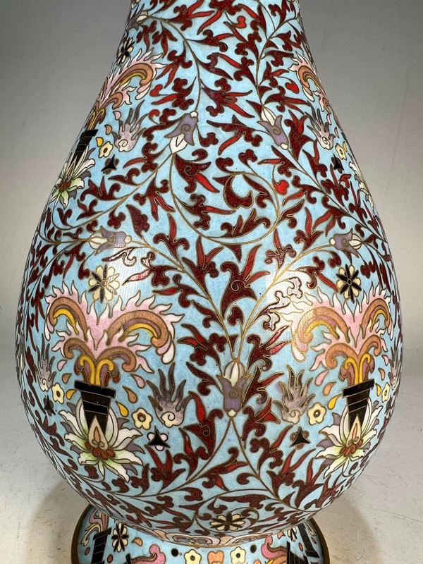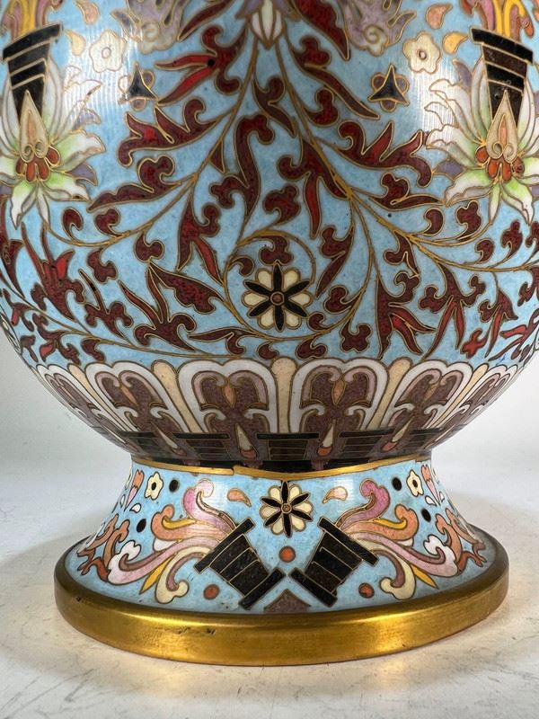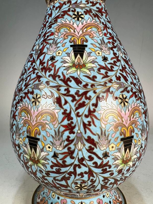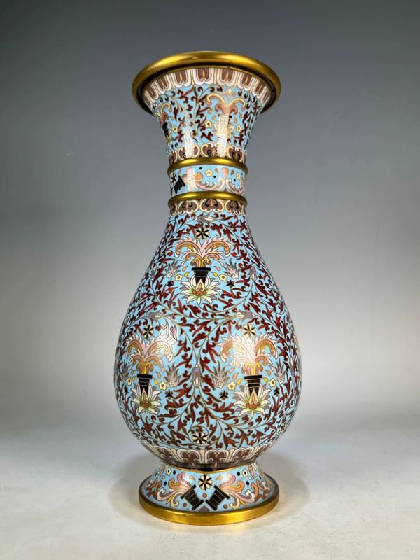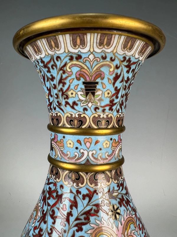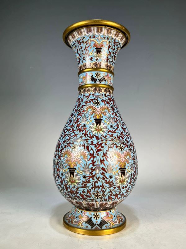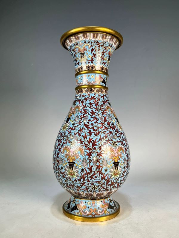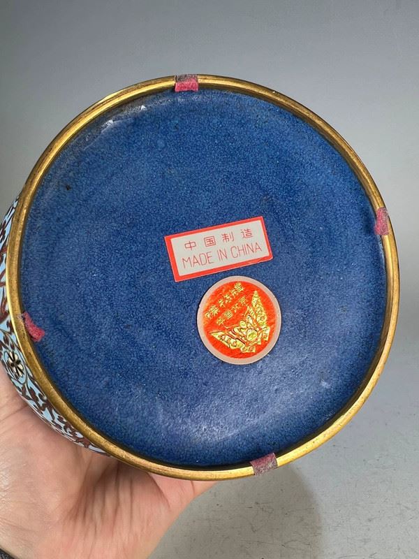 This is an exquisite cloisonné floral vase, crafted using traditional copper-based enamel techniques. The body of the vase is adorned with intricate floral patterns, and the combination of blue and gold creates a refined, layered effect. The golden borders at the top and bottom enhance its luxurious appearance, making it a piece full of Eastern aesthetic charm.