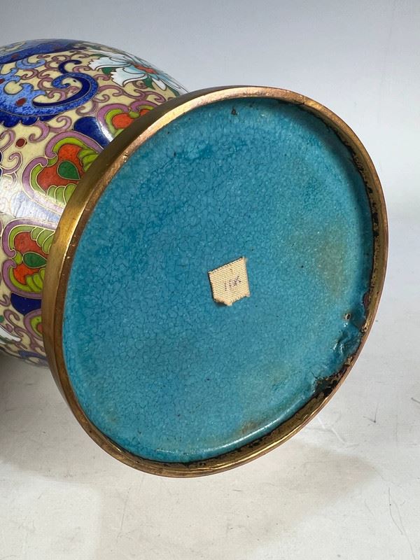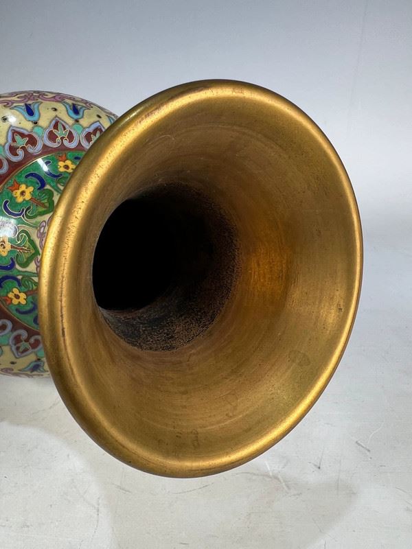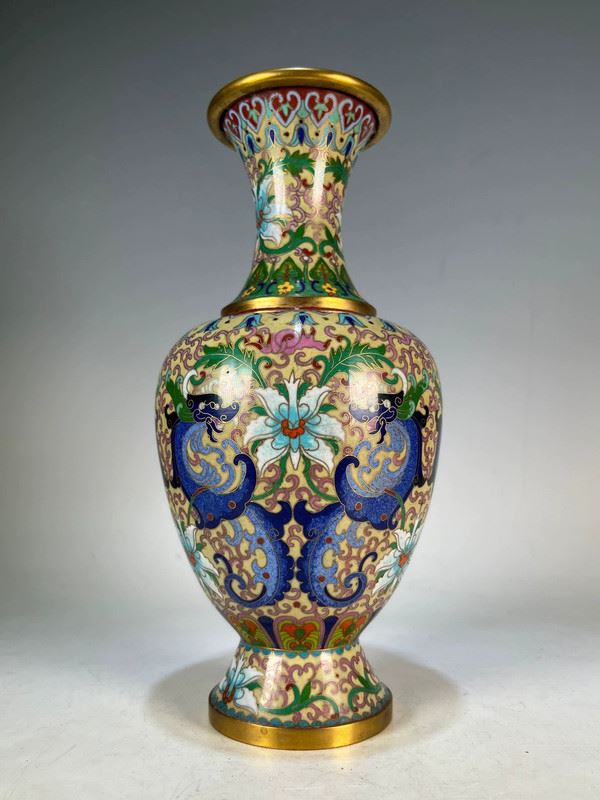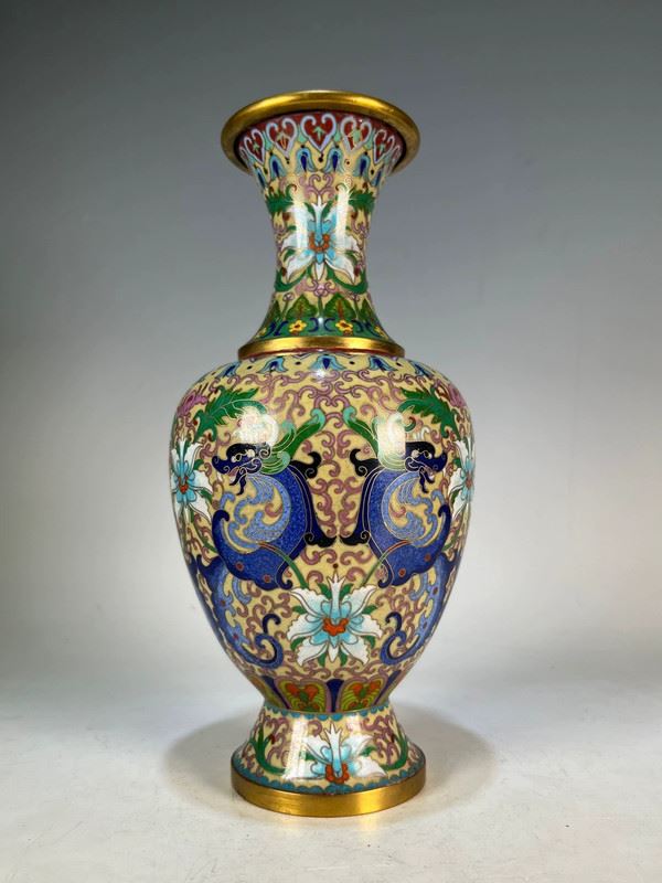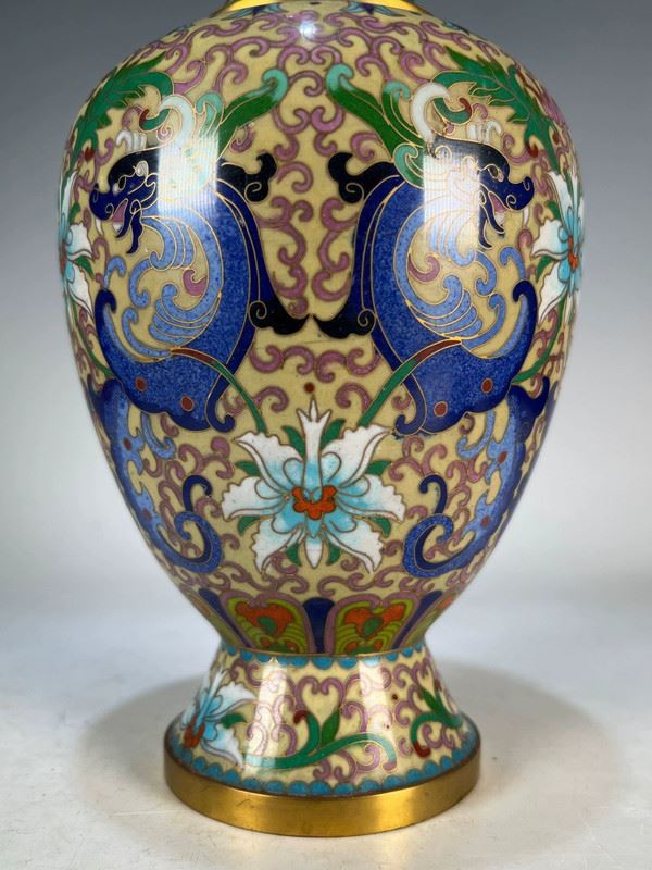 This cloisonné vase, featuring floral and dragon motifs, captivates with its exquisite craftsmanship and unique design. The body of the vase is adorned with vivid dragon patterns intertwined with blooming flowers, creating a striking contrast that symbolizes strength and prosperity. The vibrant blues and greens of the vase, complemented by golden and white flowers, offer a rich visual appeal. The intricate details and delicate craftsmanship highlight the essence of traditional Chinese cloisonné artistry.