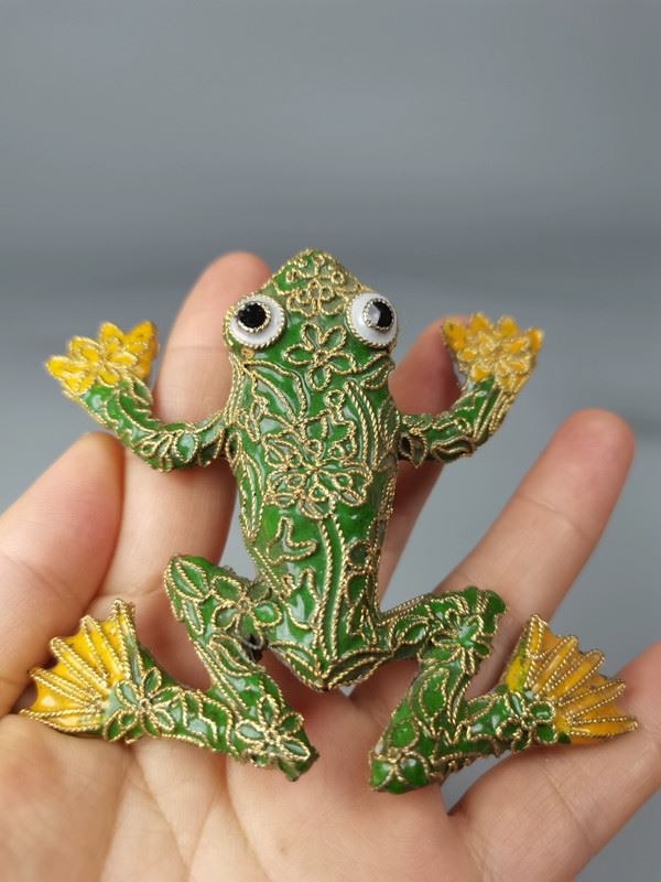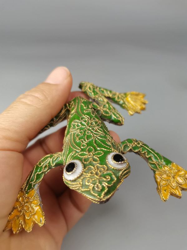This decorative piece features exquisite cloisonné craftsmanship, with delicate golden threads outlining the frog's shape. The green body and yellow floral patterns on the feet complement each other beautifully, showcasing the charm of traditional craftsmanship. The frog's eyes, made with white and black beads, give it a lively expression. The overall design combines artistic elegance with a sense of liveliness, making it a unique piece of art.